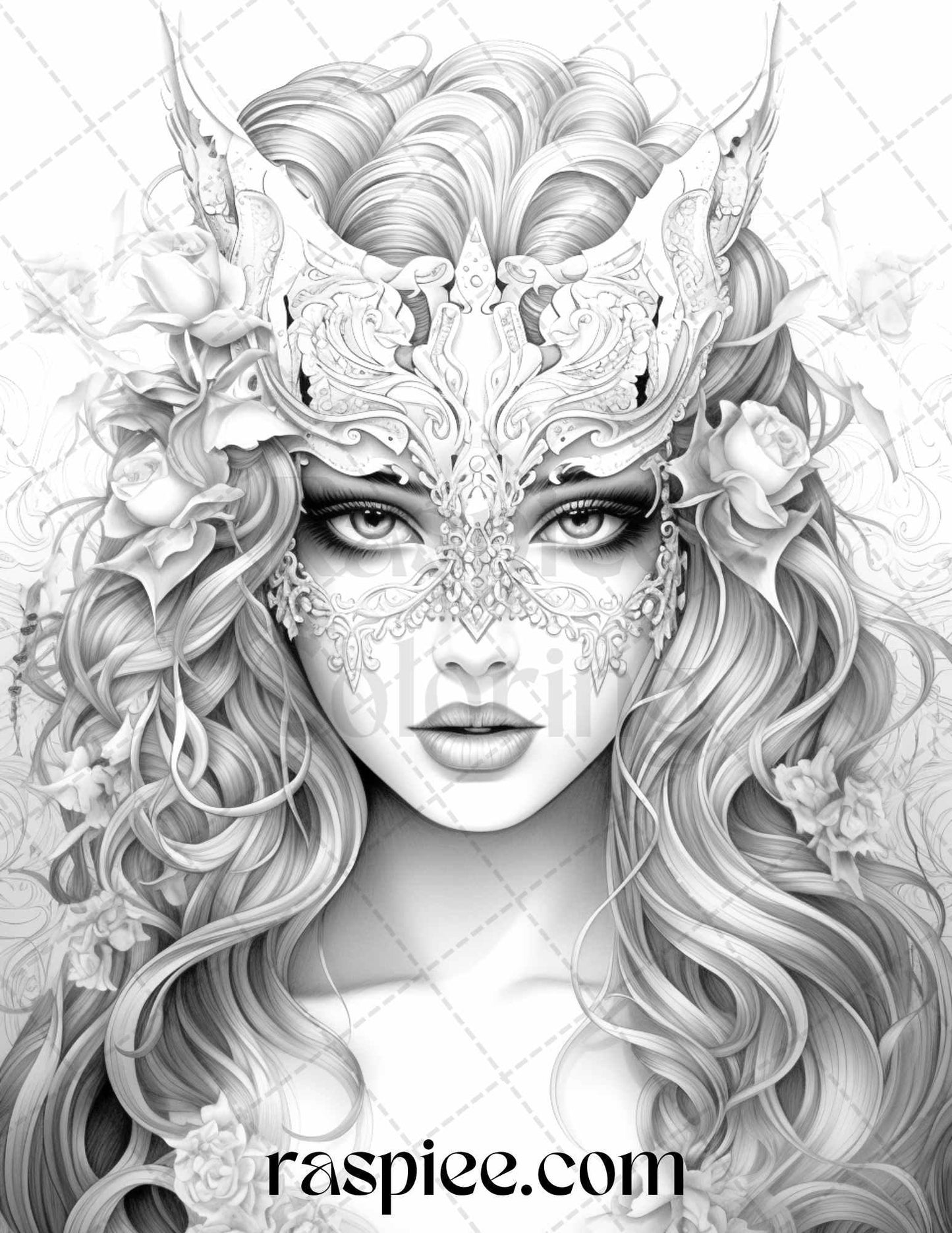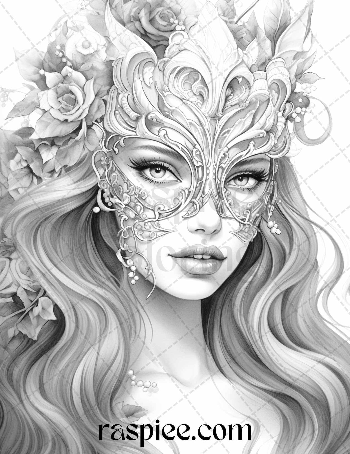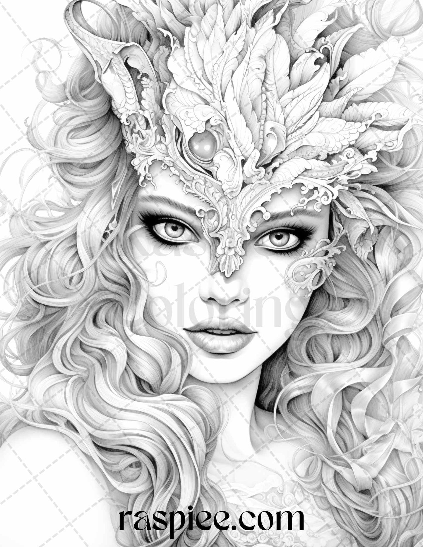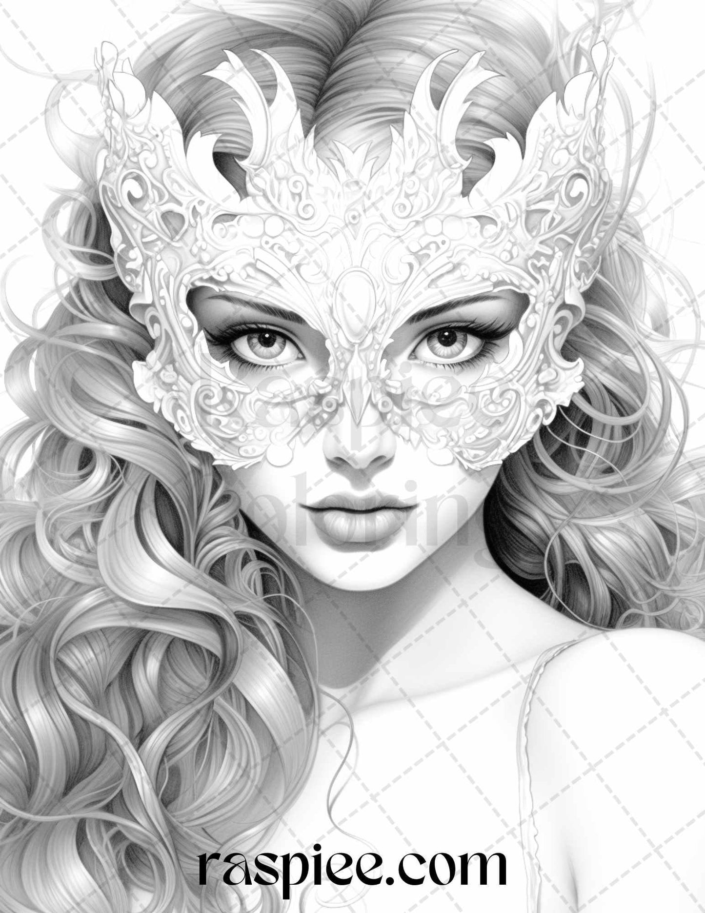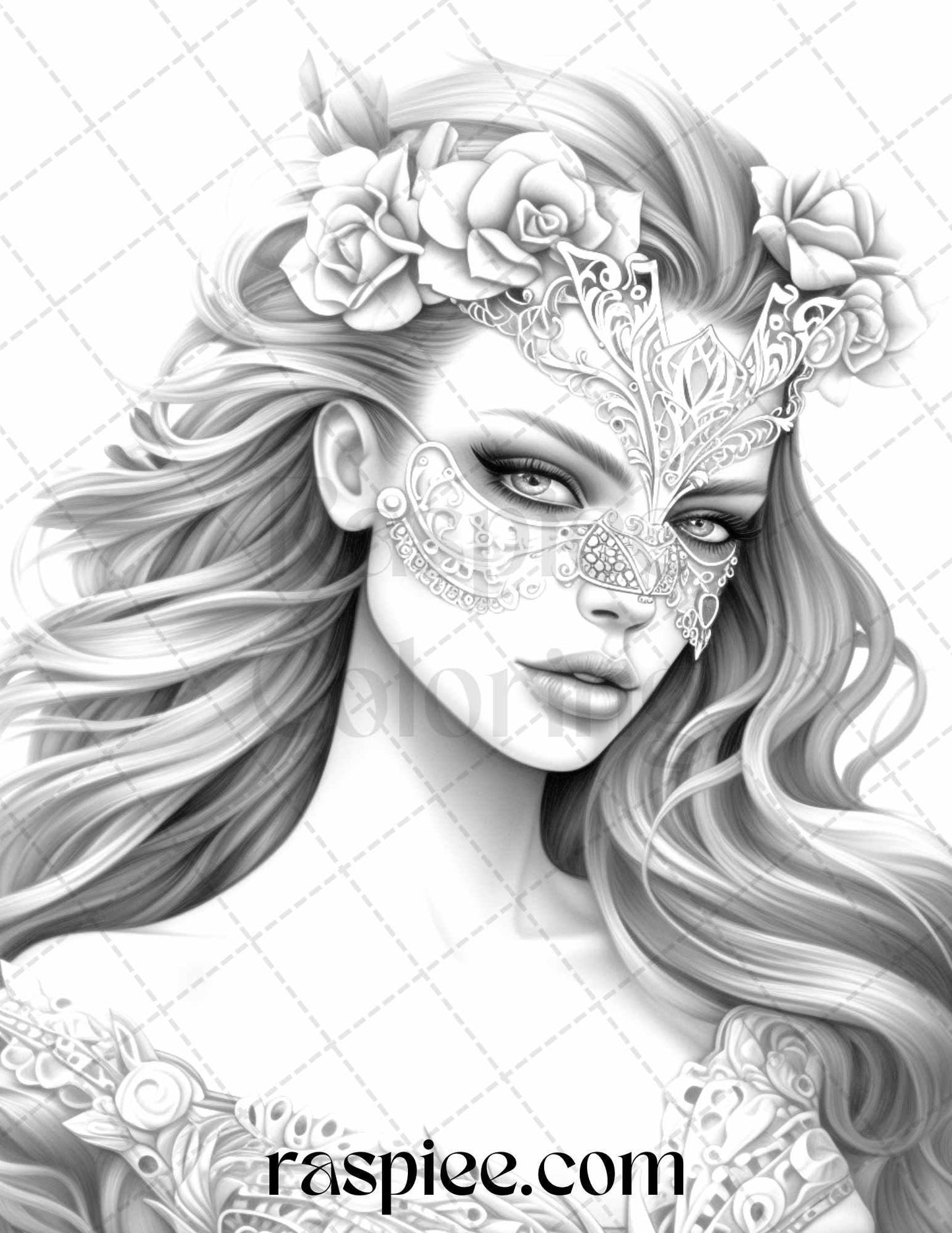 40 Masquerade Girls Grayscale Coloring Pages Printable for Adults, PDF File Instant Download