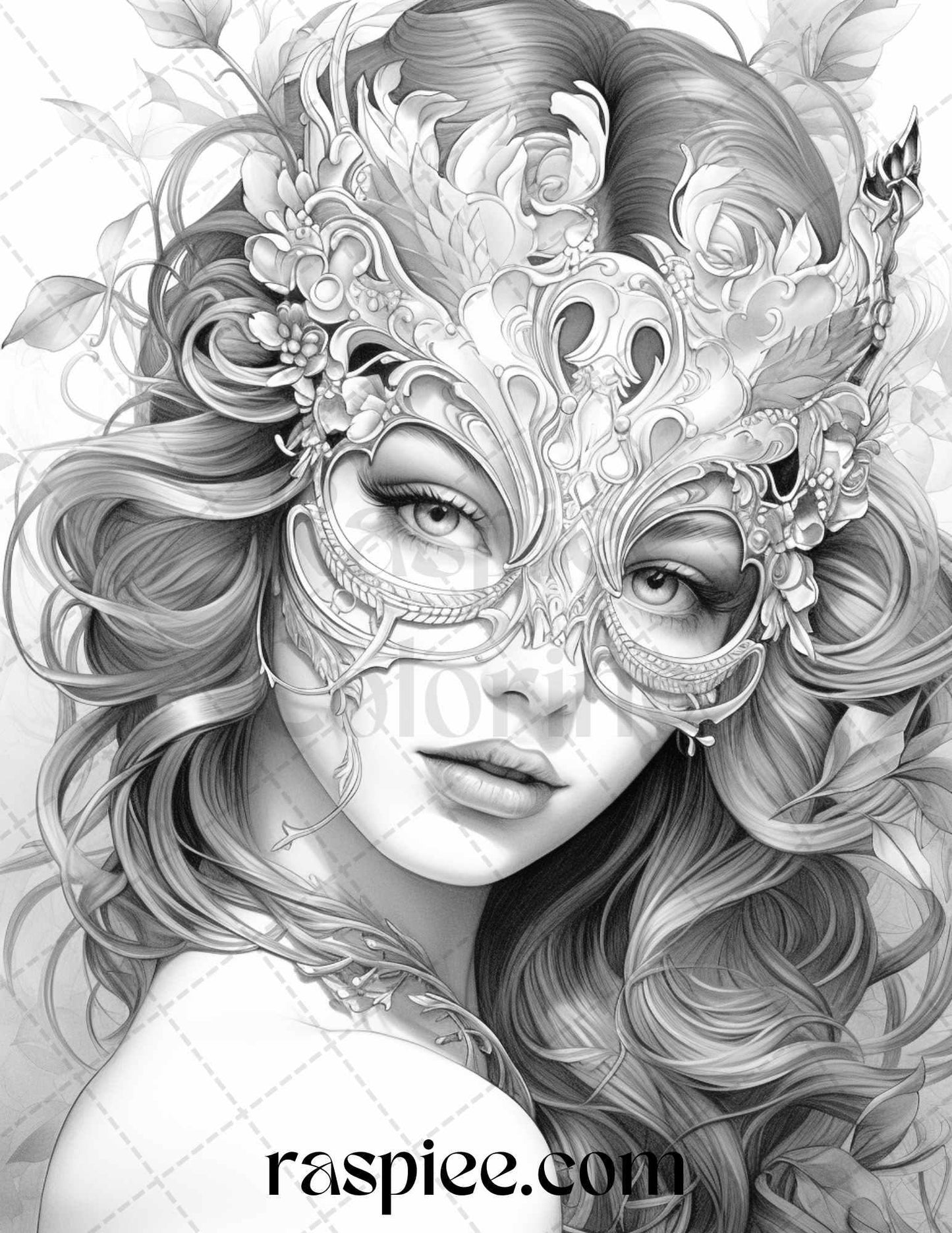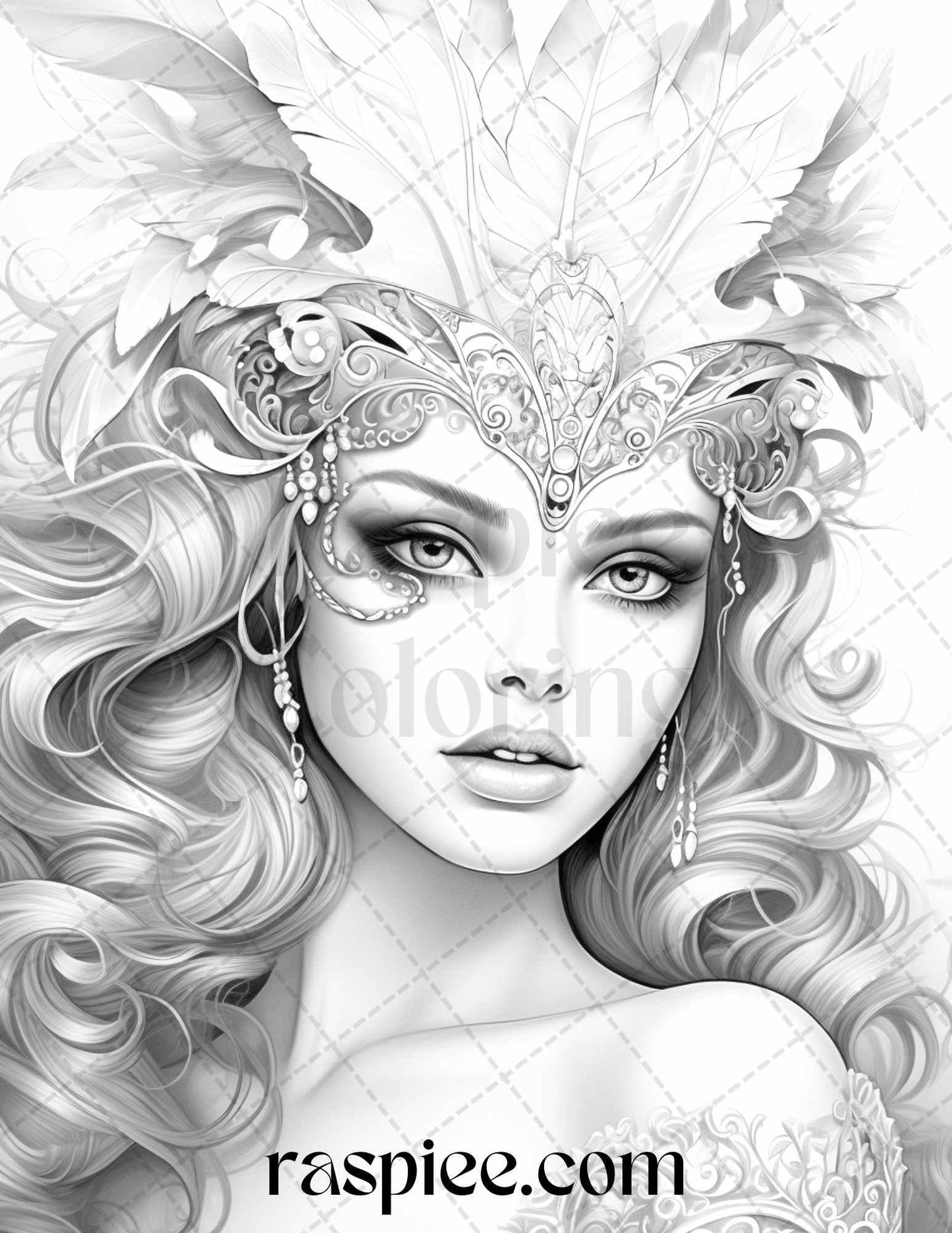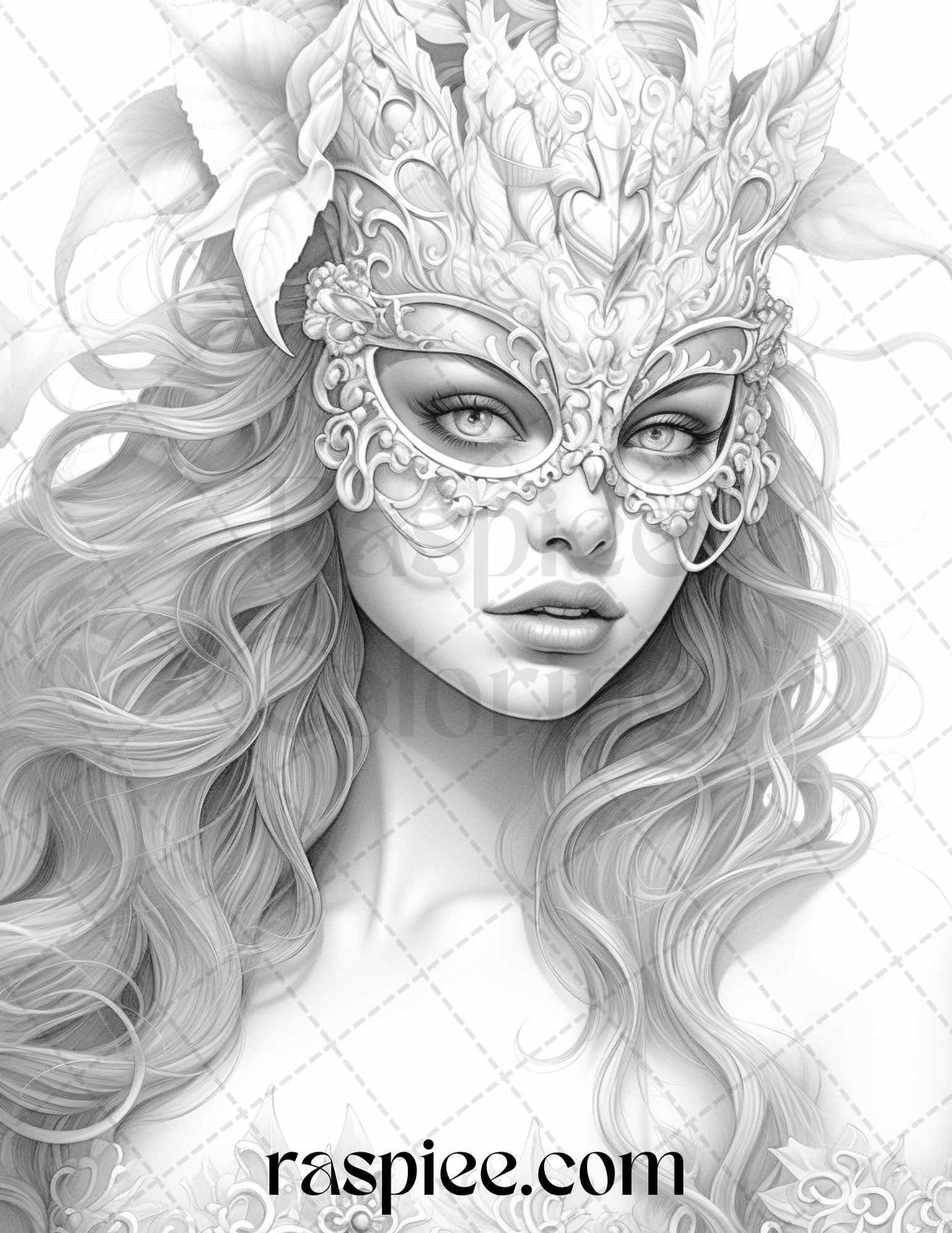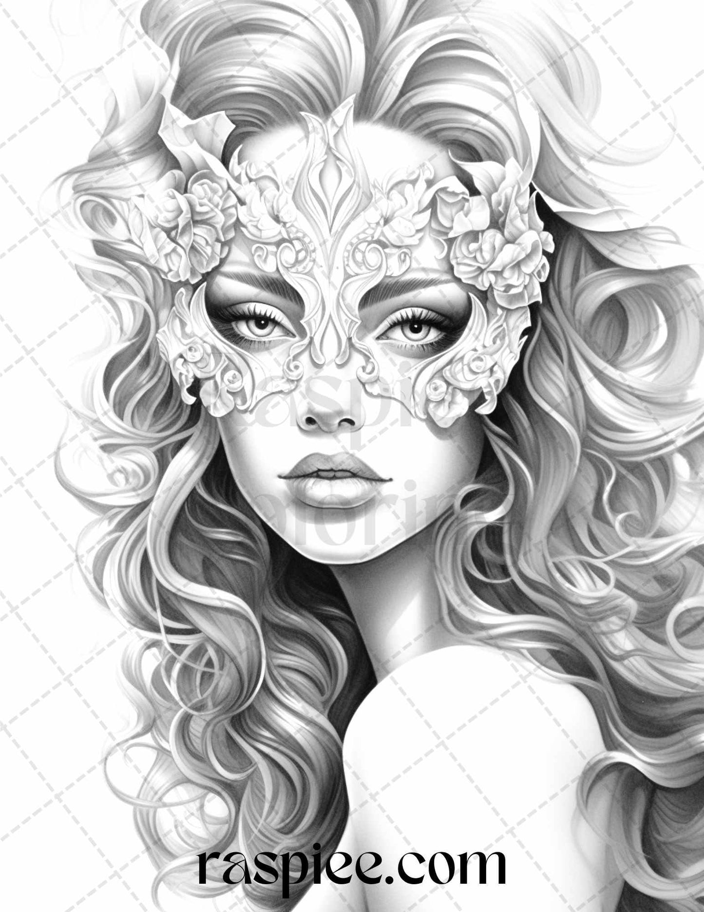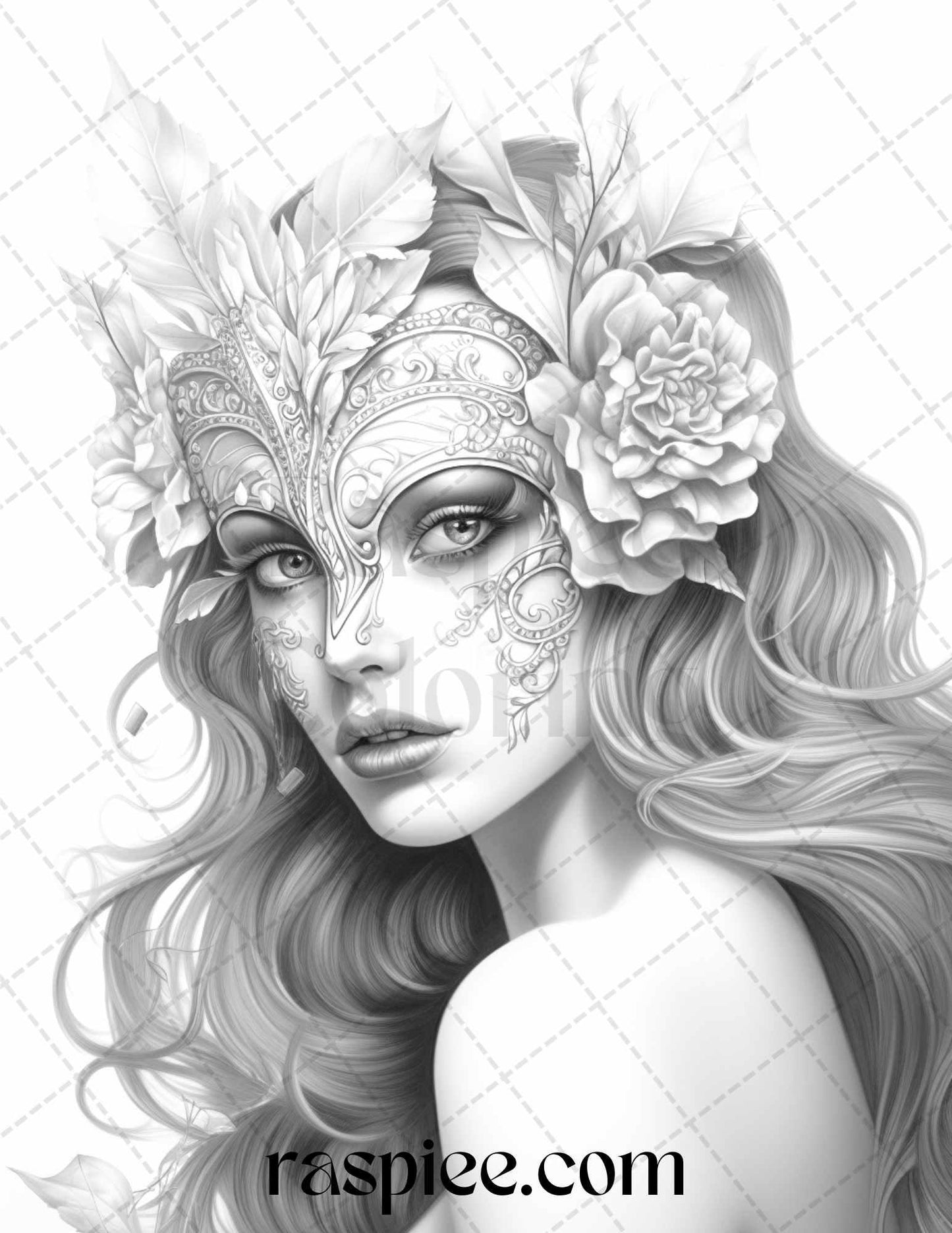 40 Masquerade Girls Grayscale Coloring Pages Printable for Adults, PDF File Instant Download