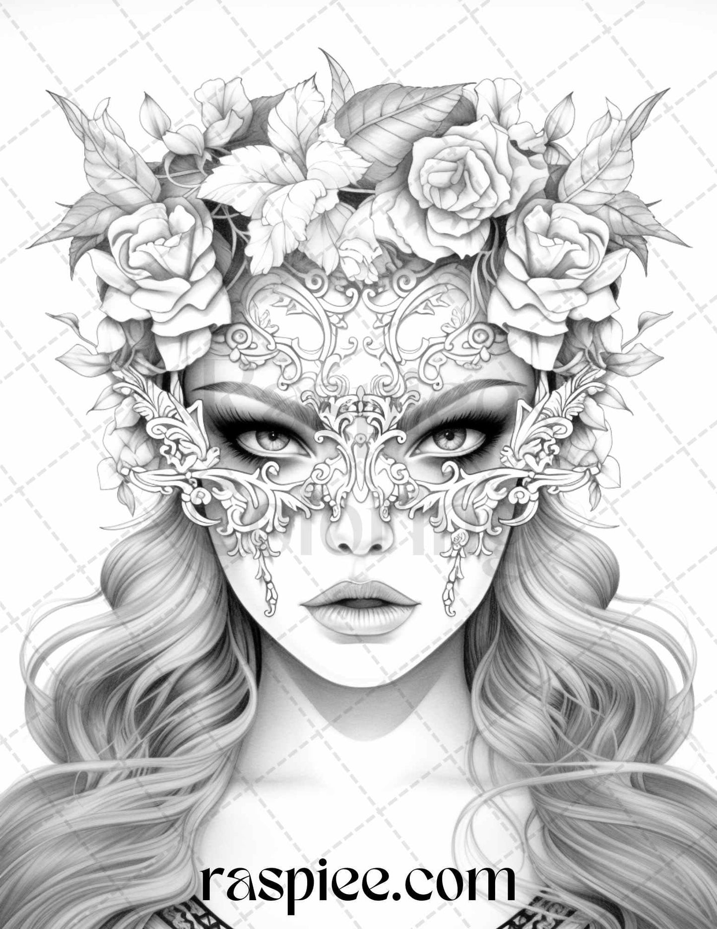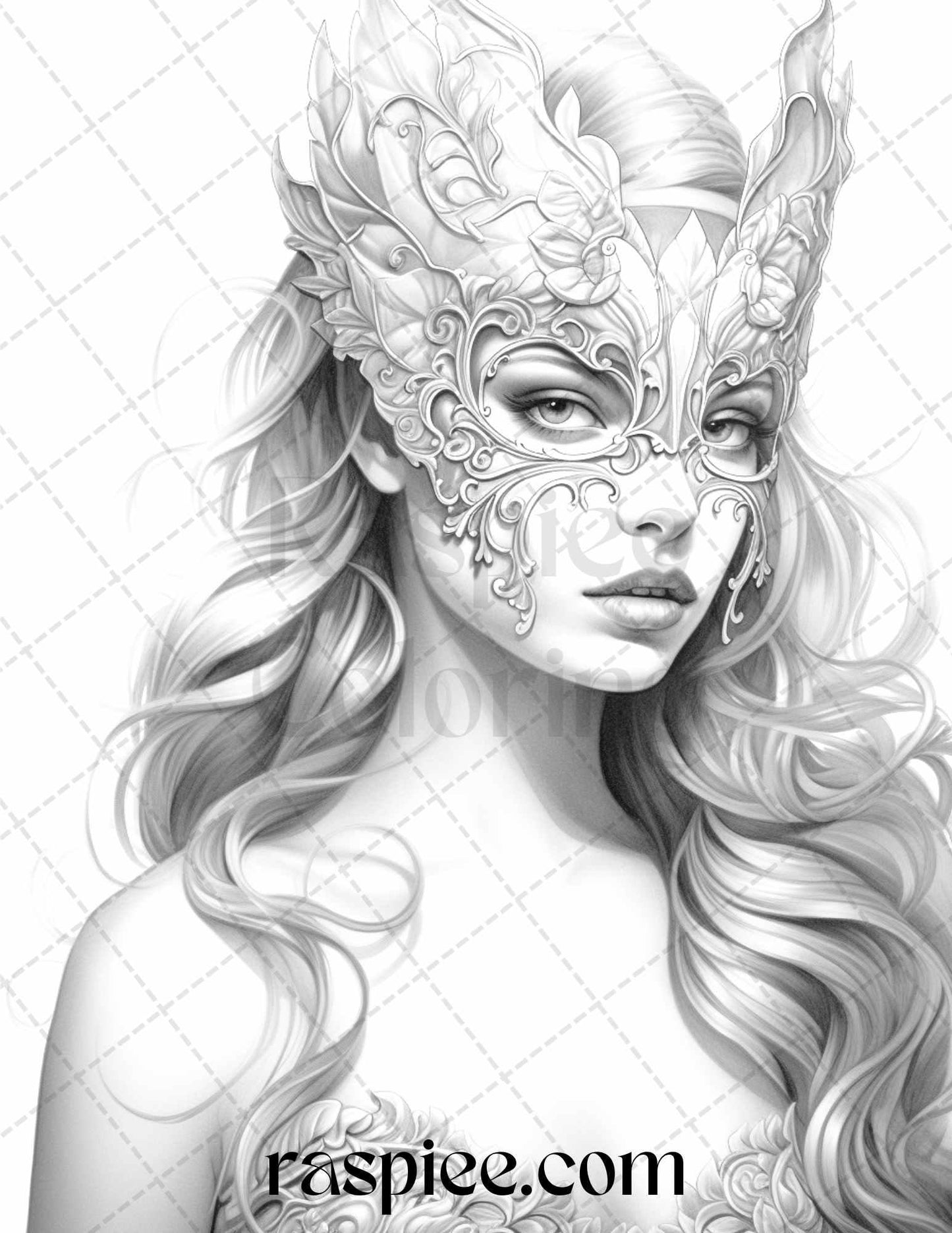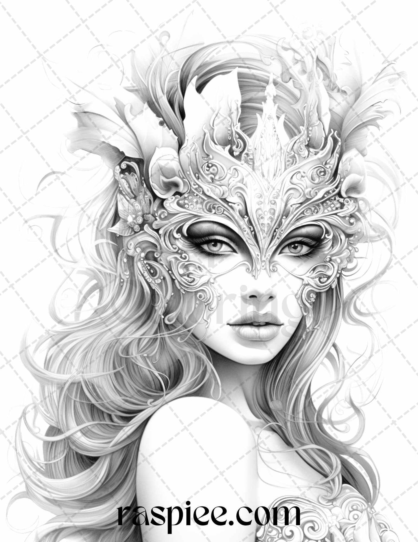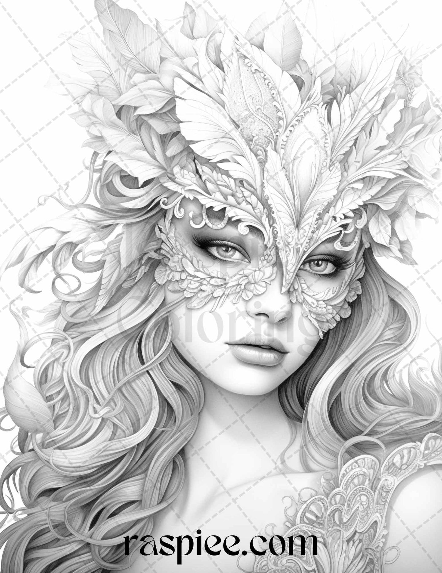 40 Masquerade Girls Grayscale Coloring Pages Printable for Adults, PDF File Instant Download
