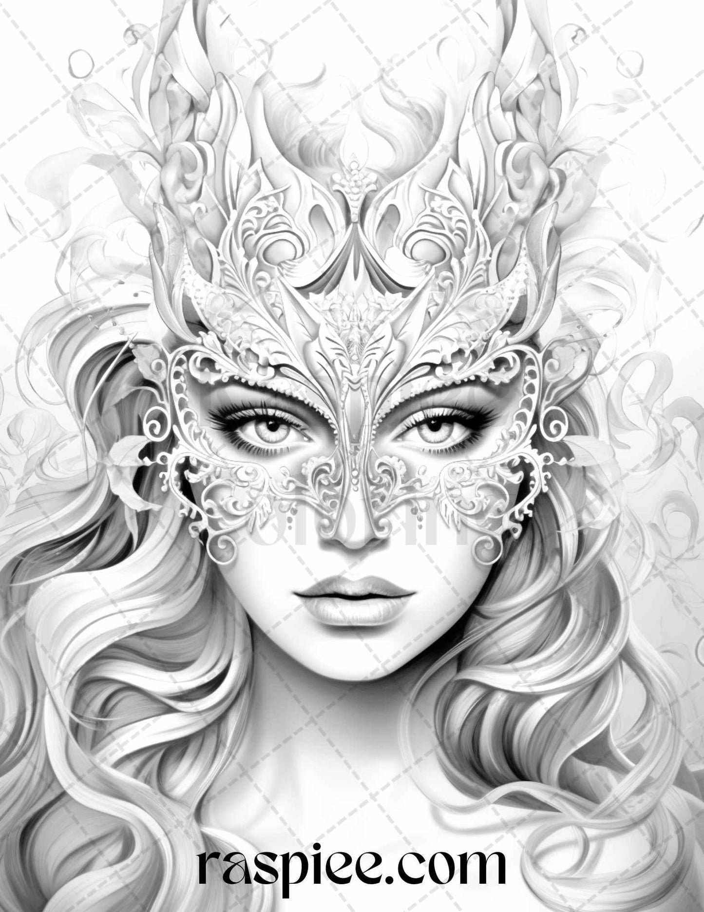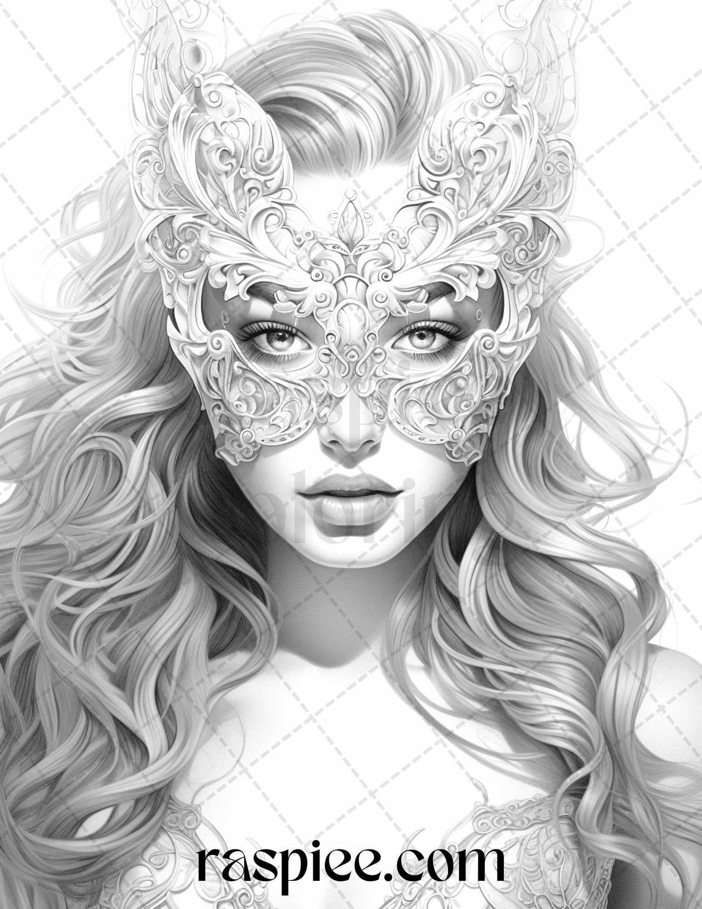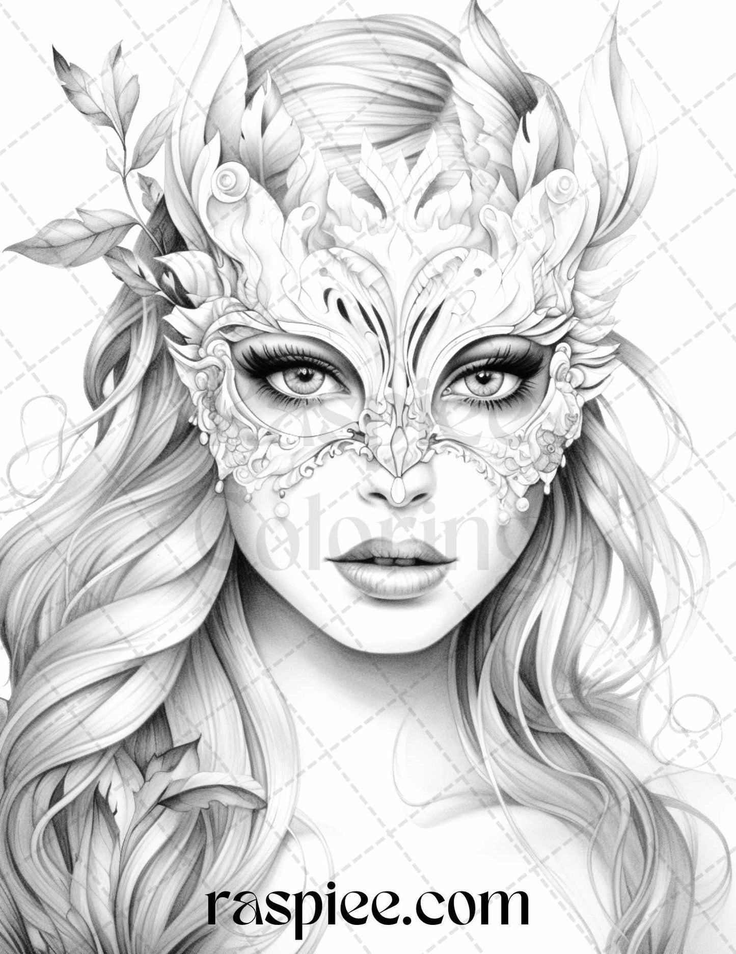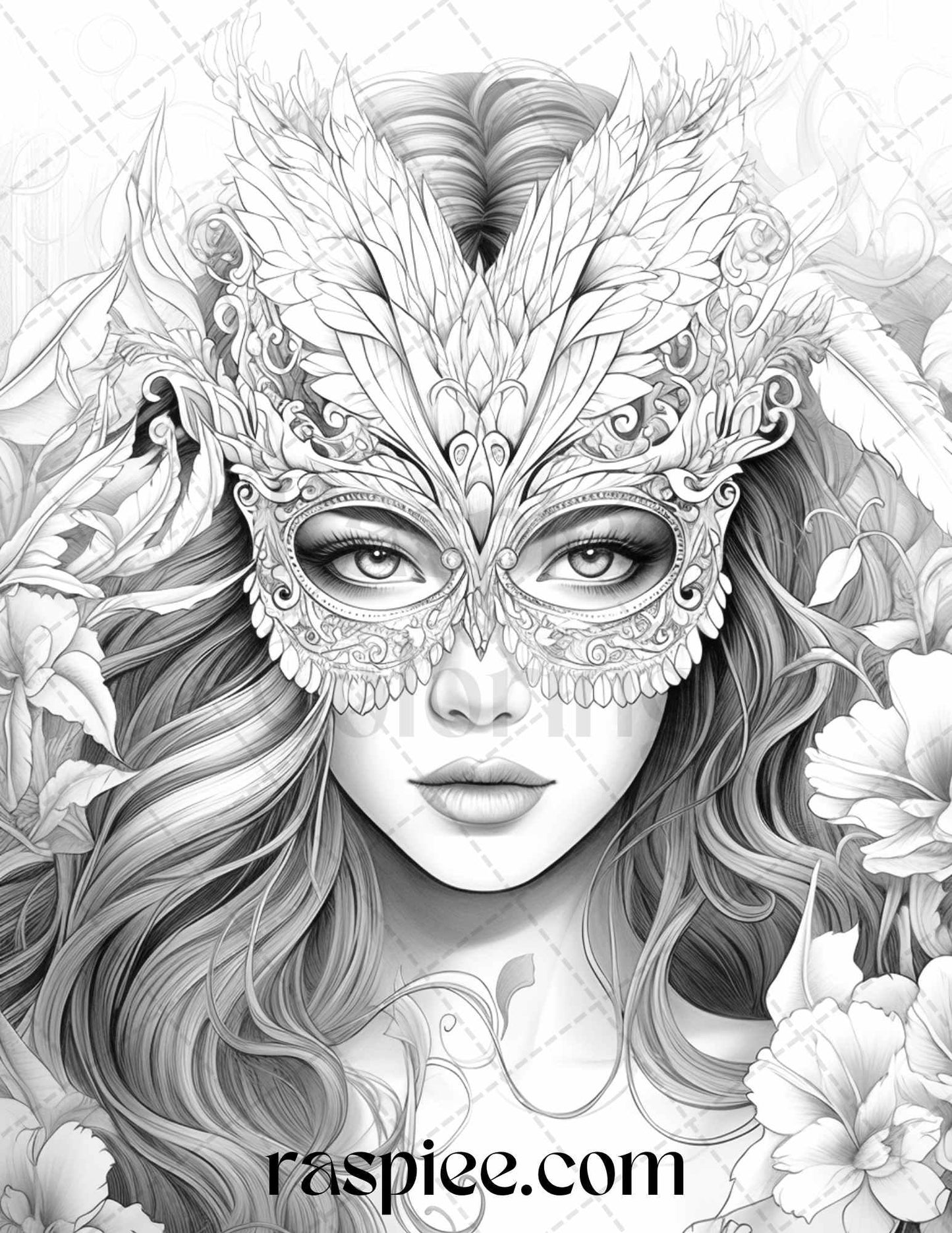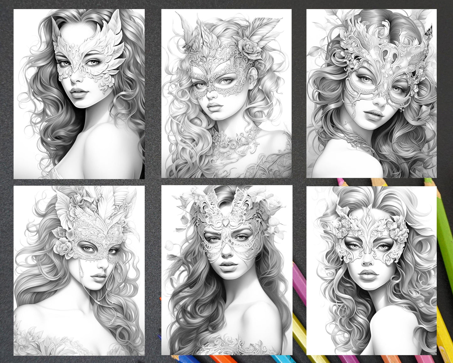 40 Masquerade Girls Grayscale Coloring Pages Printable for Adults, PDF File Instant Download