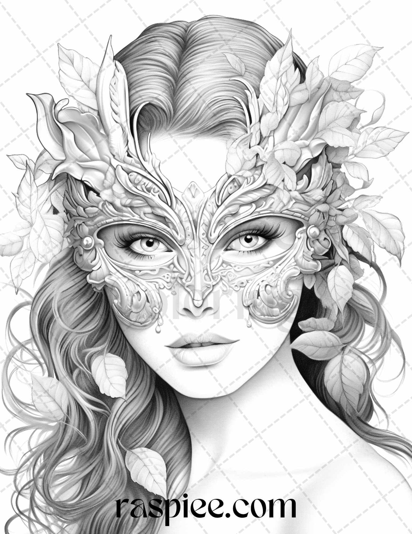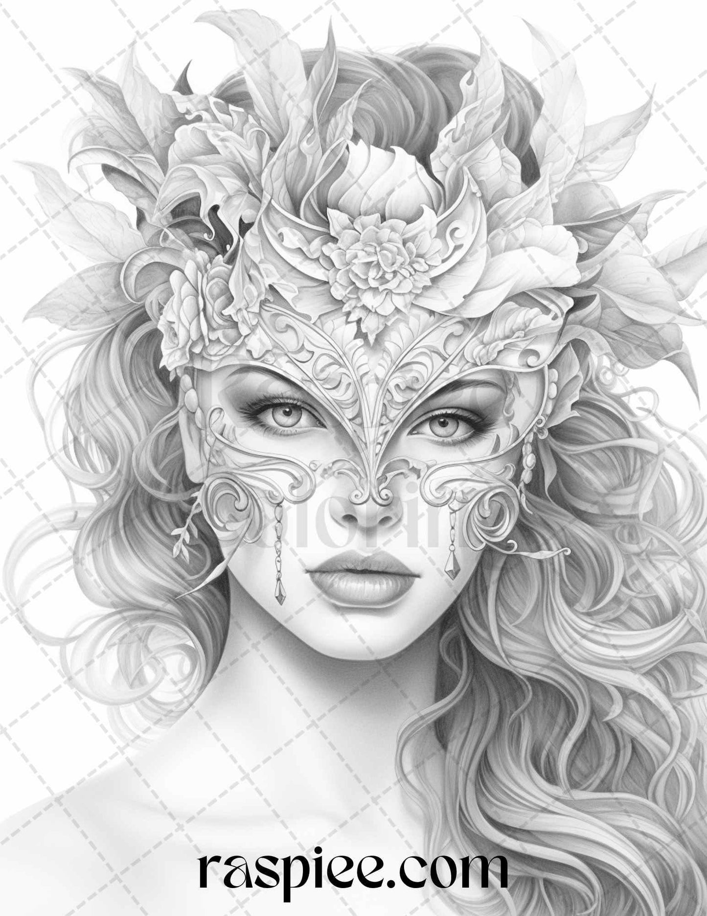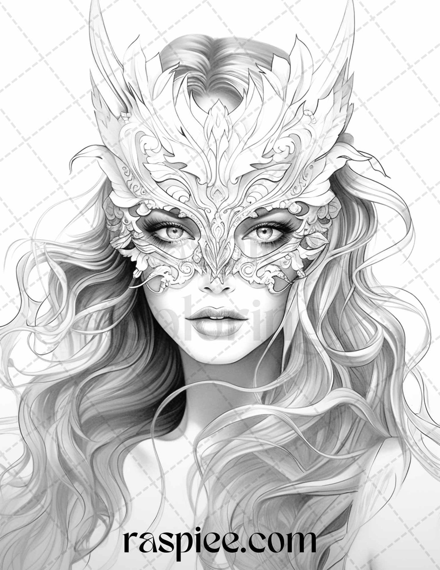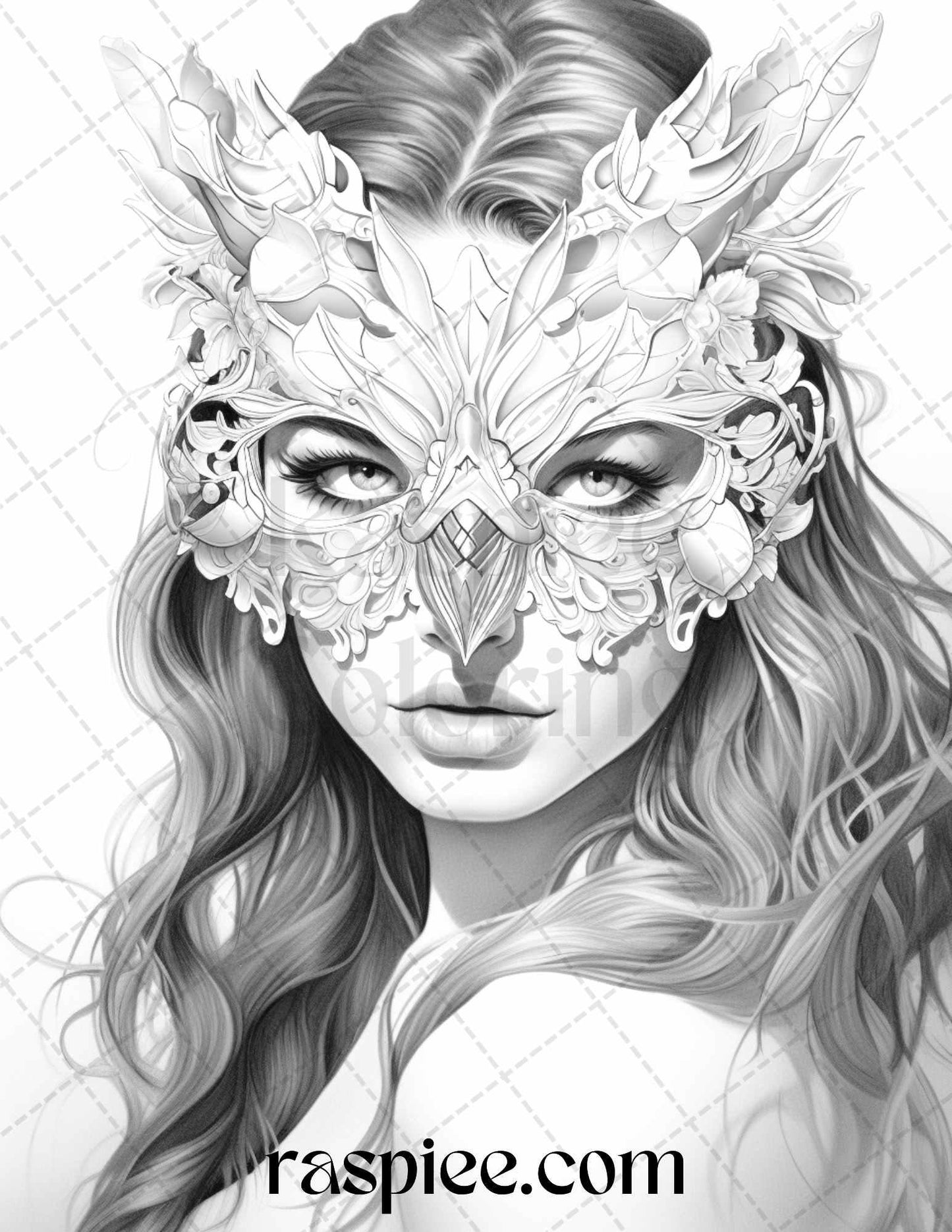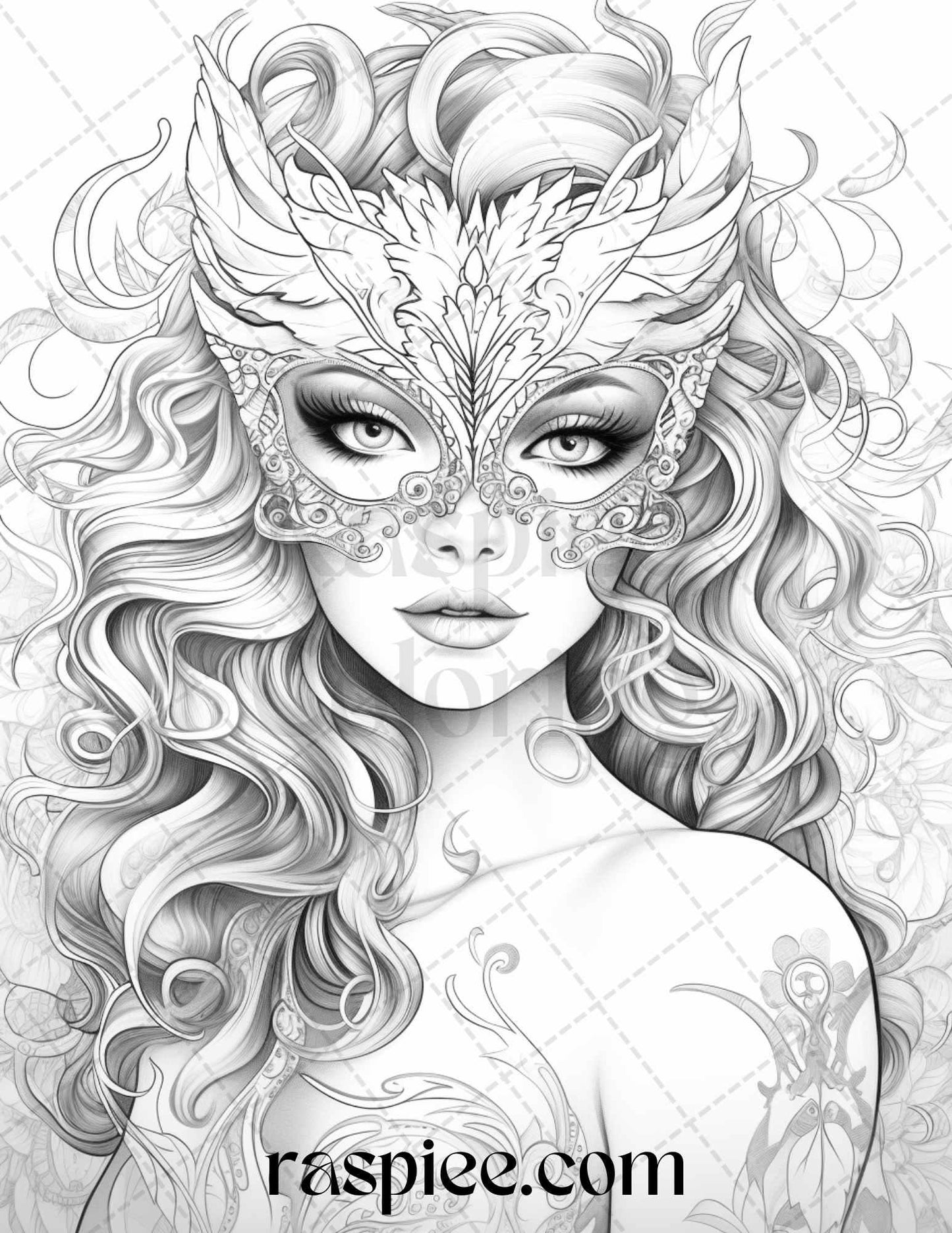 40 Masquerade Girls Grayscale Coloring Pages Printable for Adults, PDF File Instant Download