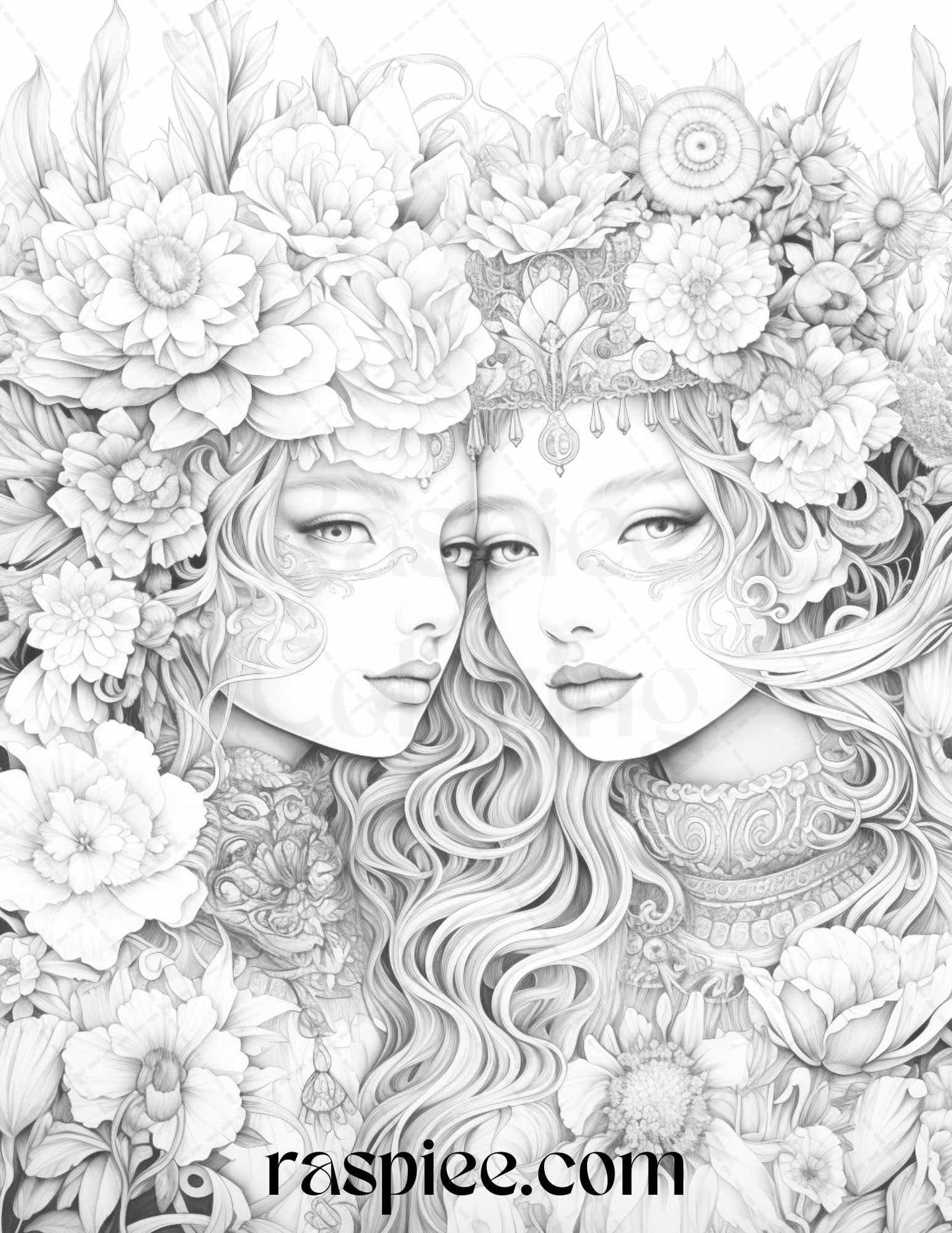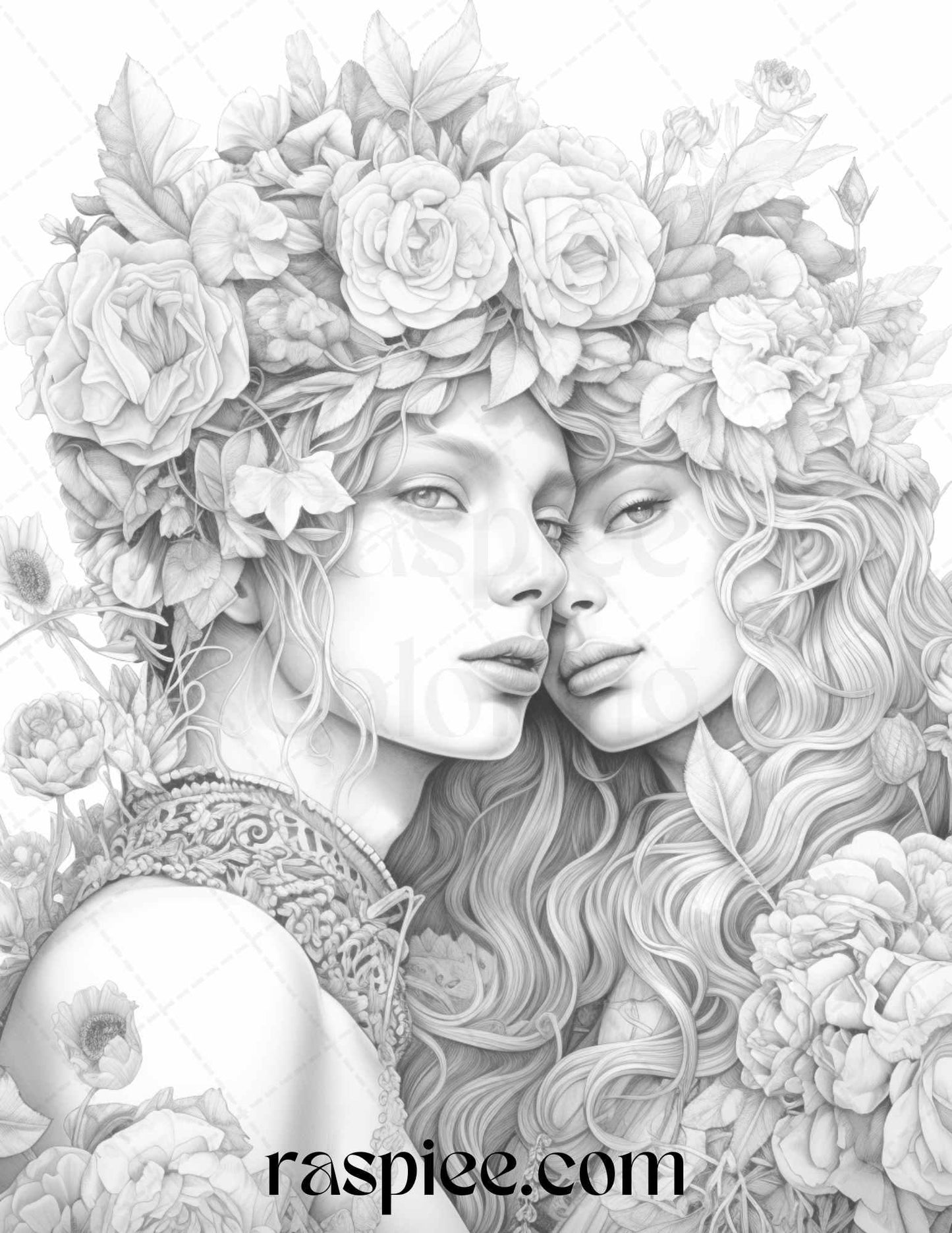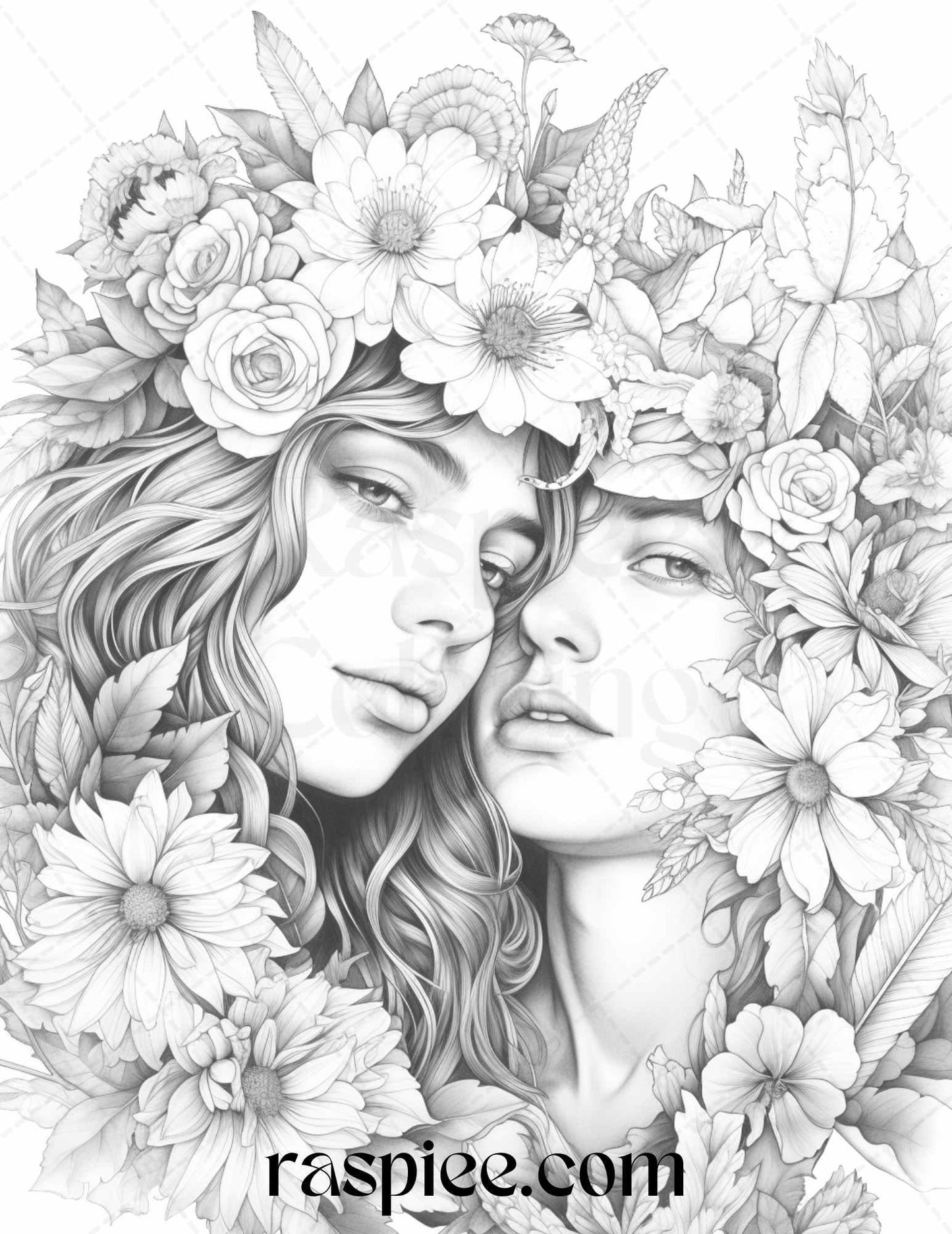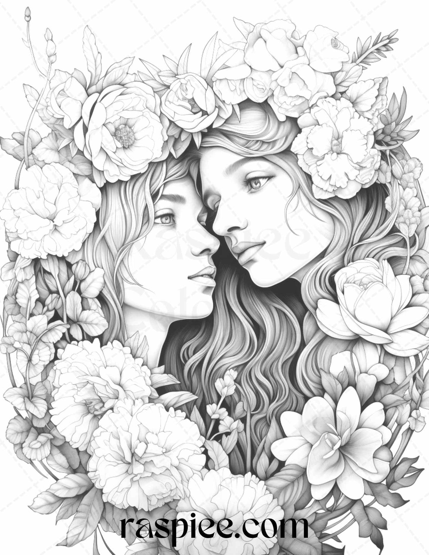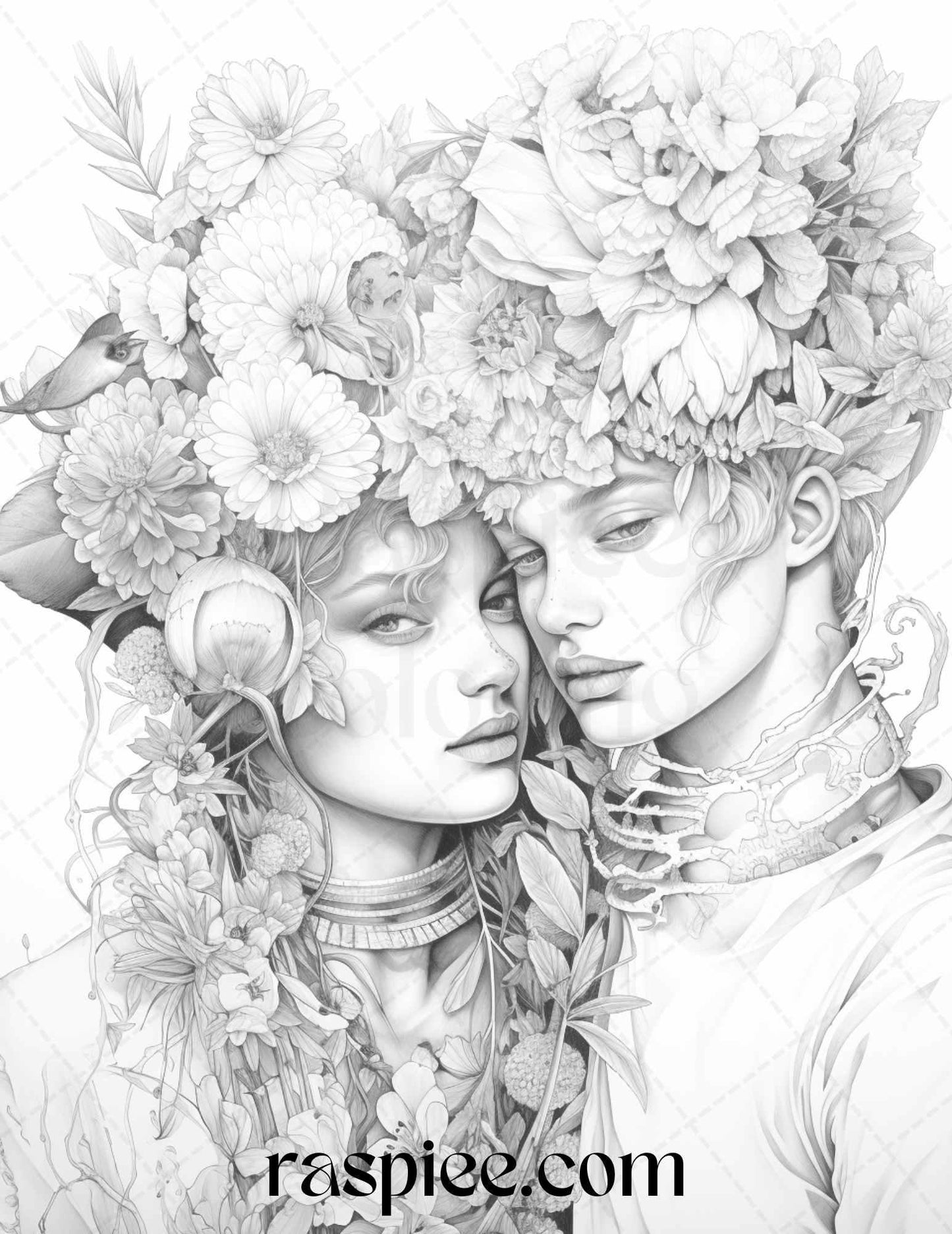 50 Romantic Couple Flowers Grayscale Coloring Pages Printable for Adults, PDF File Instant Download