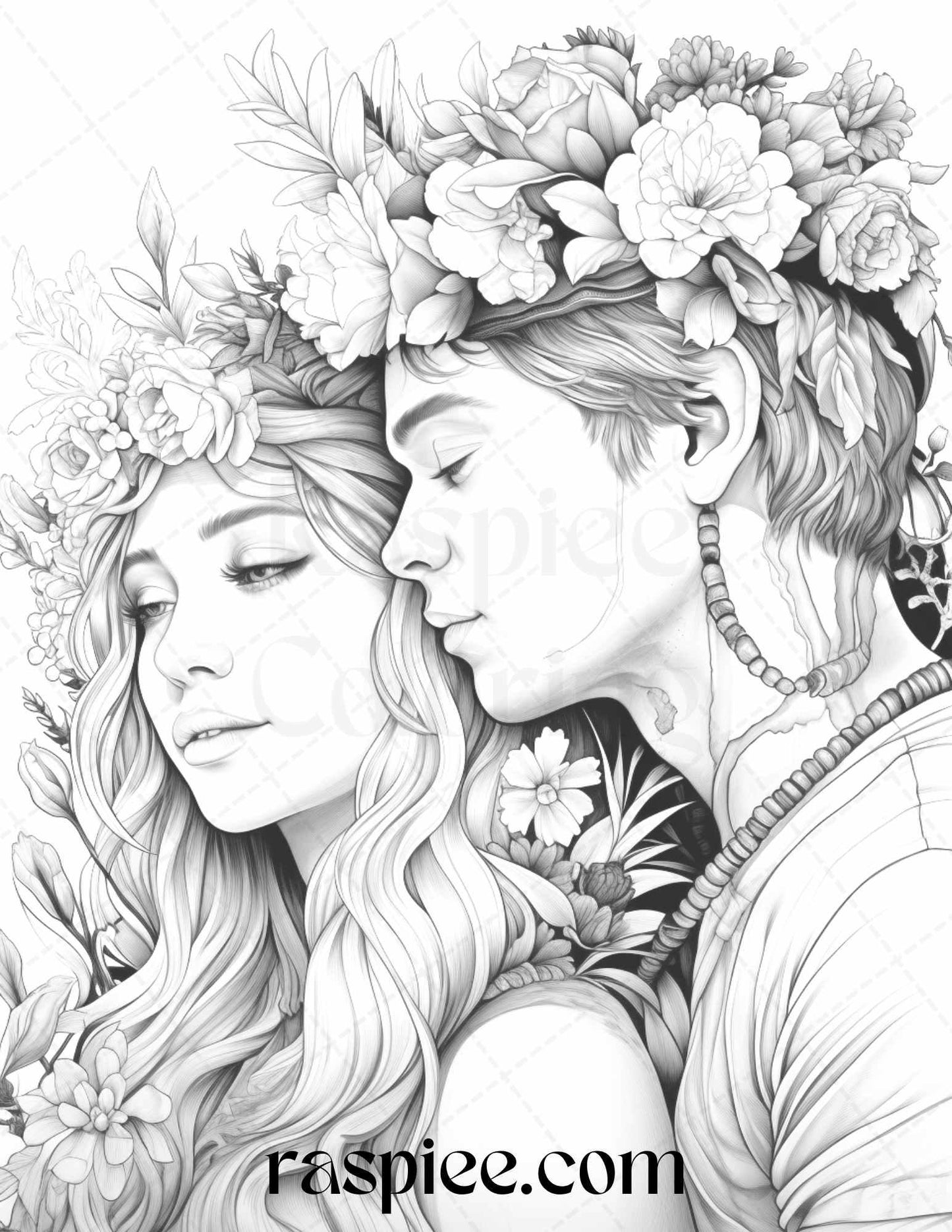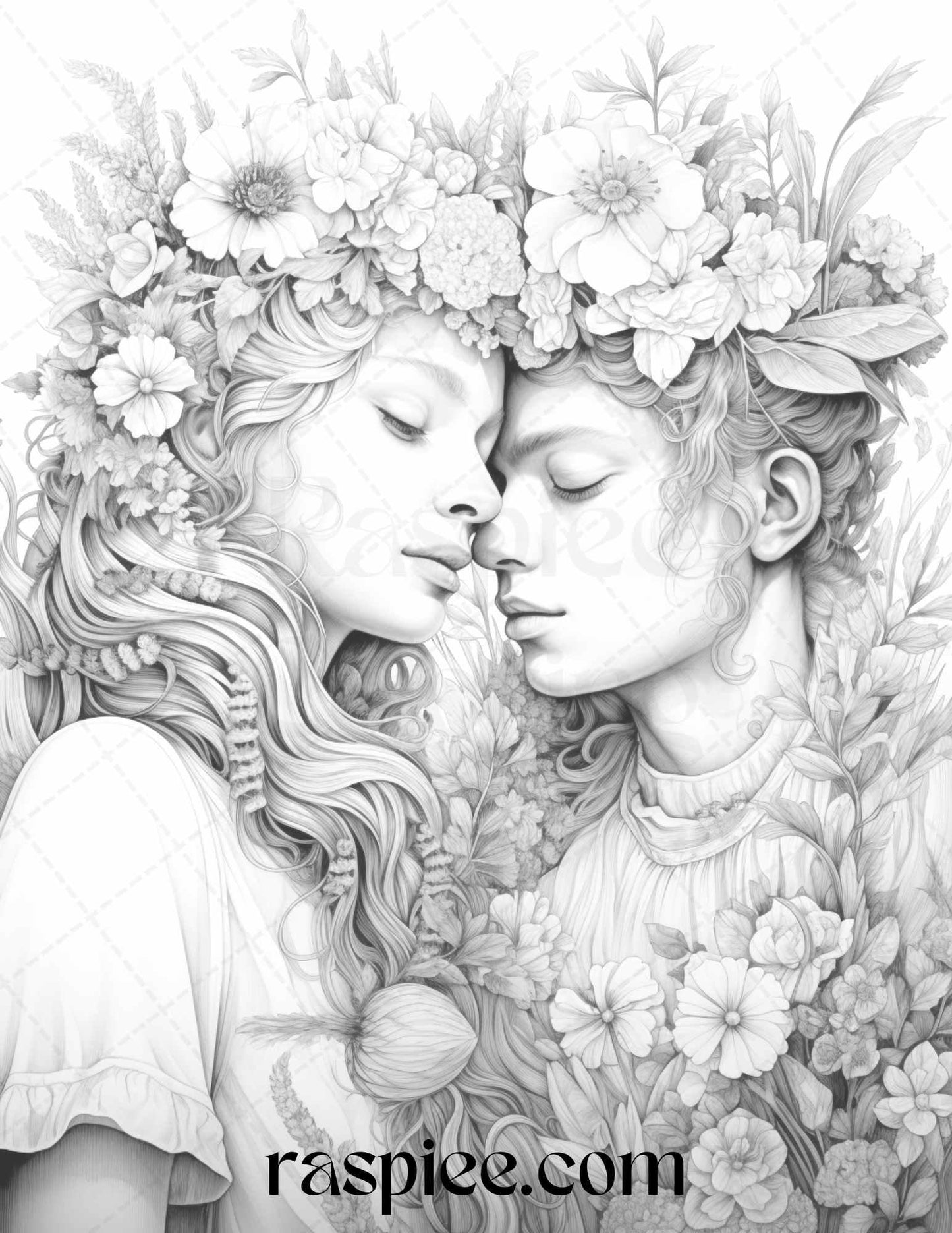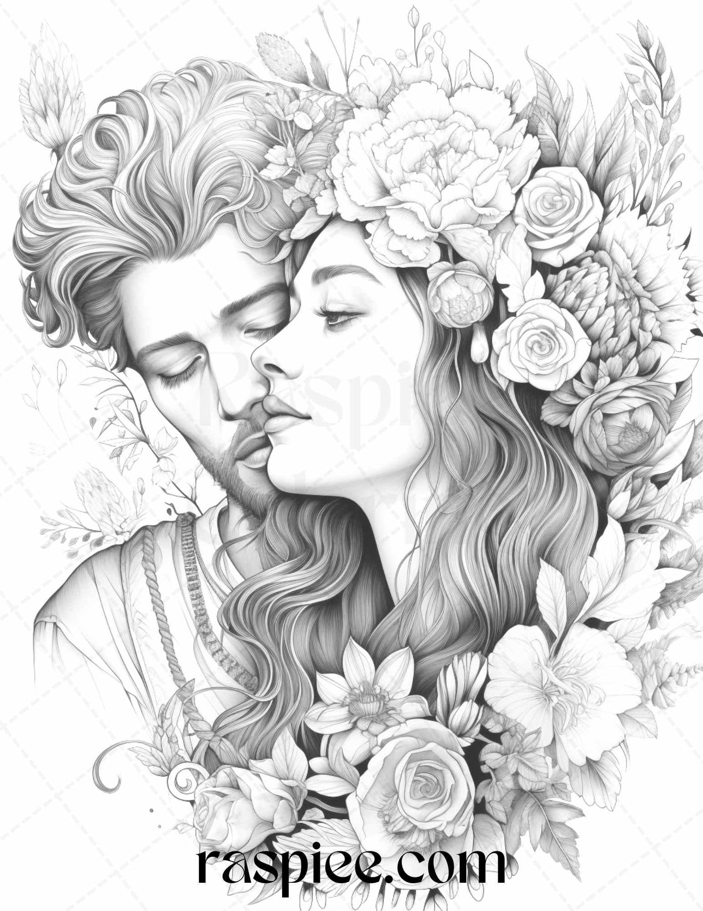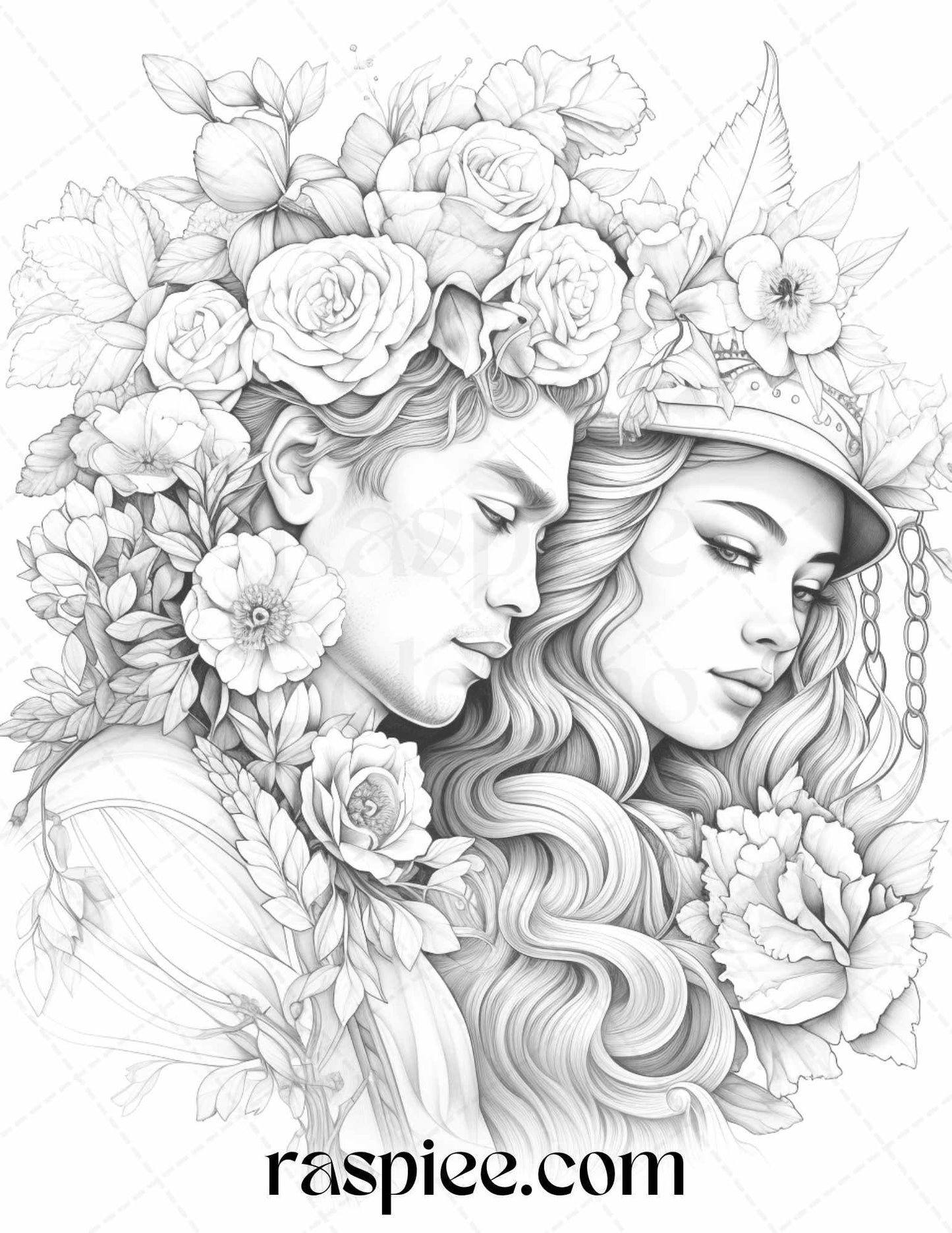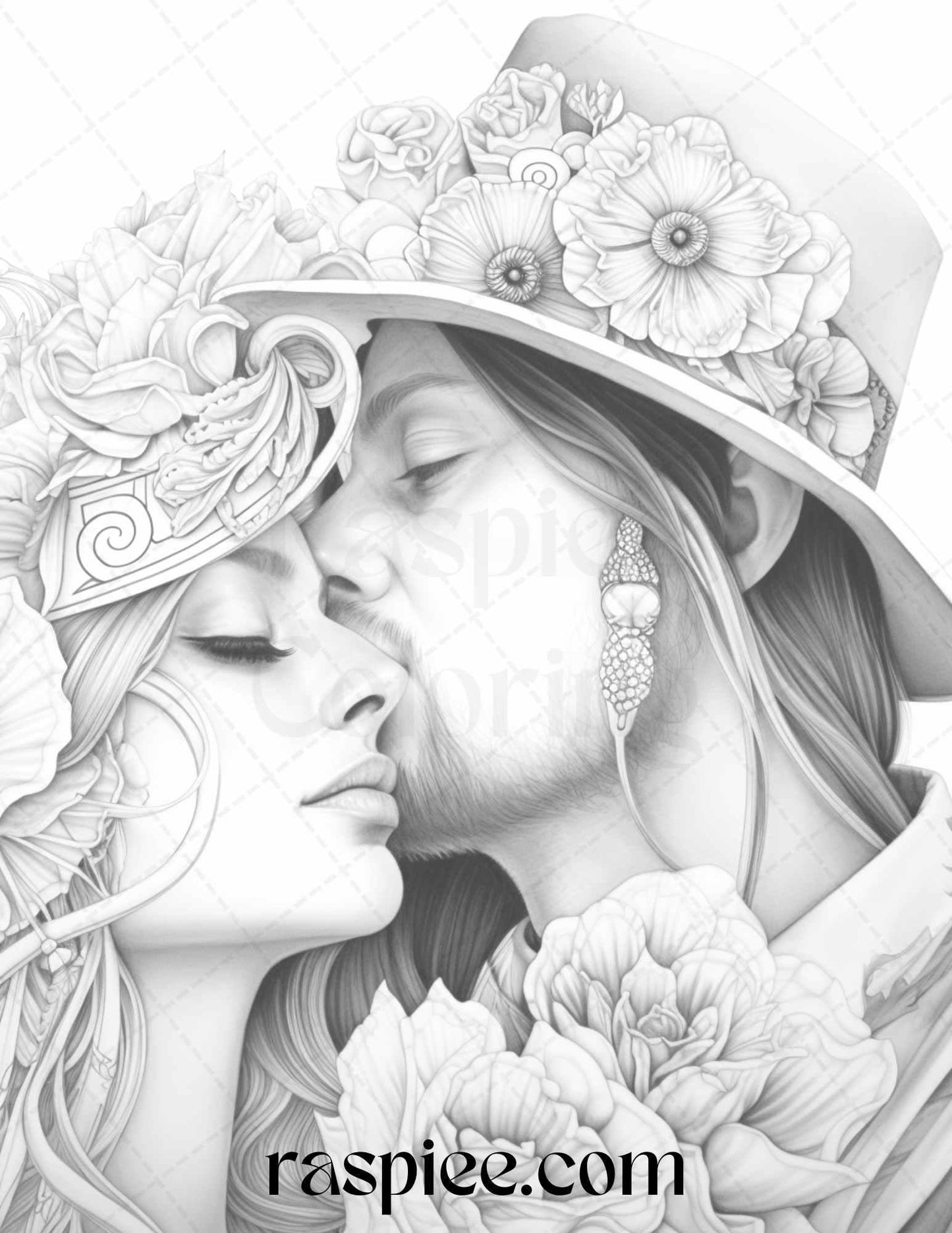 Our grayscale prints showcase intricate floral illustrations intertwined with romantic couples, evoking feelings of love and warmth. Whether you're an art enthusiast, need a thoughtful gift for a loved one, or simply wish to unwind, these coloring pages will captivate your heart and imagination.