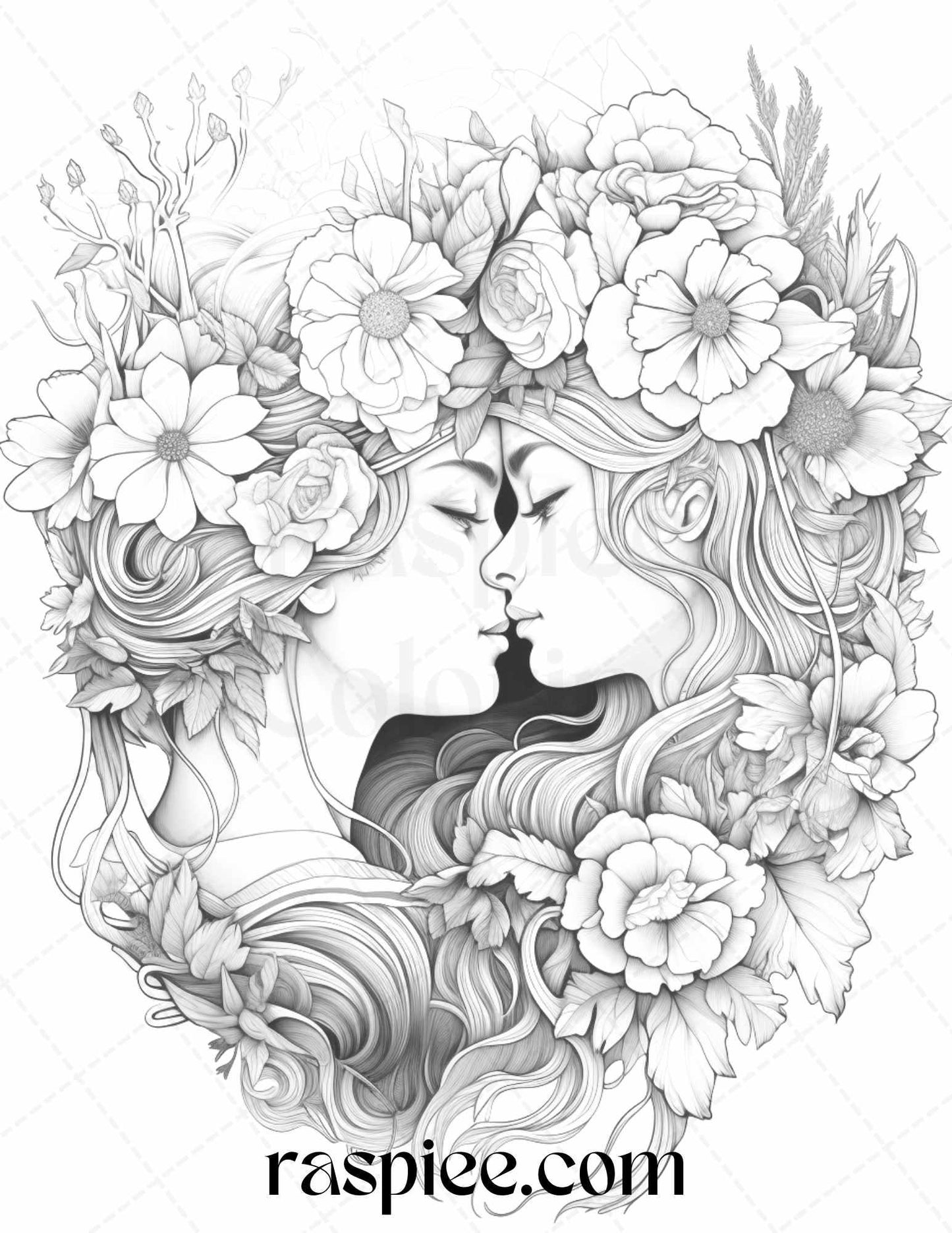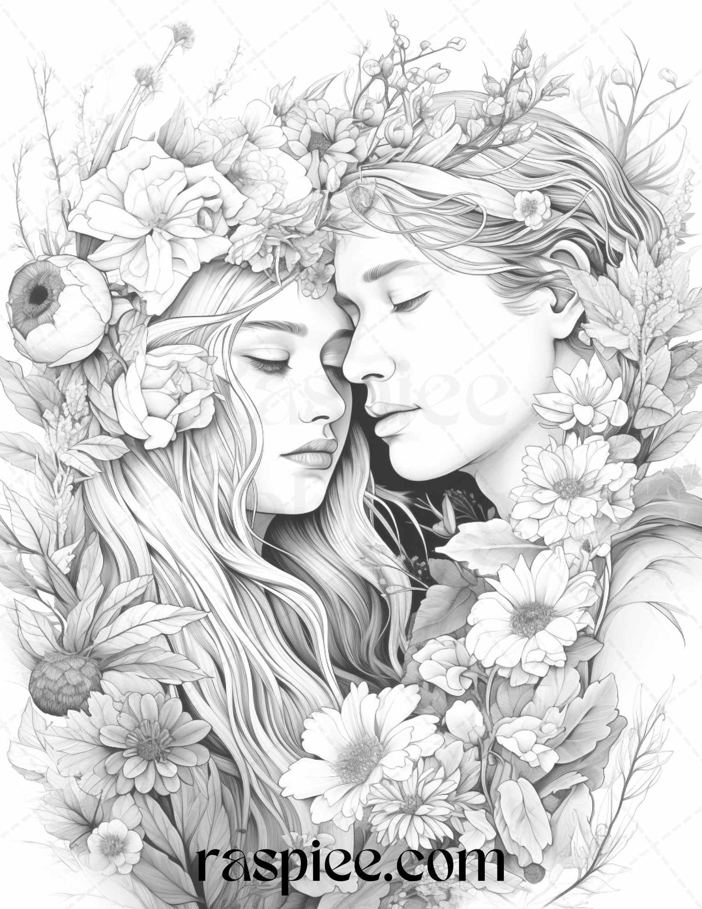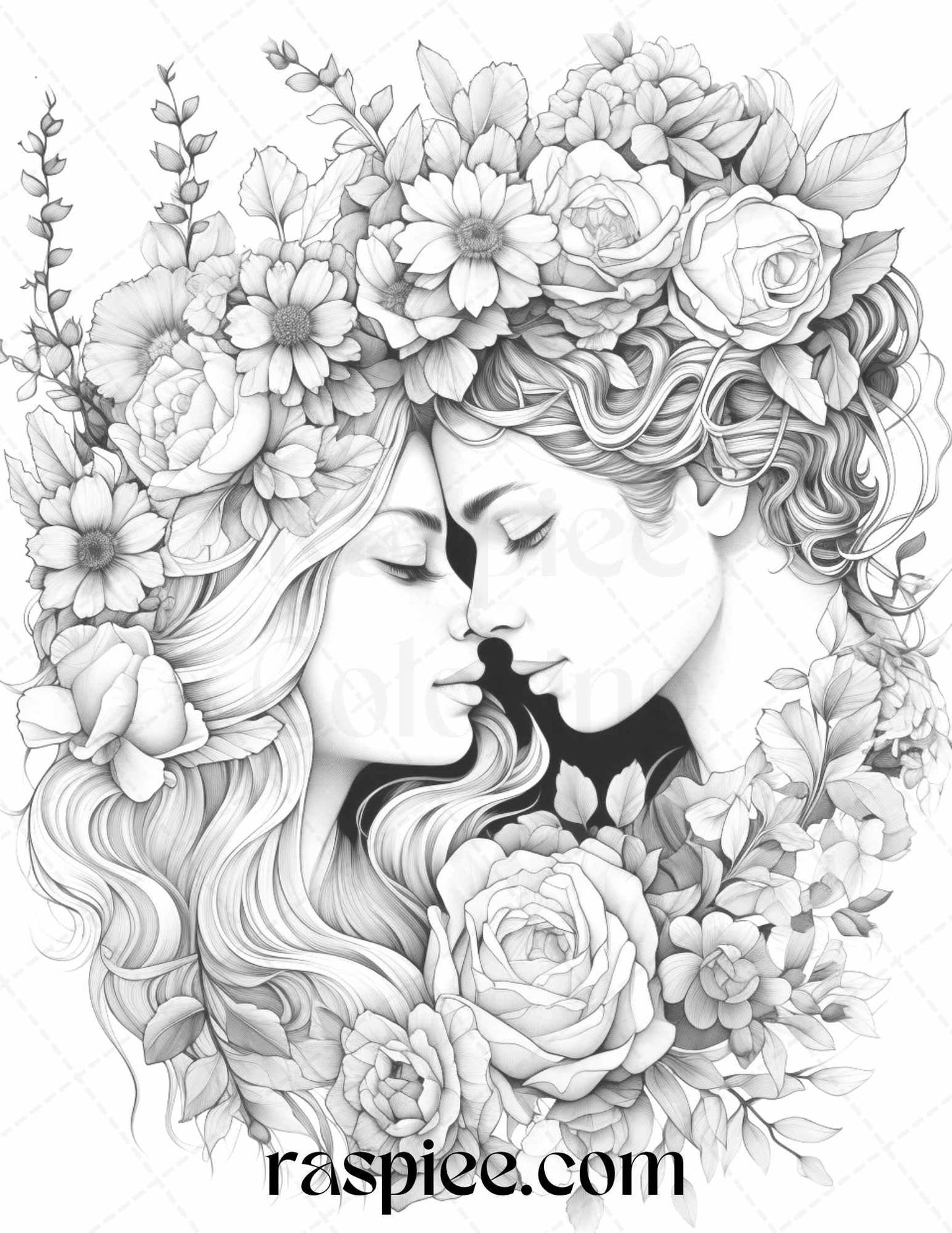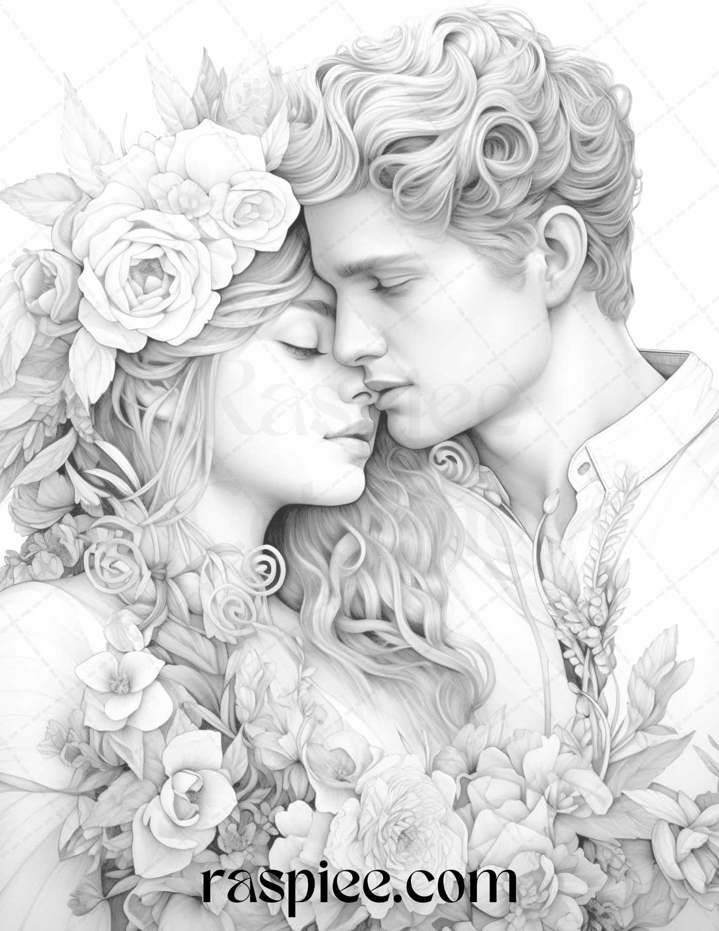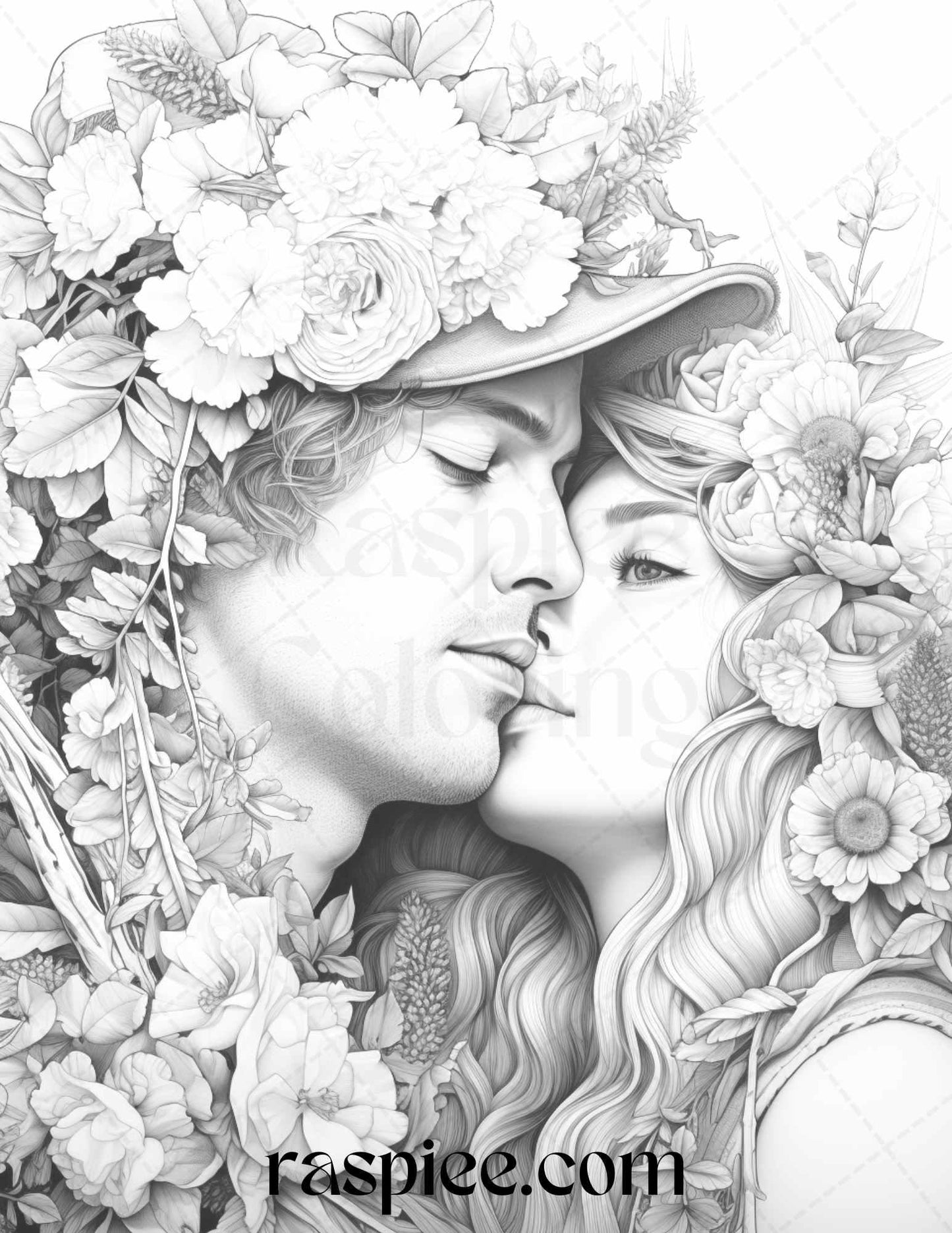 Our grayscale prints showcase intricate floral illustrations intertwined with romantic couples, evoking feelings of love and warmth. Whether you're an art enthusiast, need a thoughtful gift for a loved one, or simply wish to unwind, these coloring pages will captivate your heart and imagination.