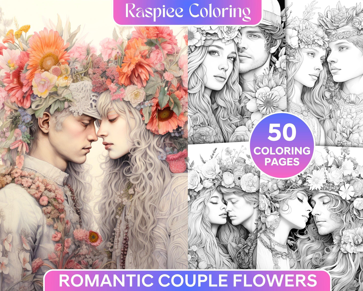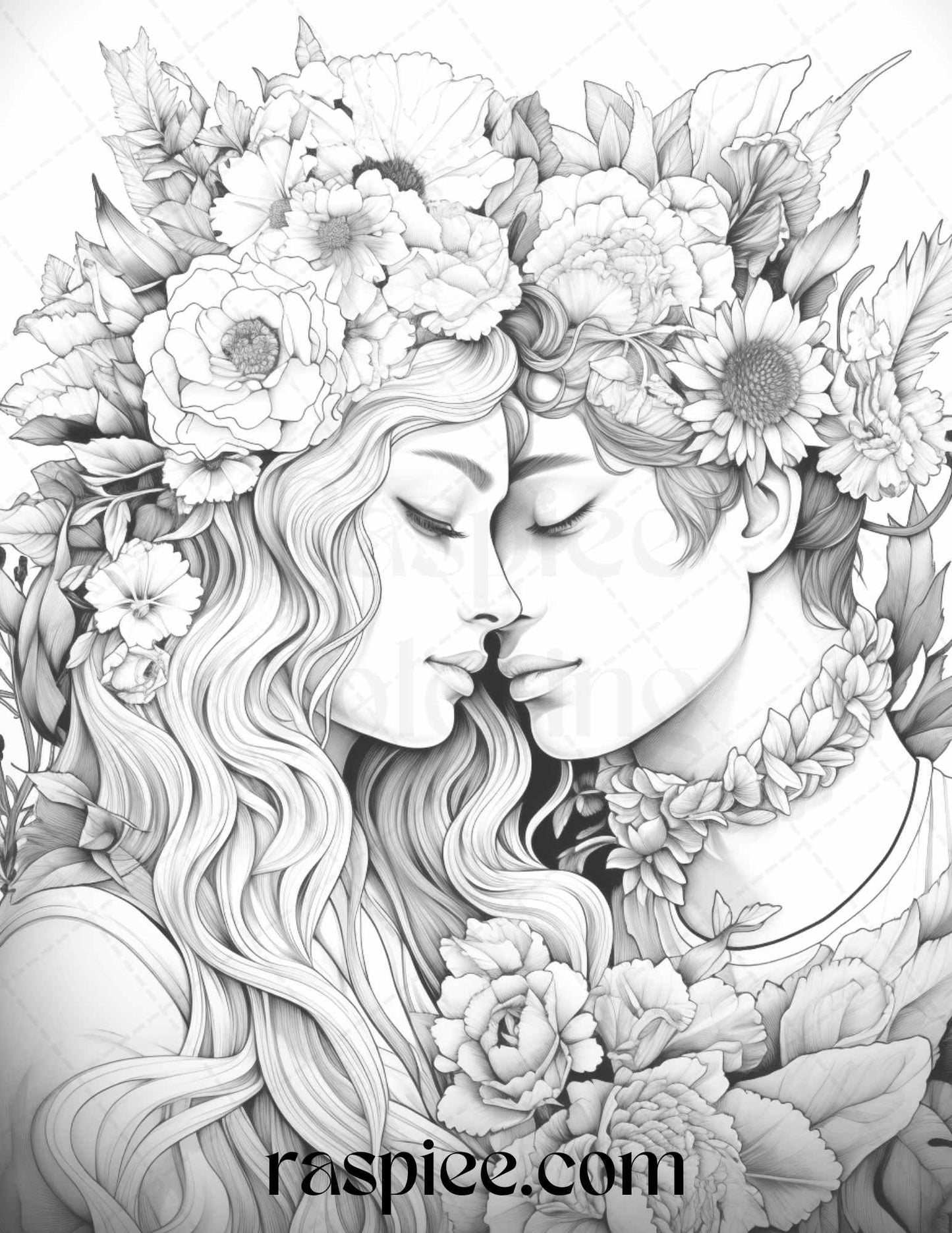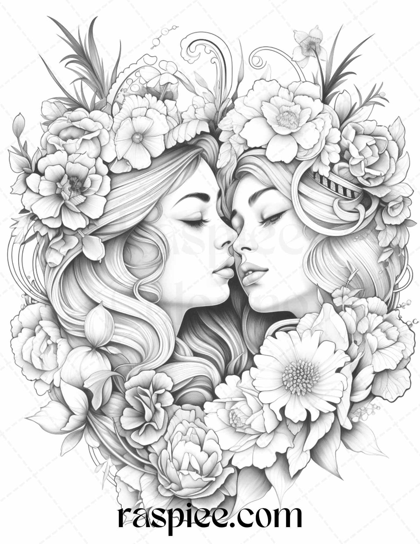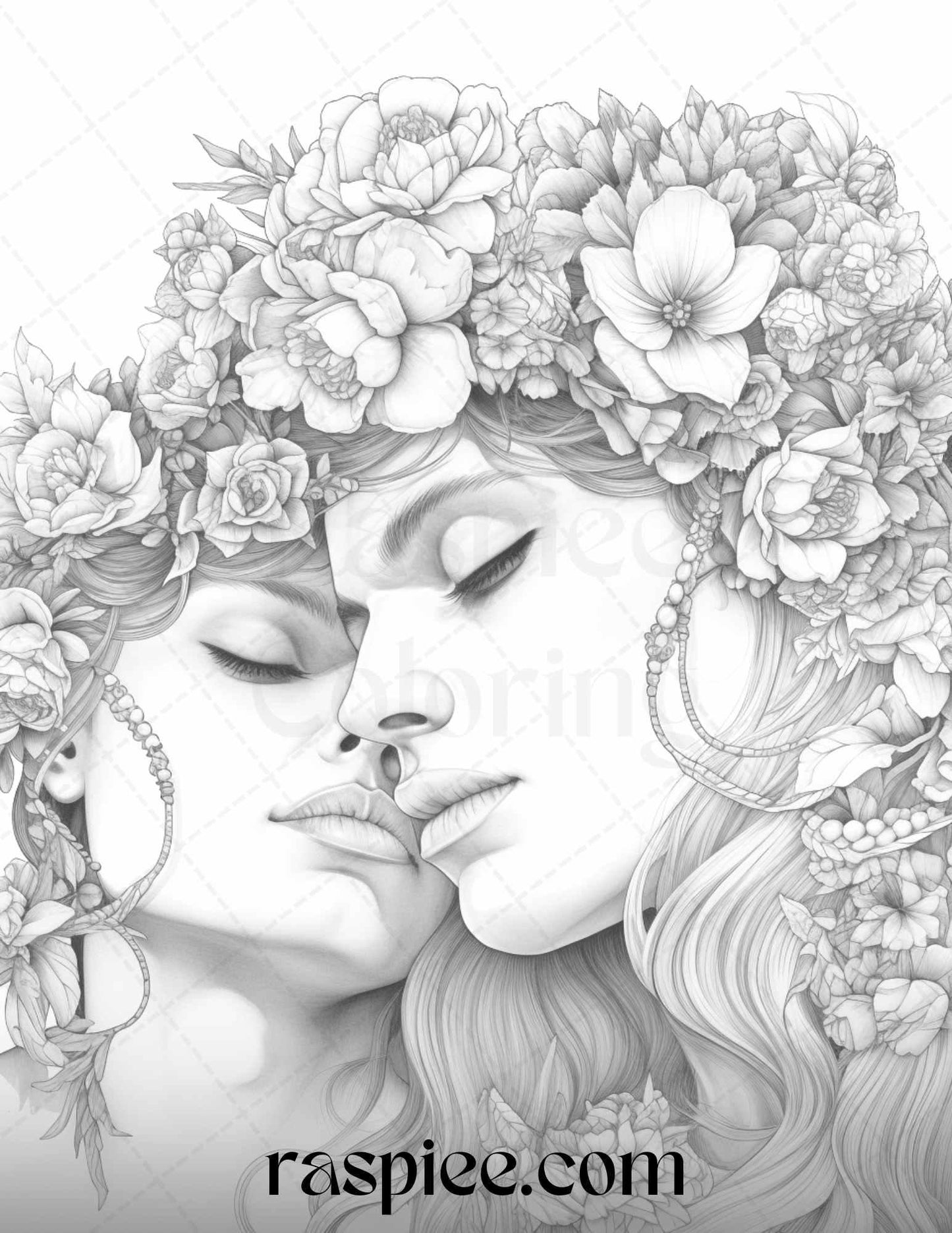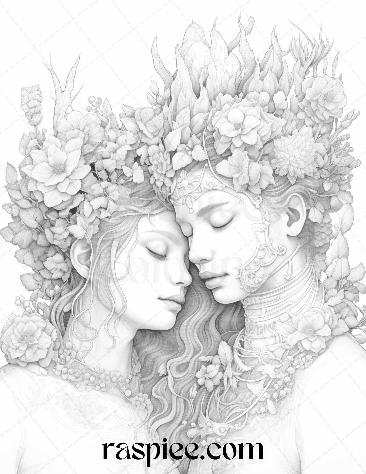 Our grayscale prints showcase intricate floral illustrations intertwined with romantic couples, evoking feelings of love and warmth. Whether you're an art enthusiast, need a thoughtful gift for a loved one, or simply wish to unwind, these coloring pages will captivate your heart and imagination.