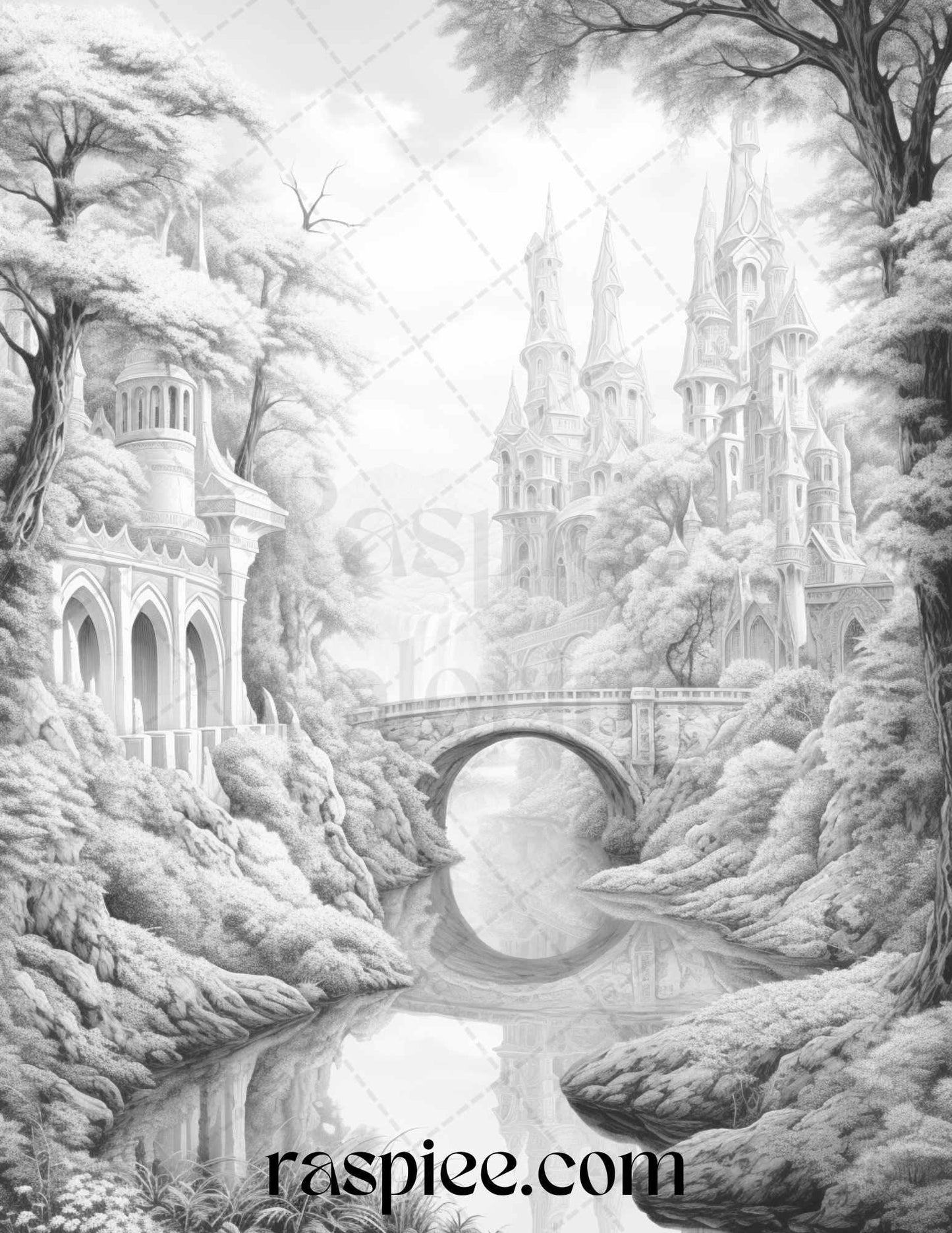 40 Fantasy Landscapes Grayscale Coloring Pages Printable for Adults, PDF File Instant Download