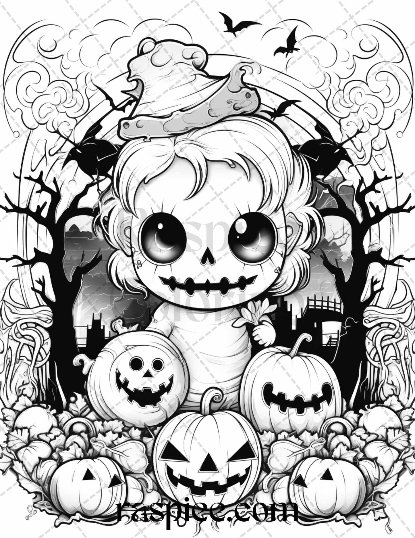 40 Halloween Creepy Kawaii Grayscale Coloring Pages for Adults and Kids, Printable PDF File Instant Download