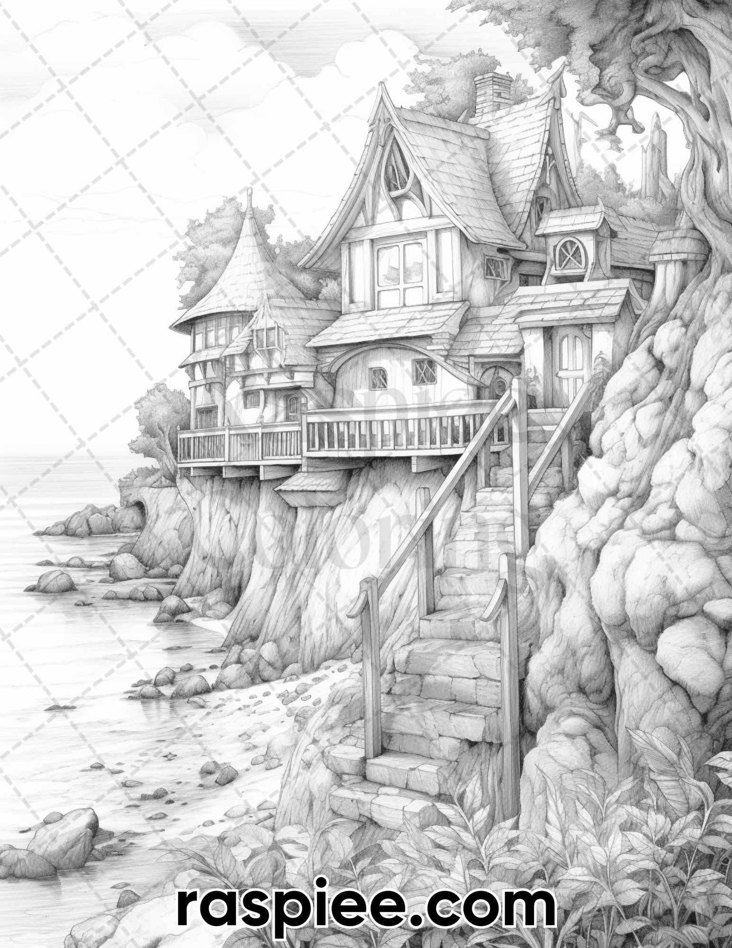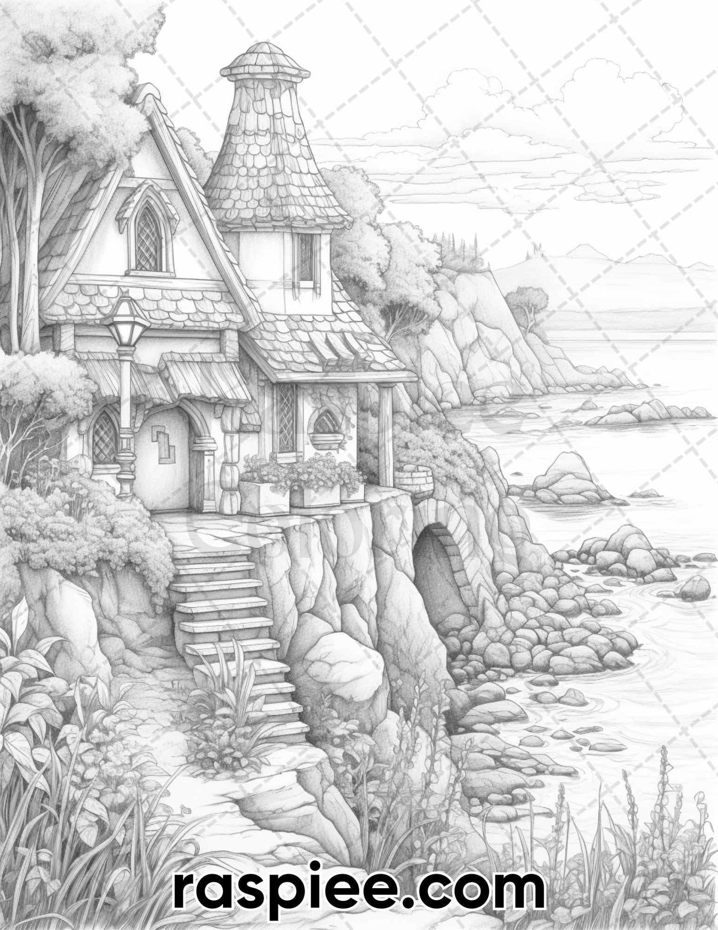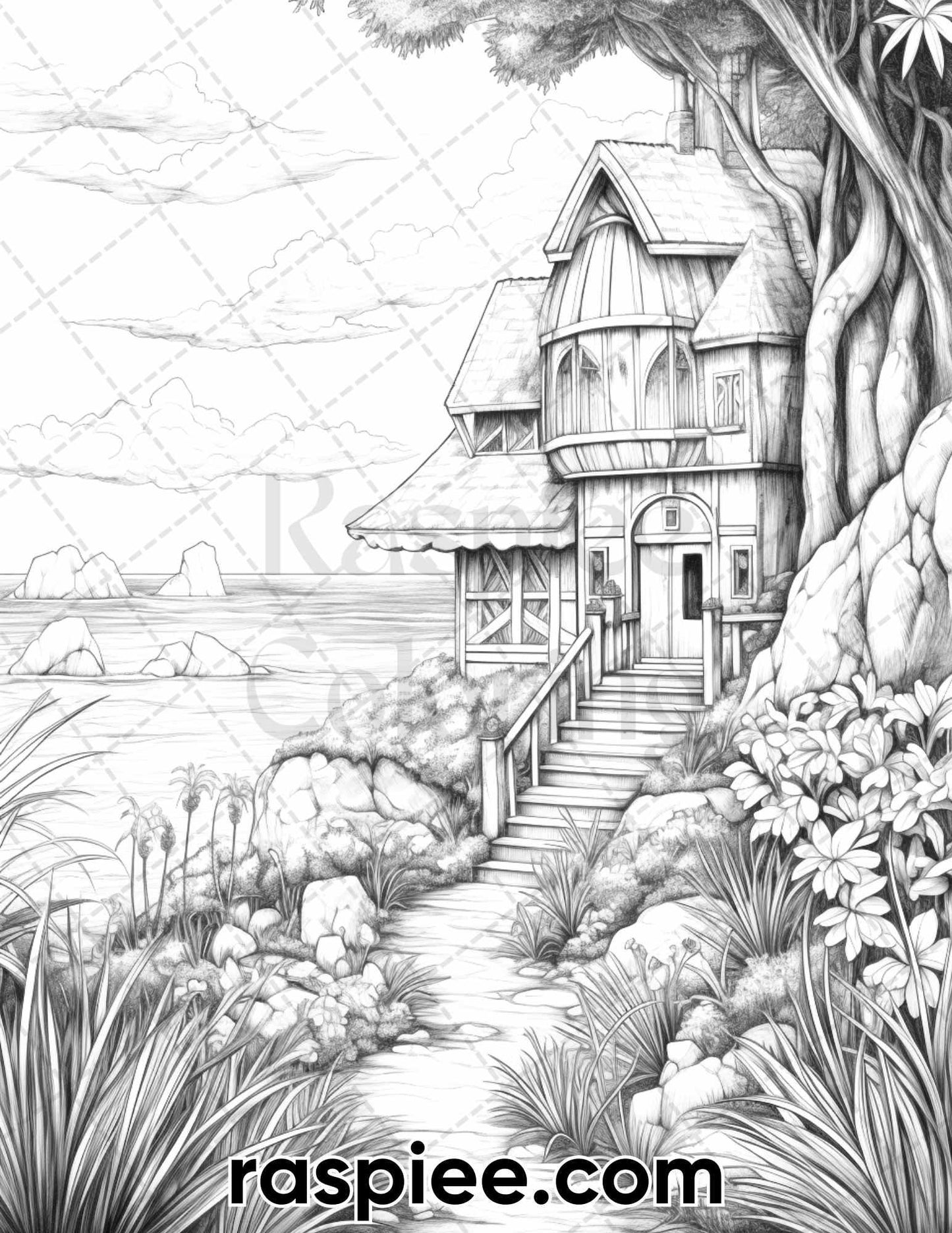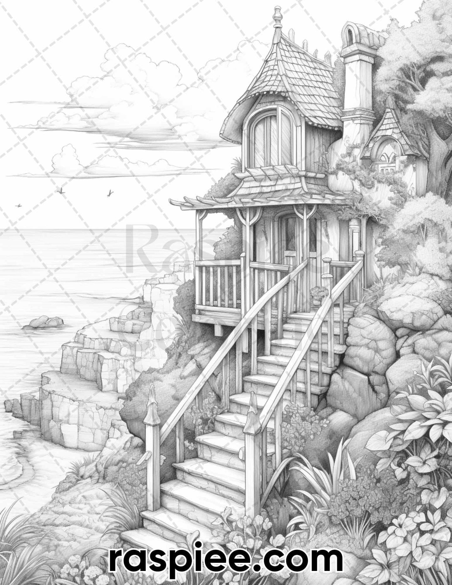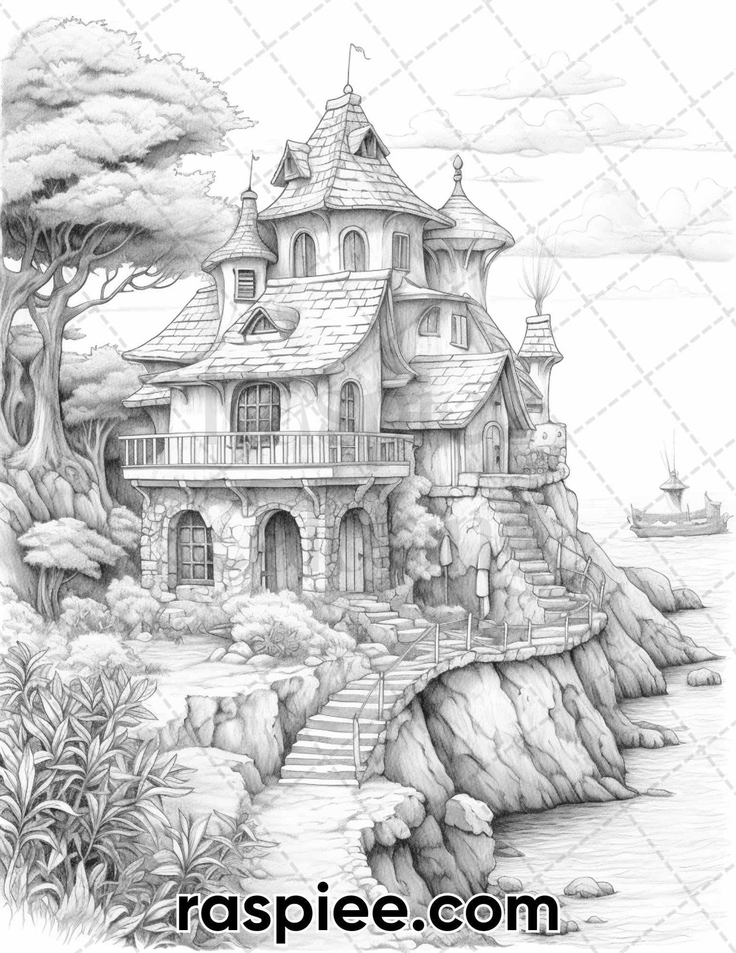 50 Fairy Beach Houses Grayscale Coloring Pages for Adults, Printable PDF Instant Download