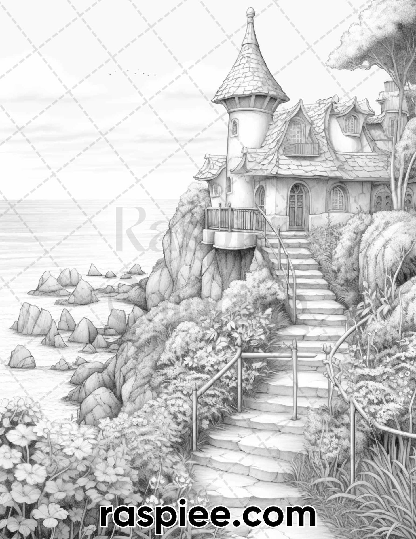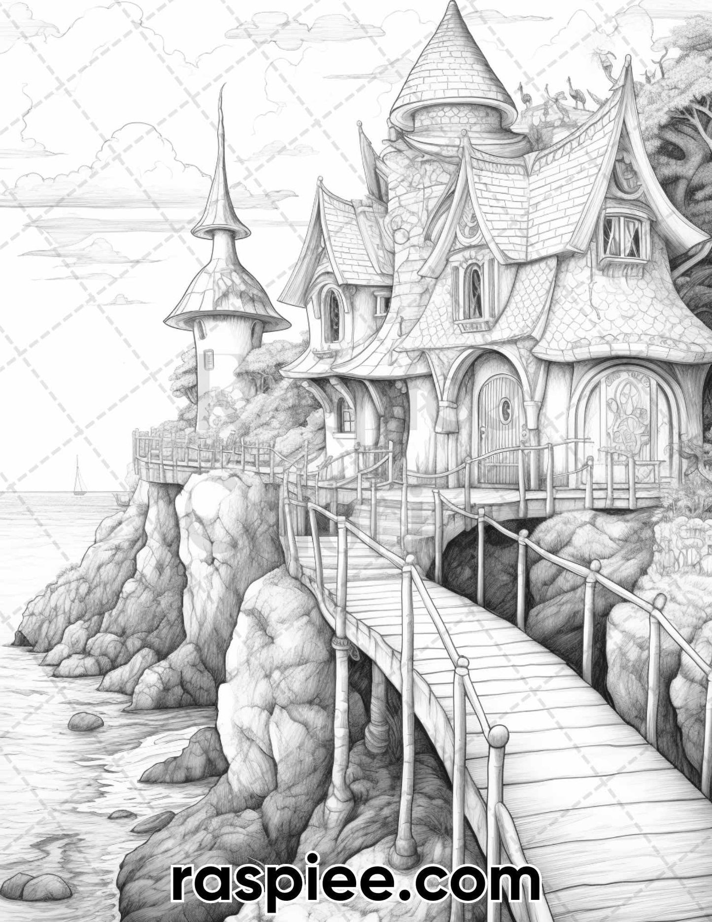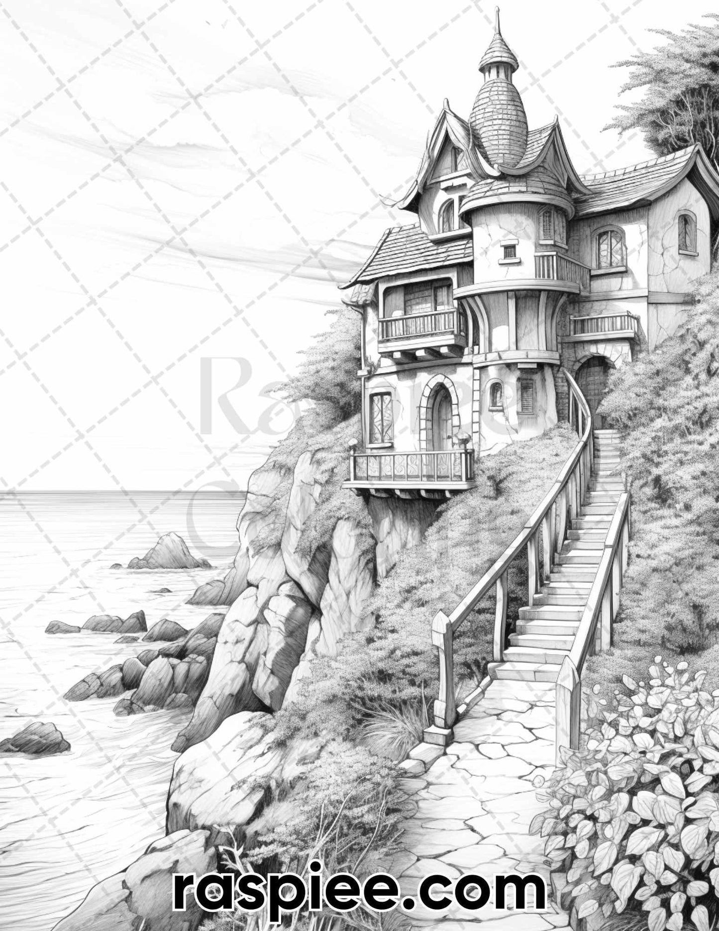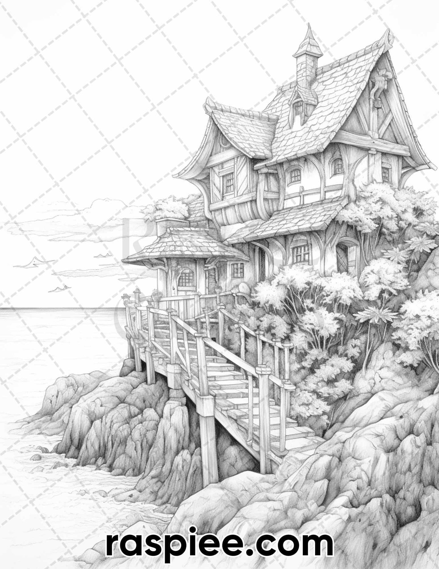 50 Fairy Beach Houses Grayscale Coloring Pages for Adults, Printable PDF Instant Download