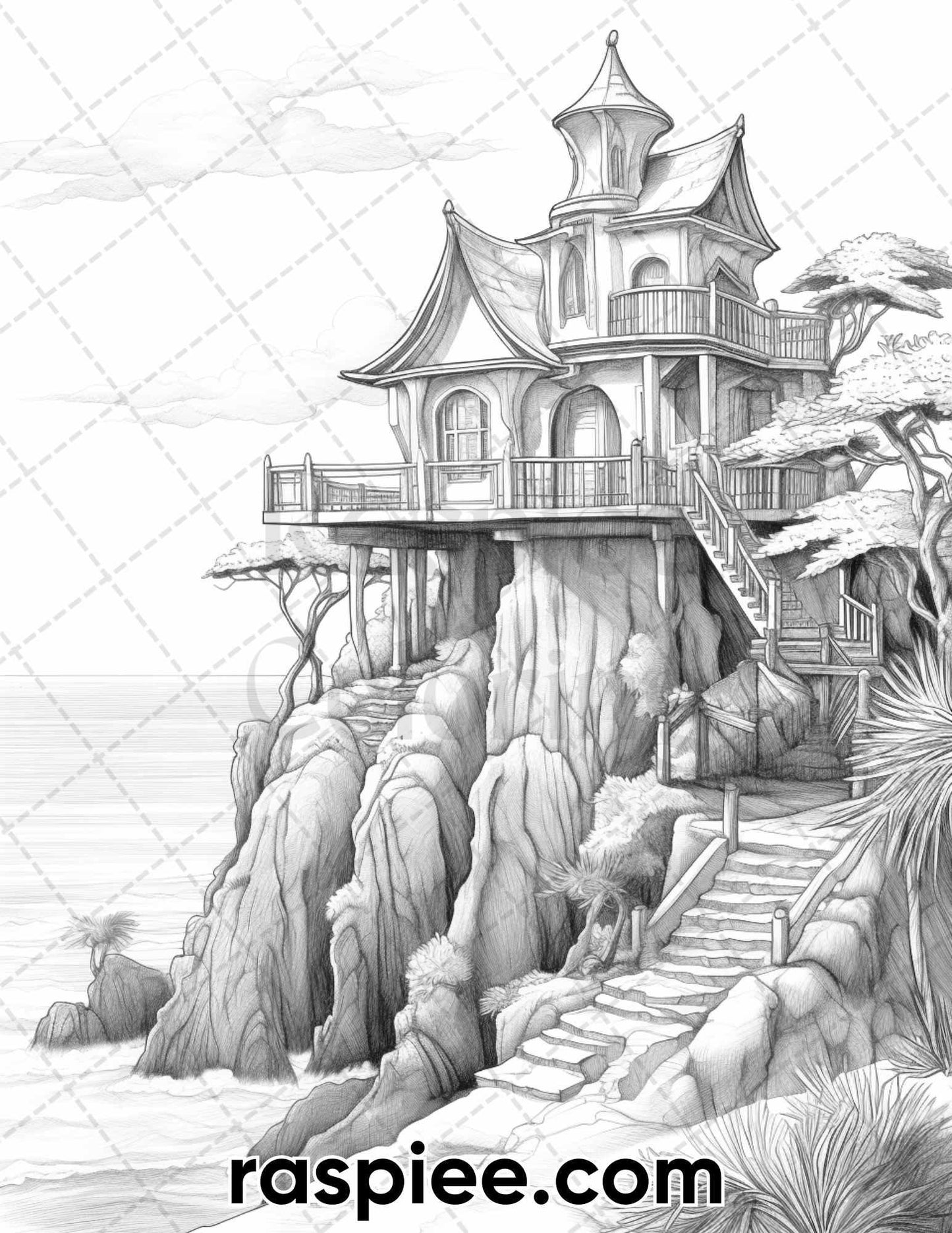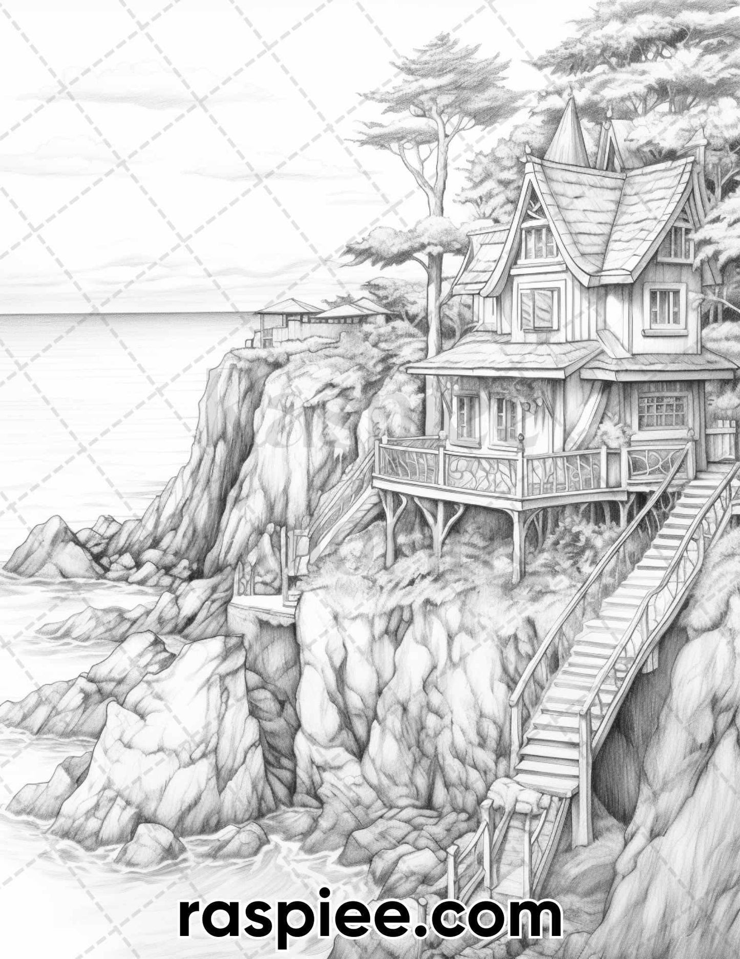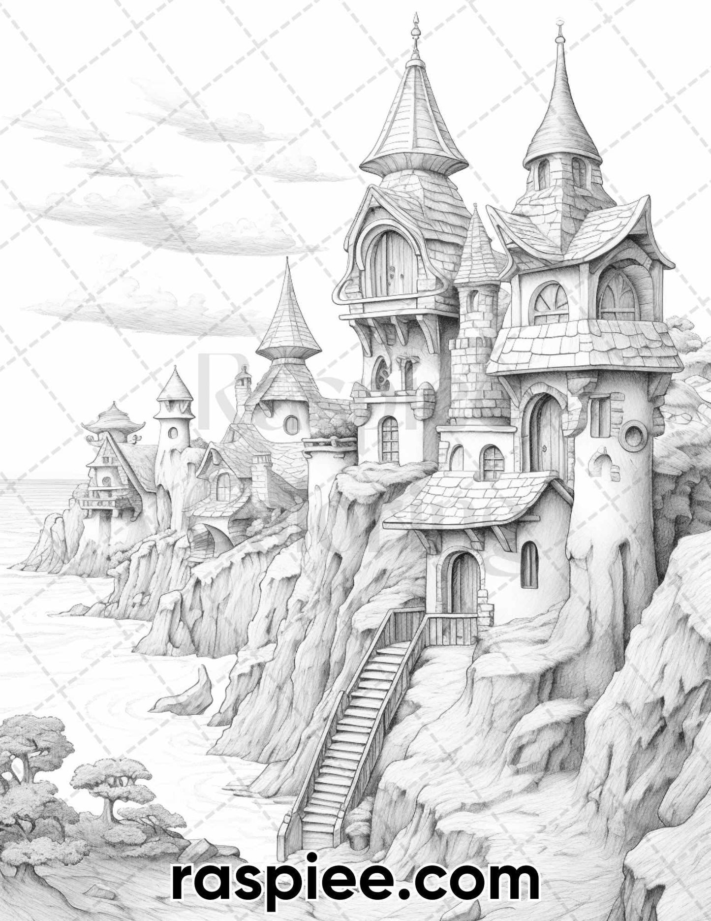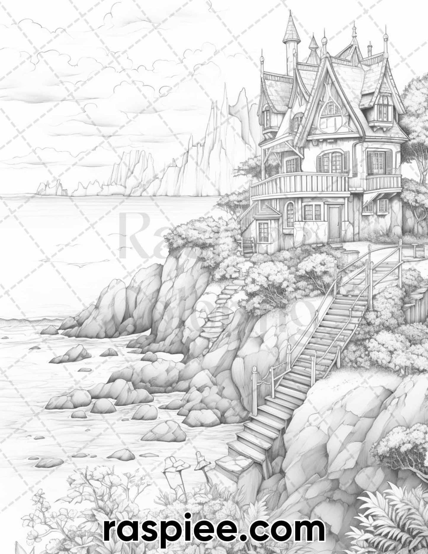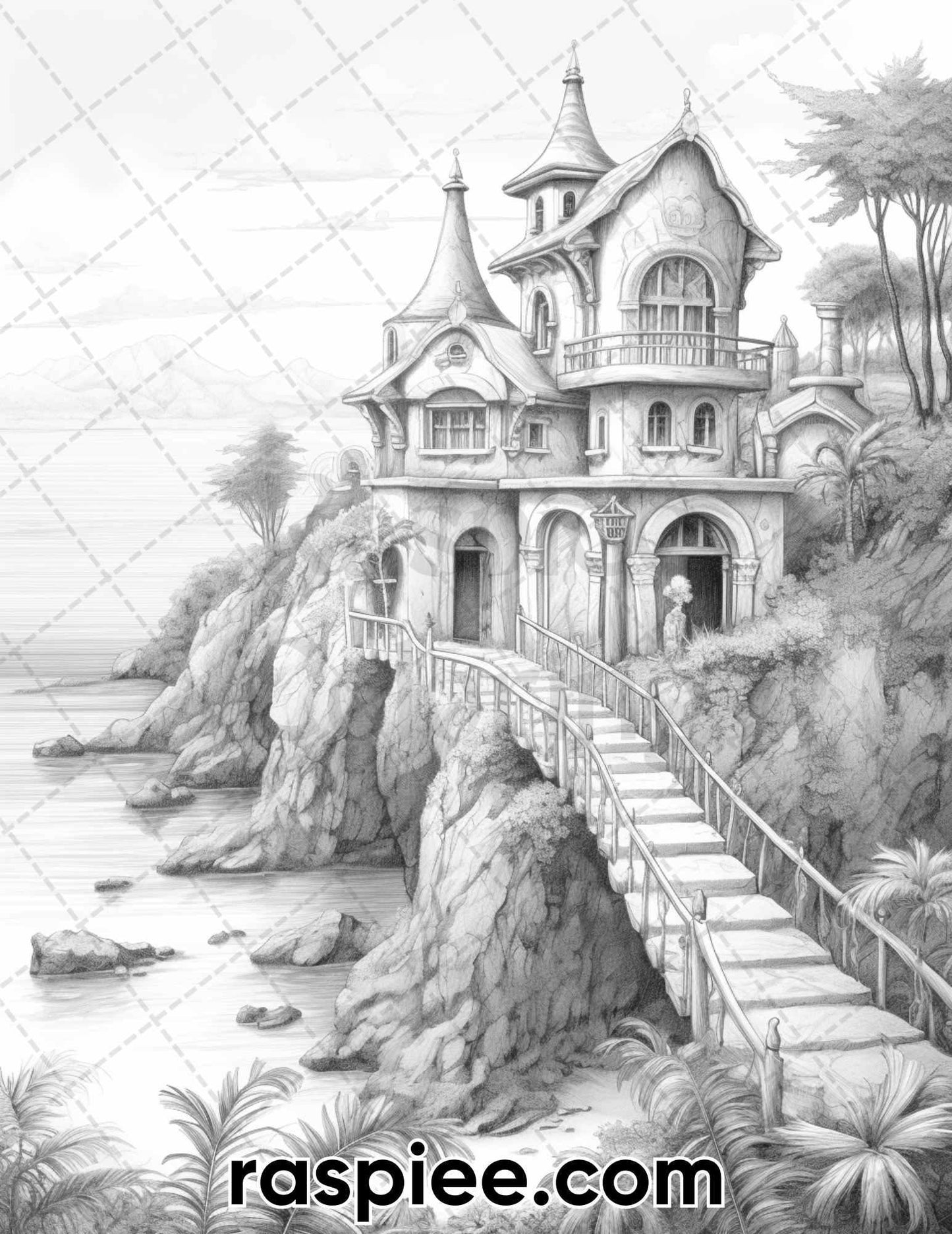 50 Fairy Beach Houses Grayscale Coloring Pages for Adults, Printable PDF Instant Download