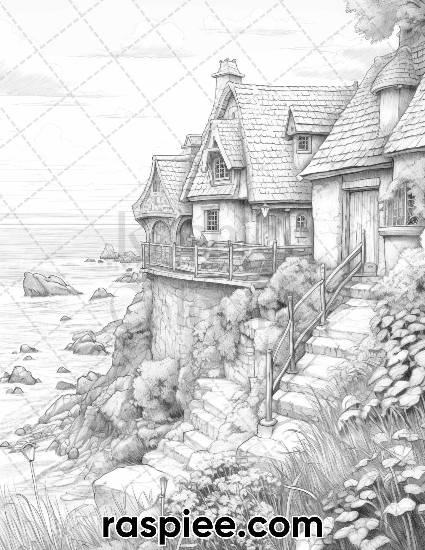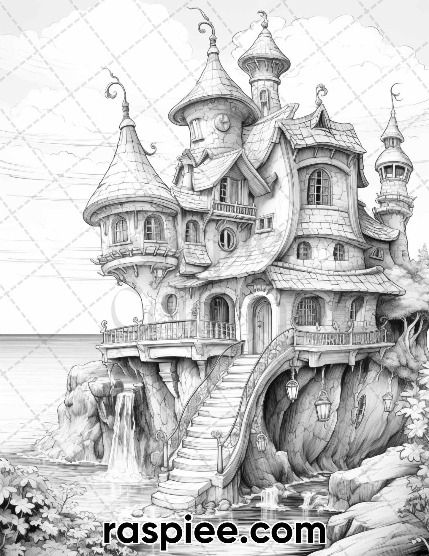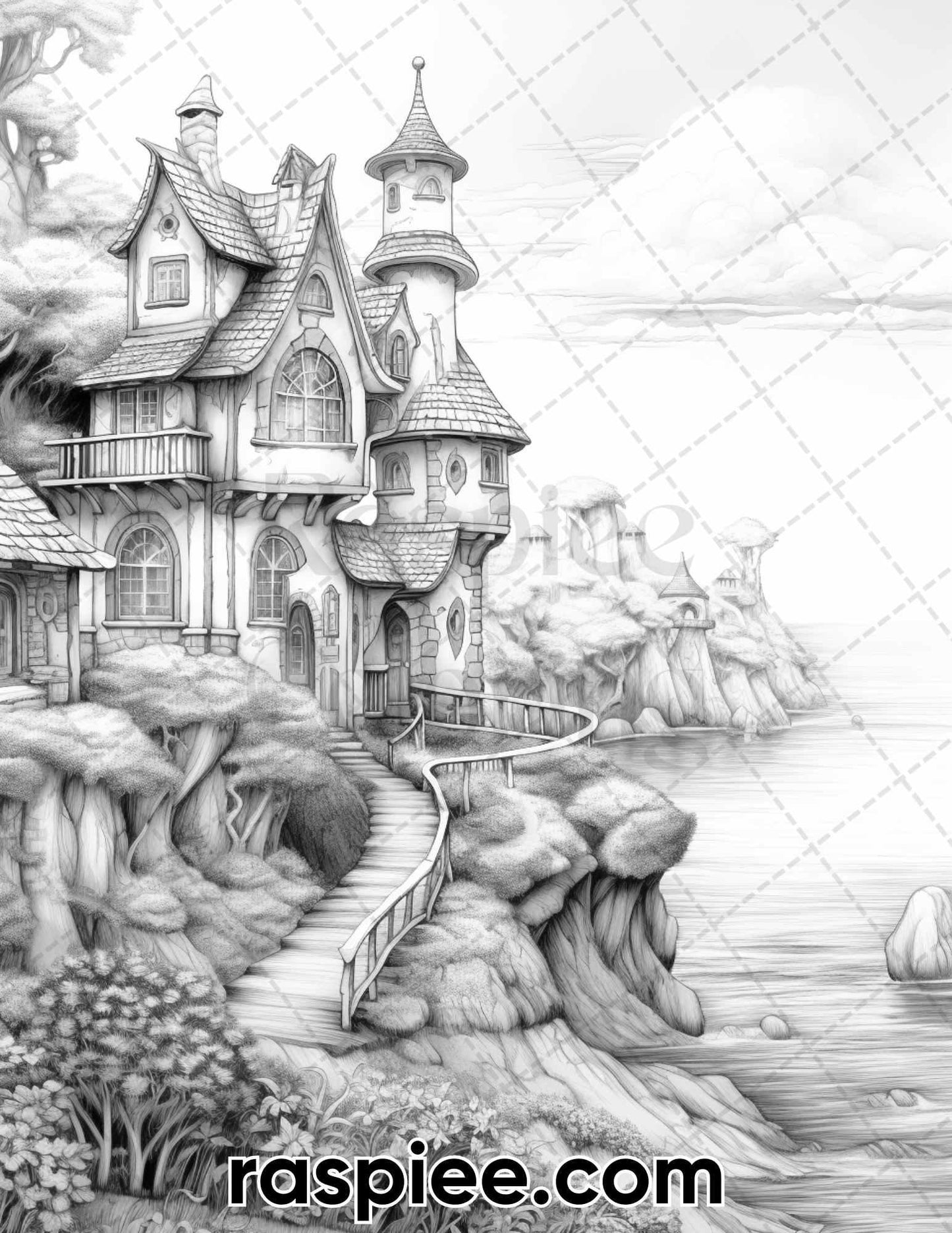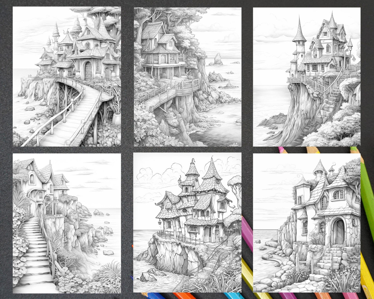 50 Fairy Beach Houses Grayscale Coloring Pages for Adults, Printable PDF Instant Download