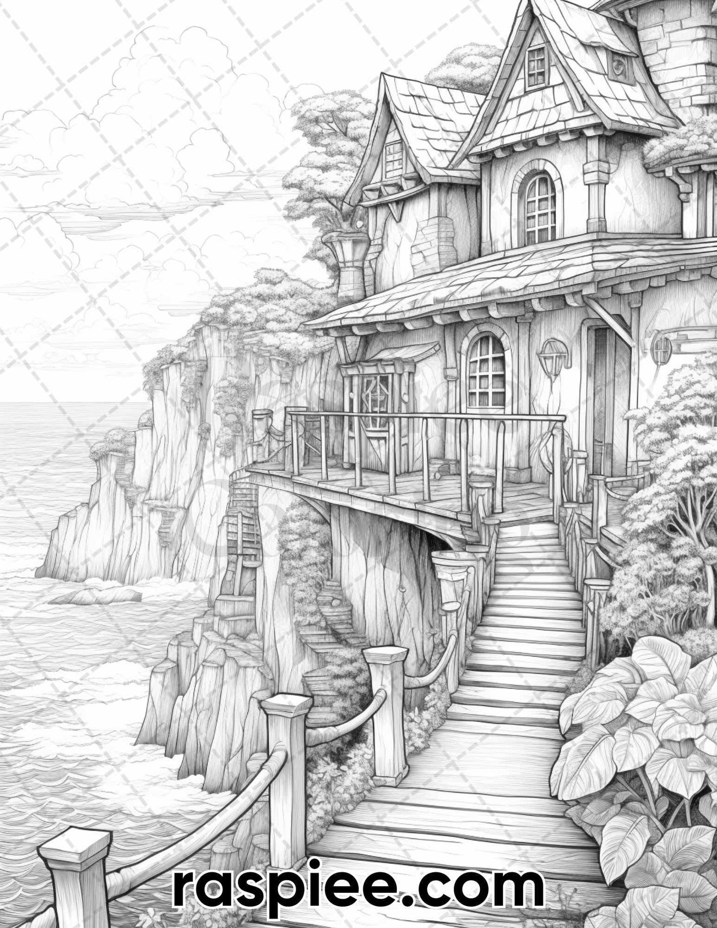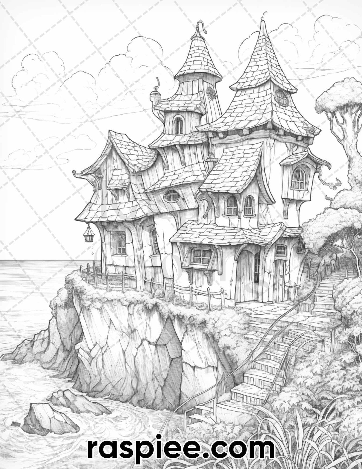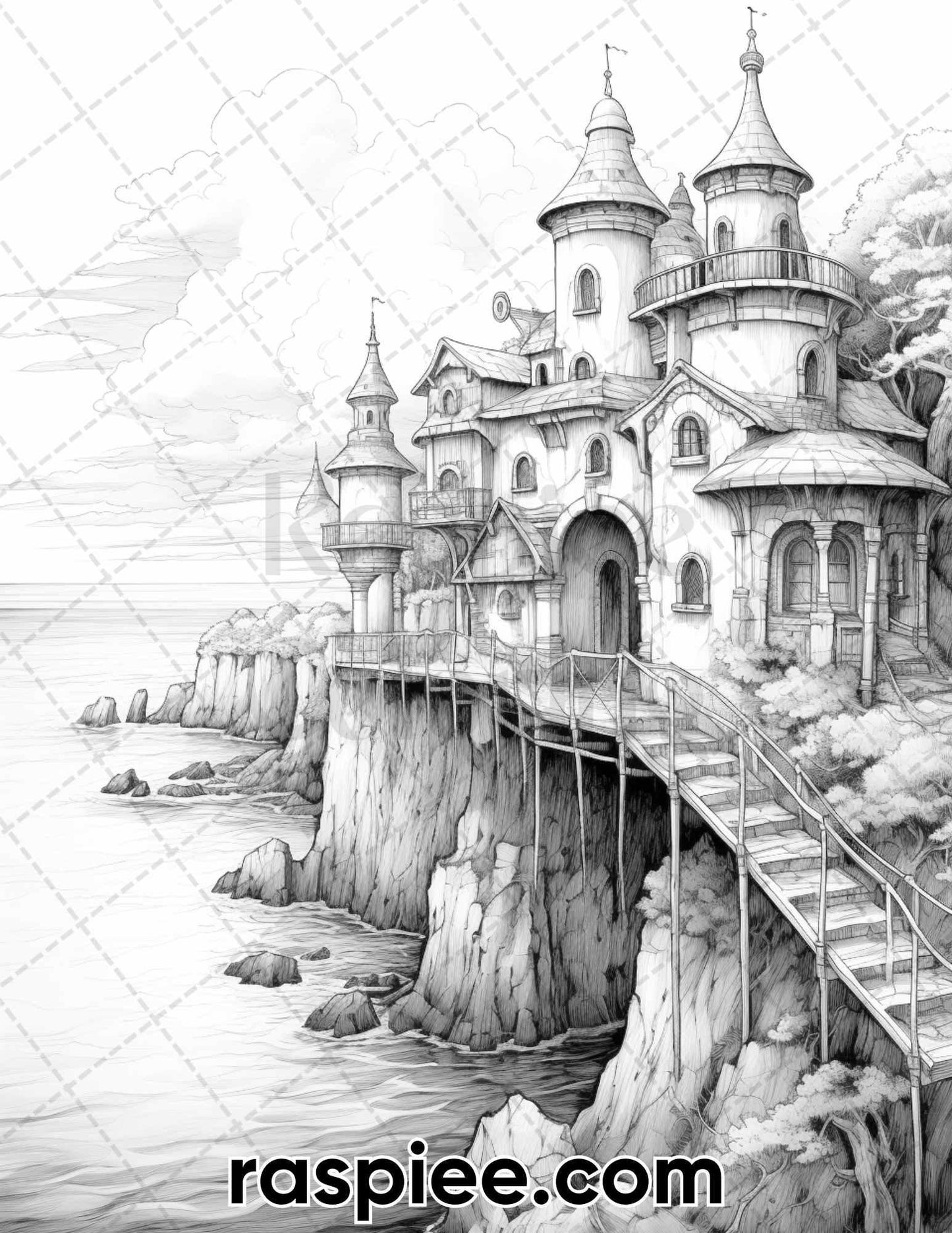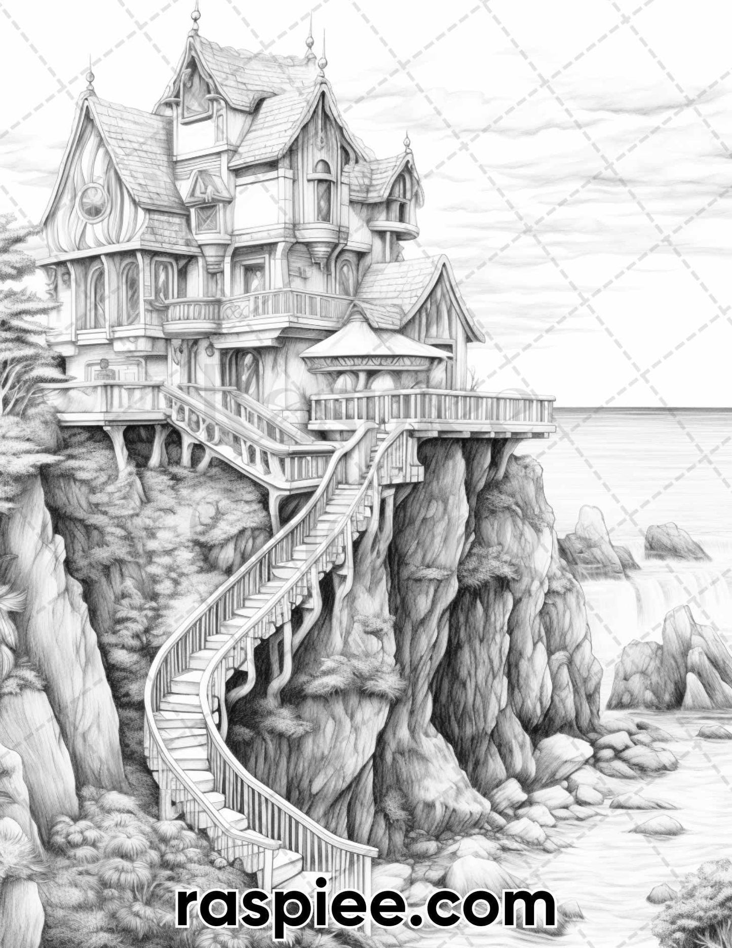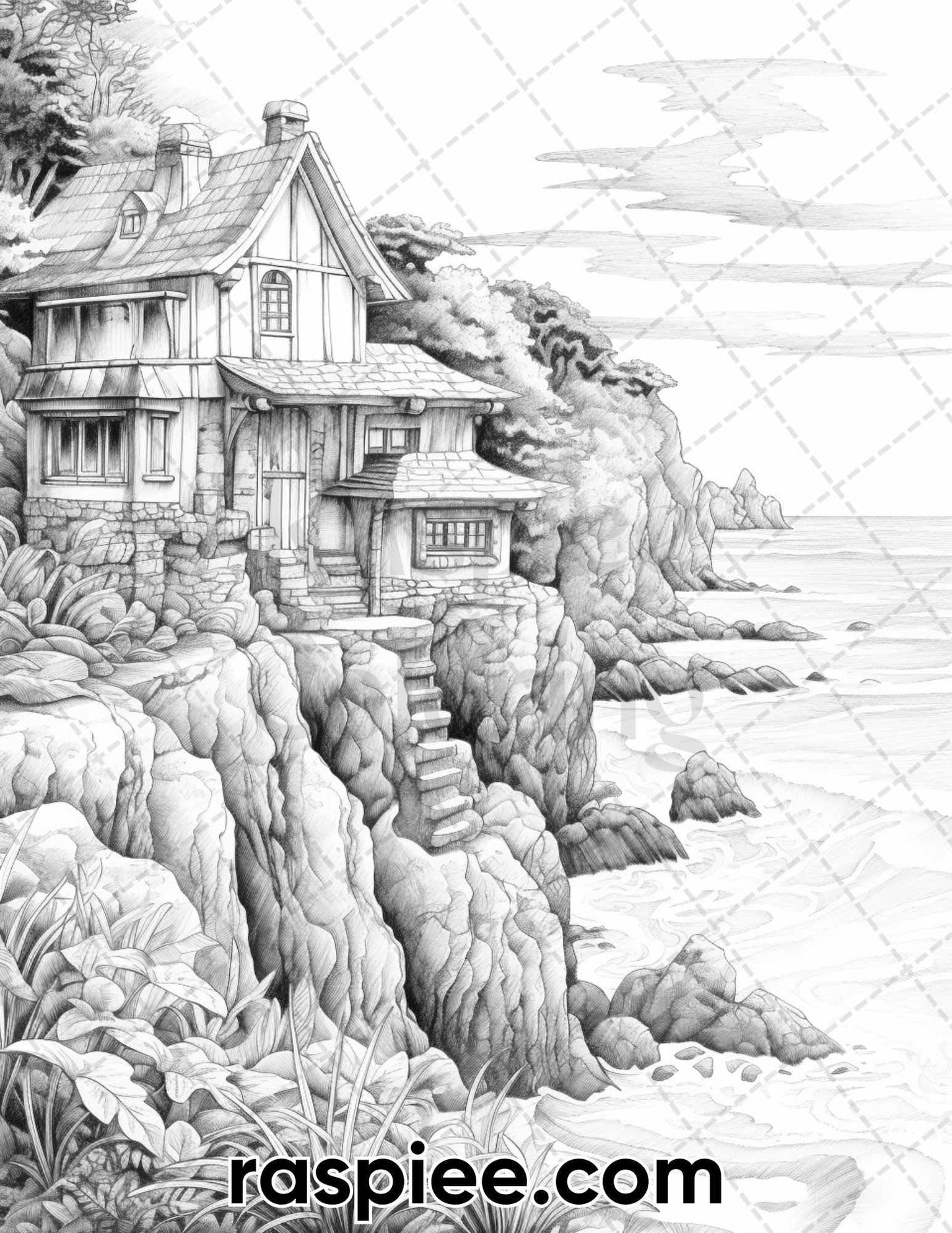 50 Fairy Beach Houses Grayscale Coloring Pages for Adults, Printable PDF Instant Download