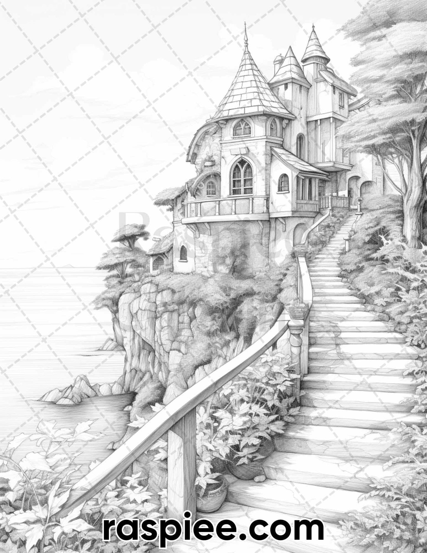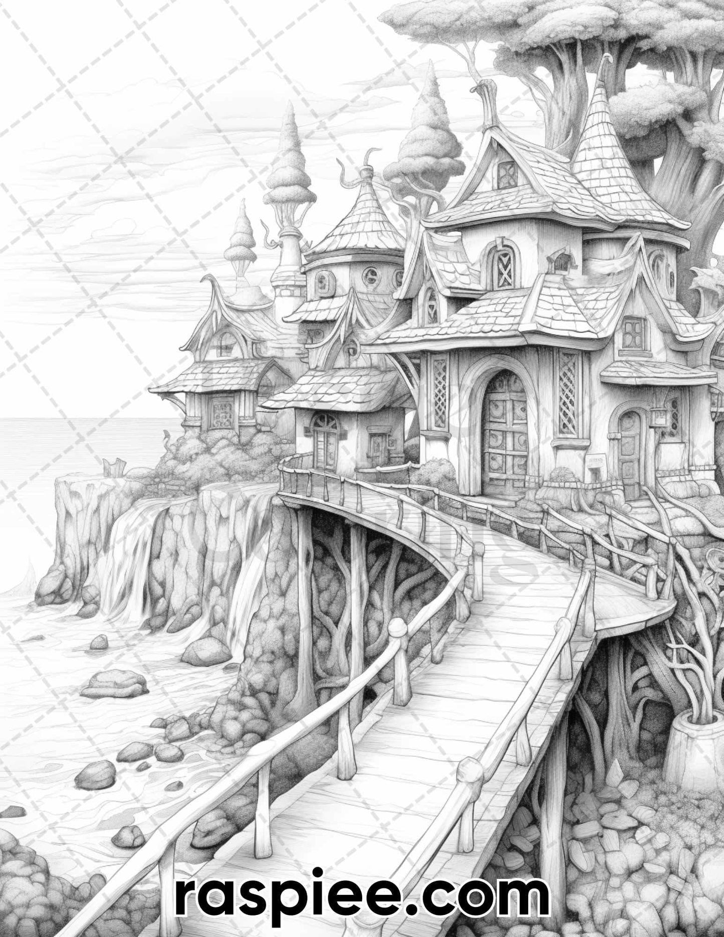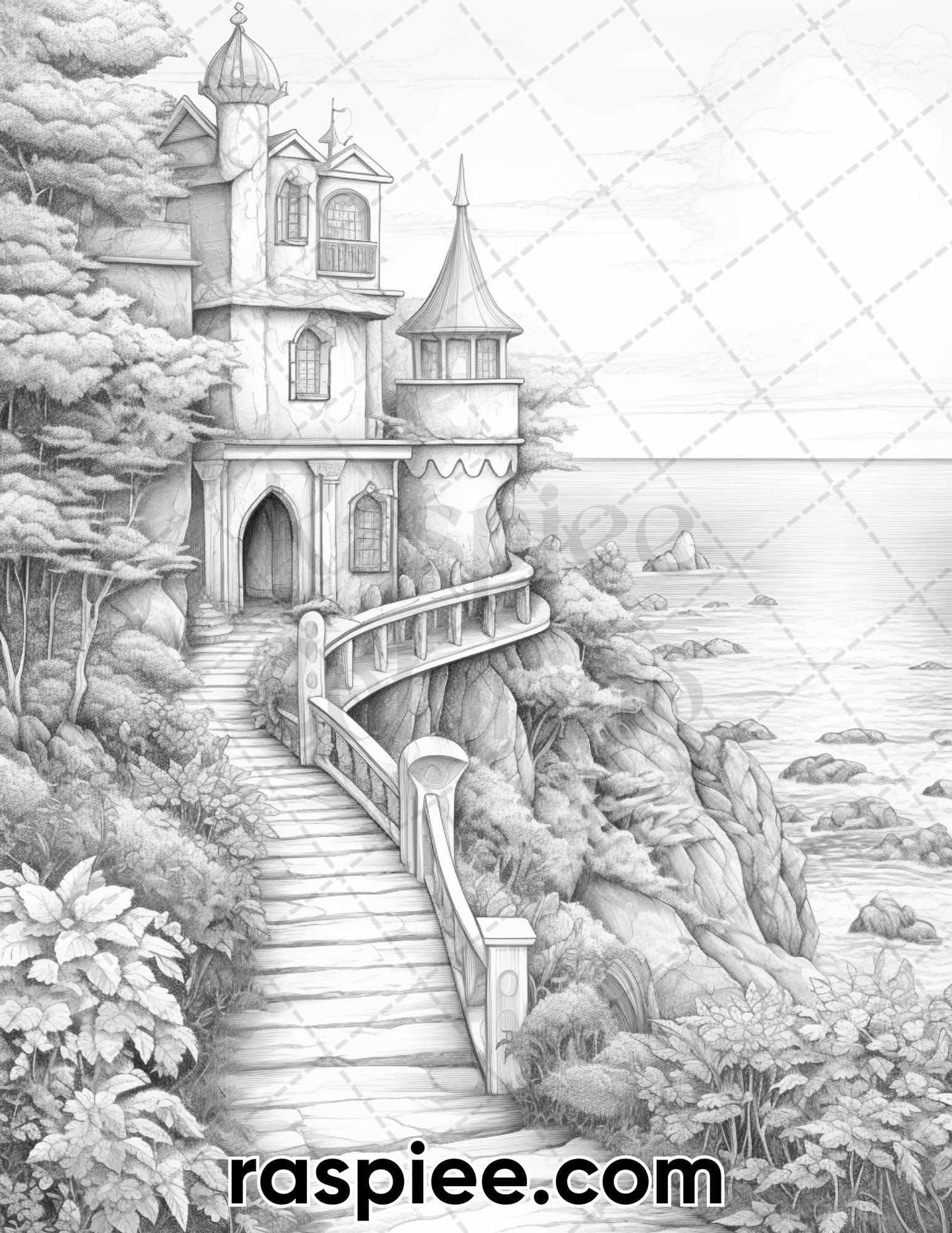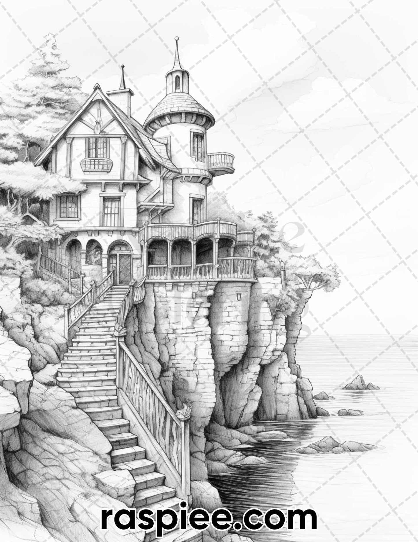 50 Fairy Beach Houses Grayscale Coloring Pages for Adults, Printable PDF Instant Download