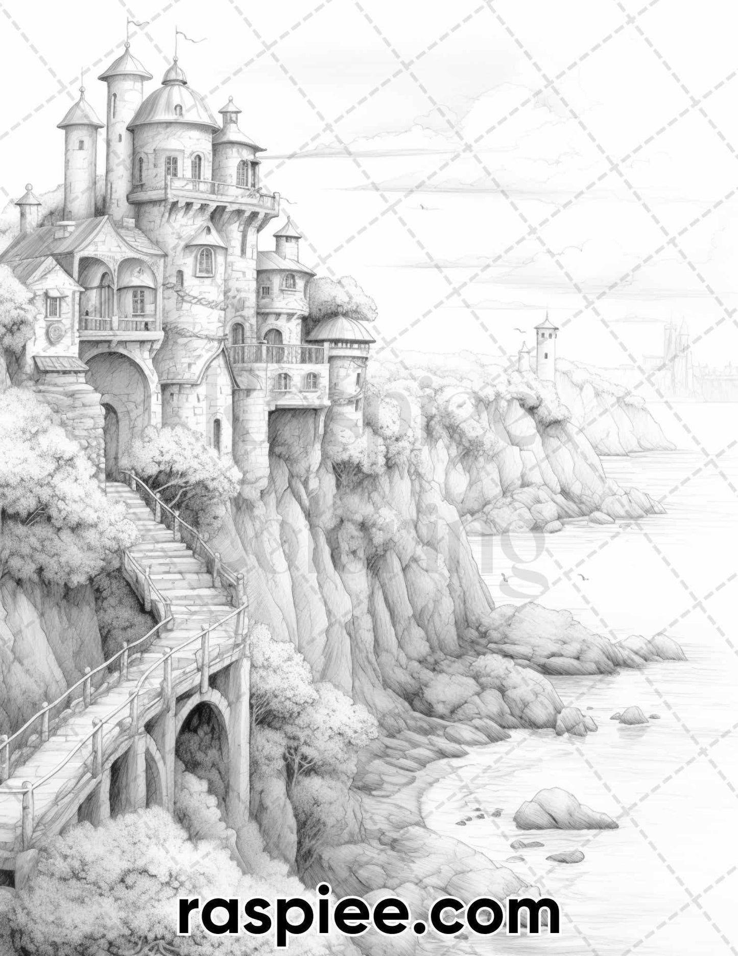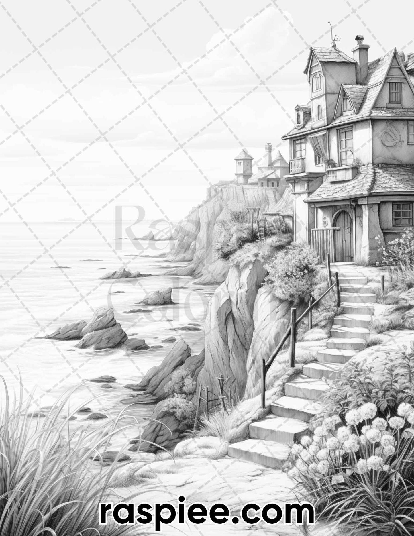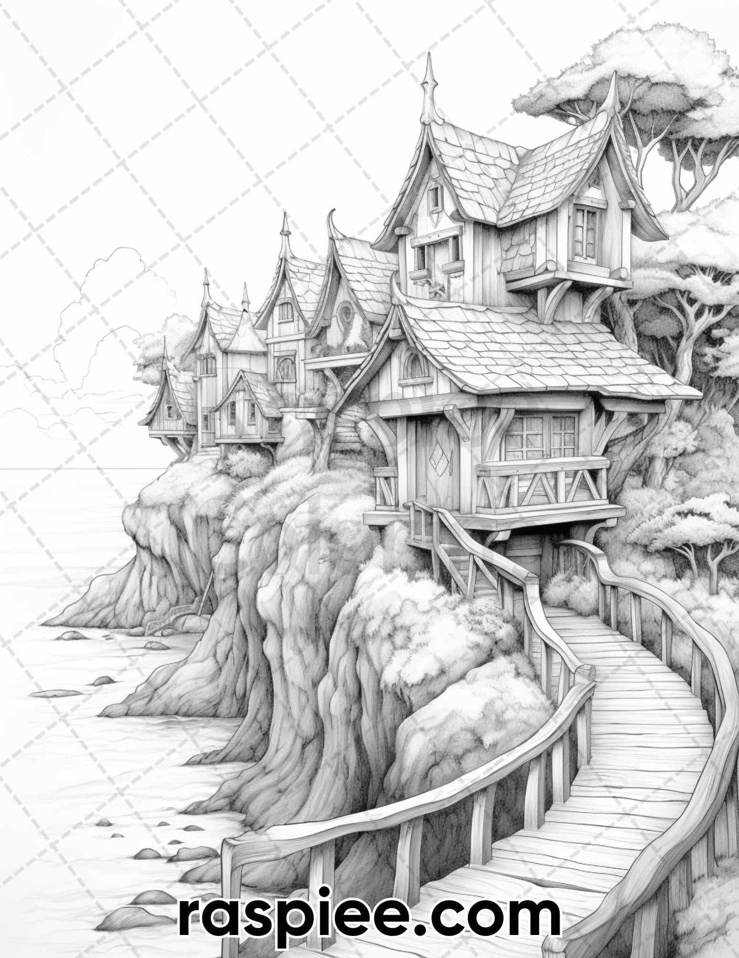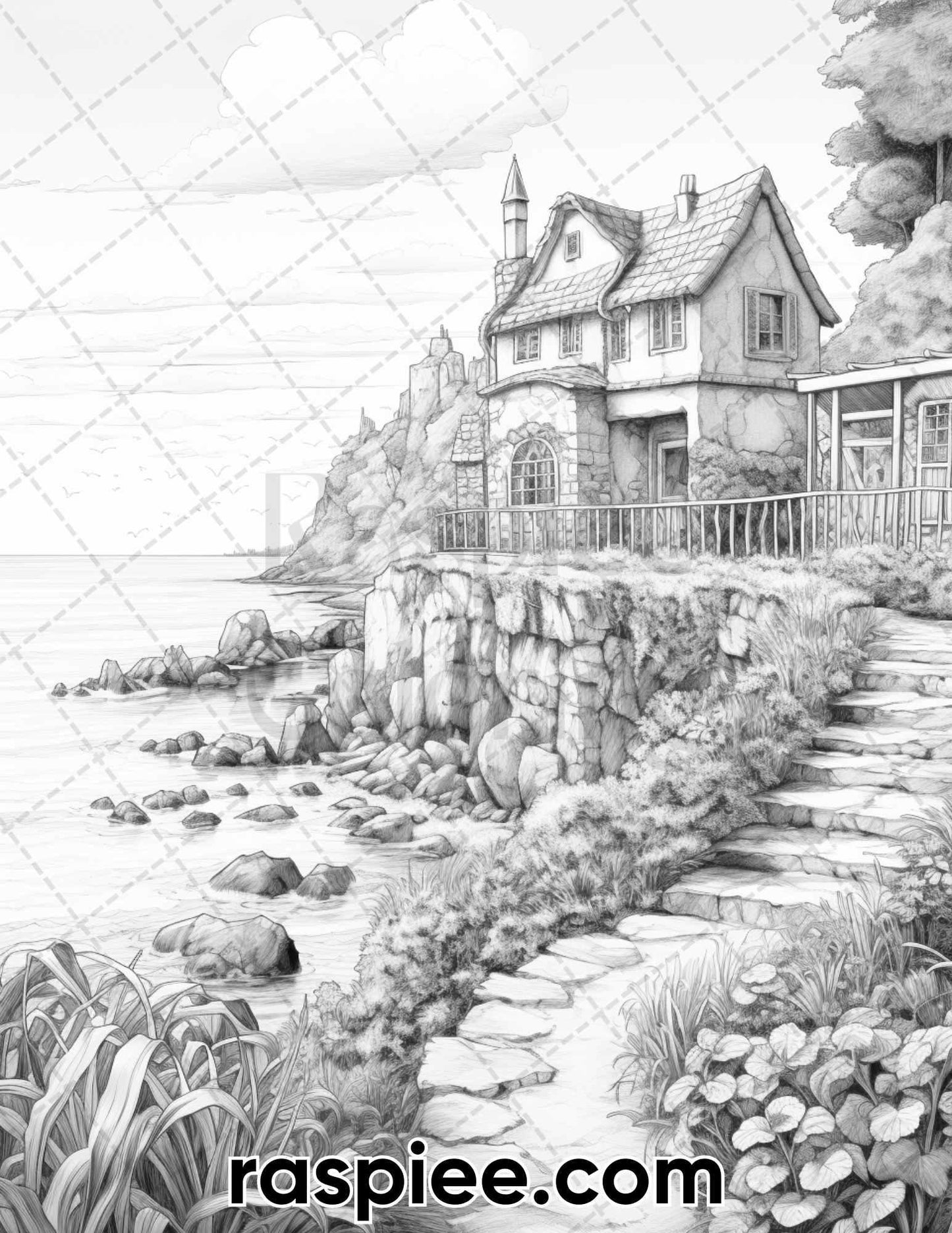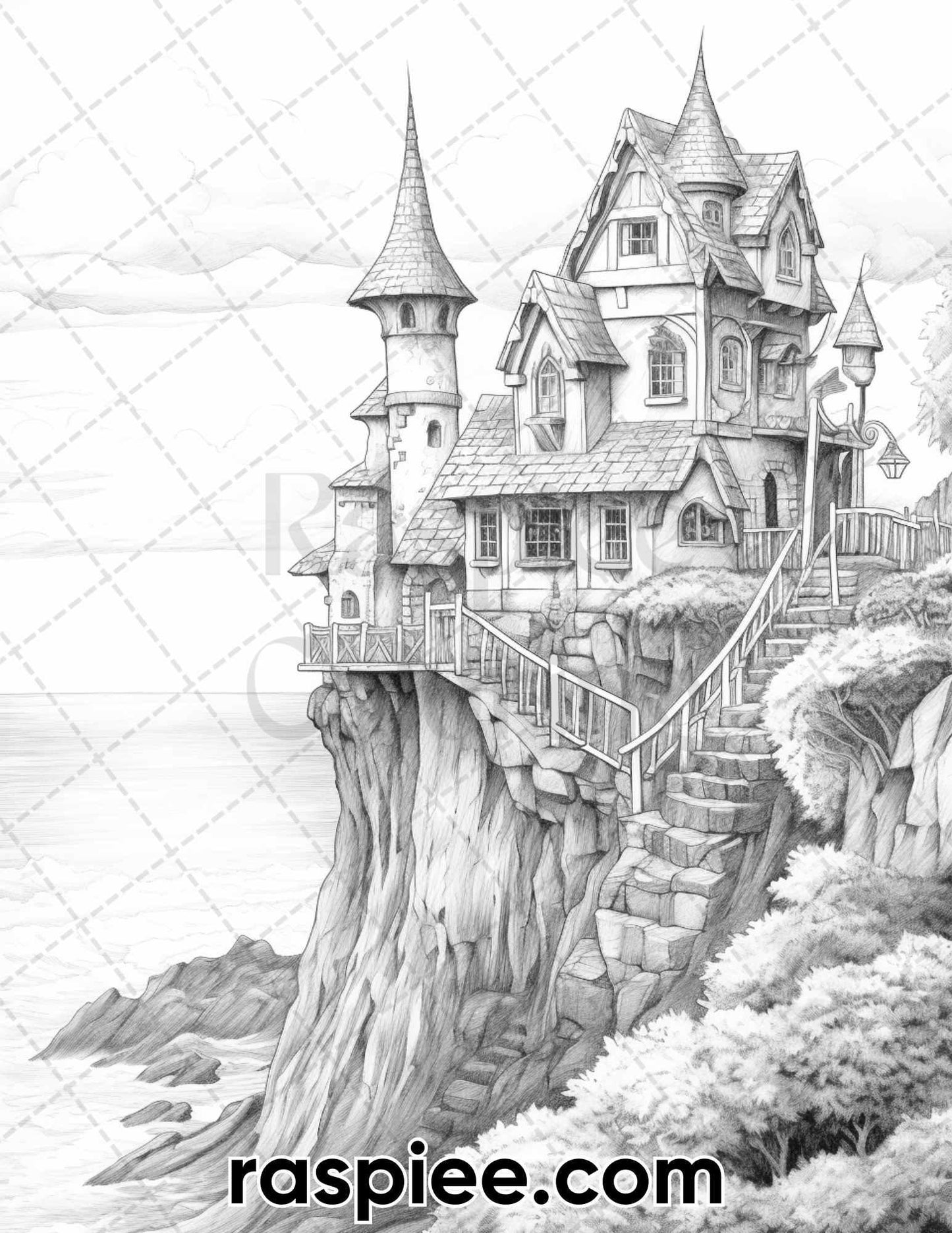 50 Fairy Beach Houses Grayscale Coloring Pages for Adults, Printable PDF Instant Download