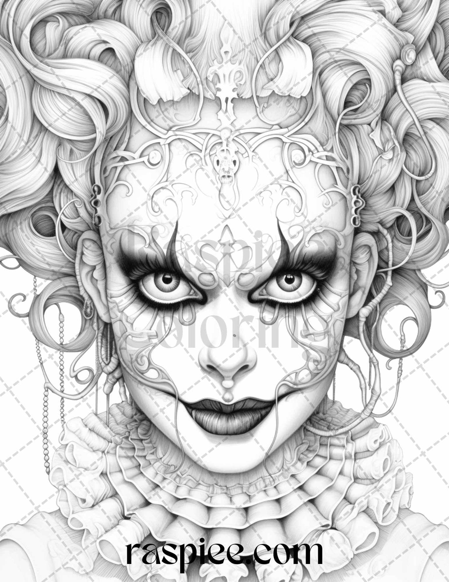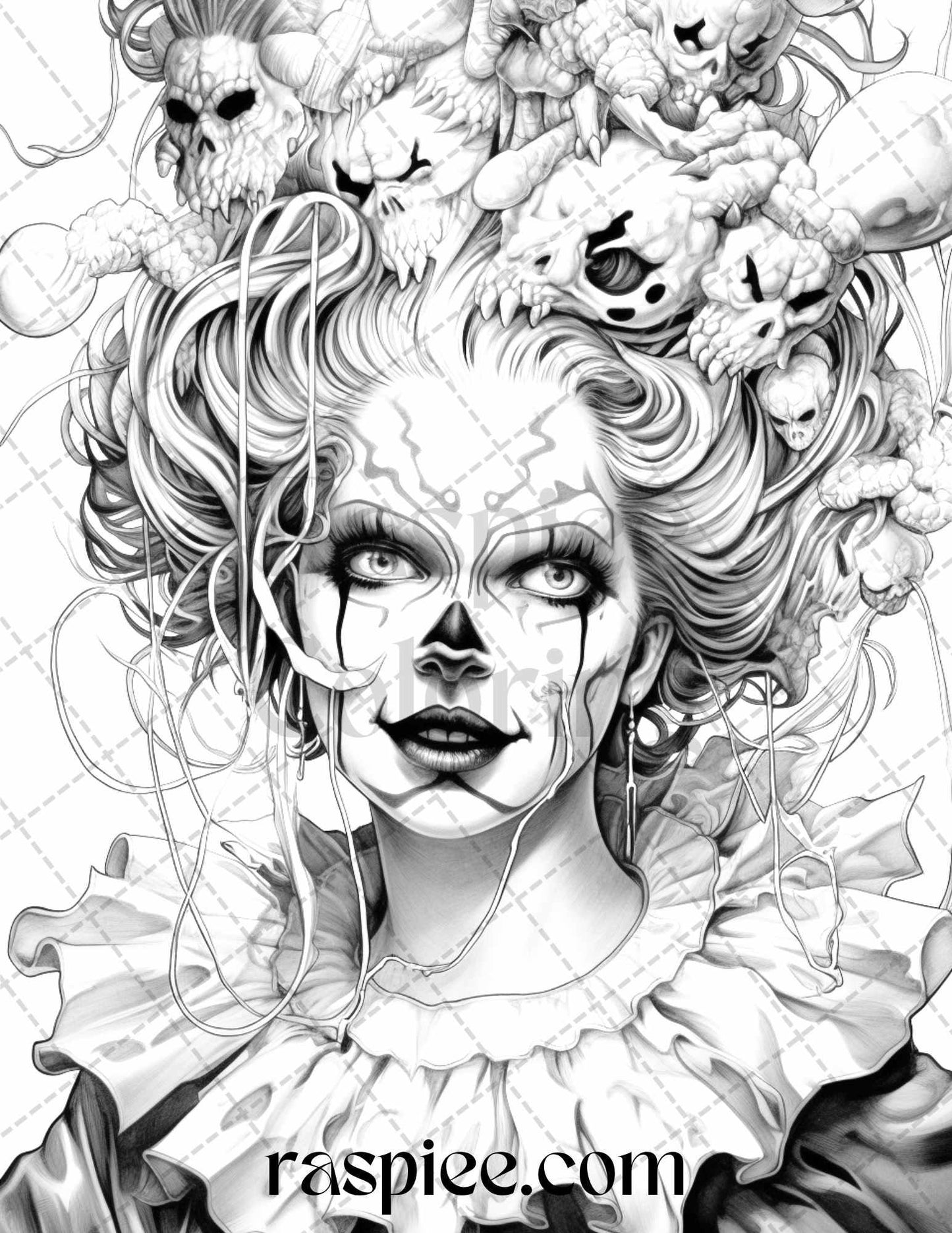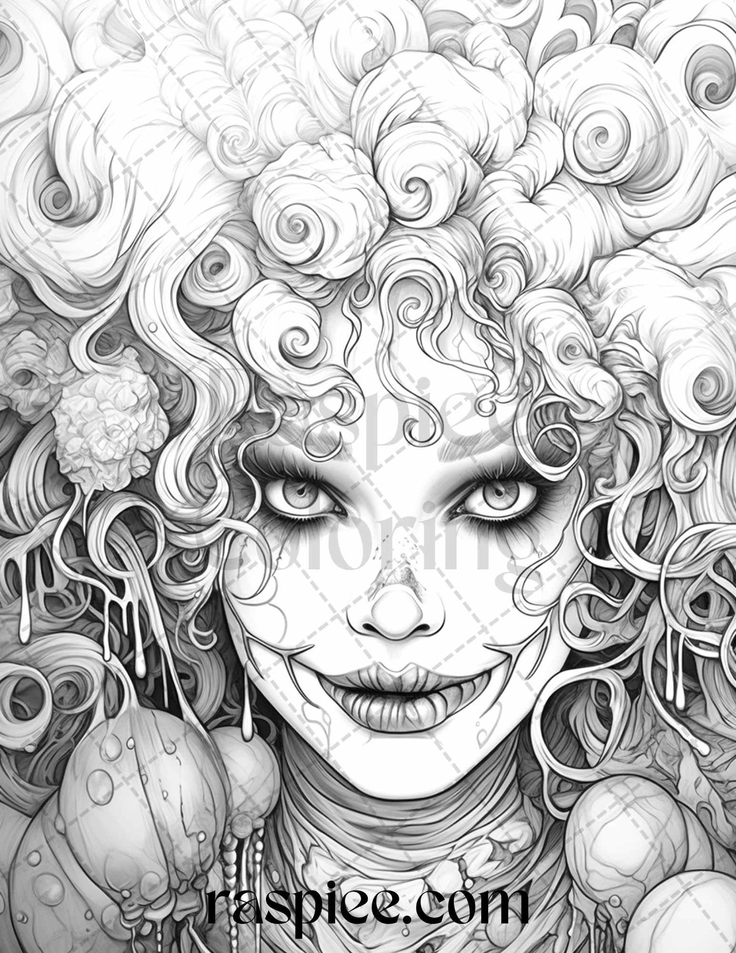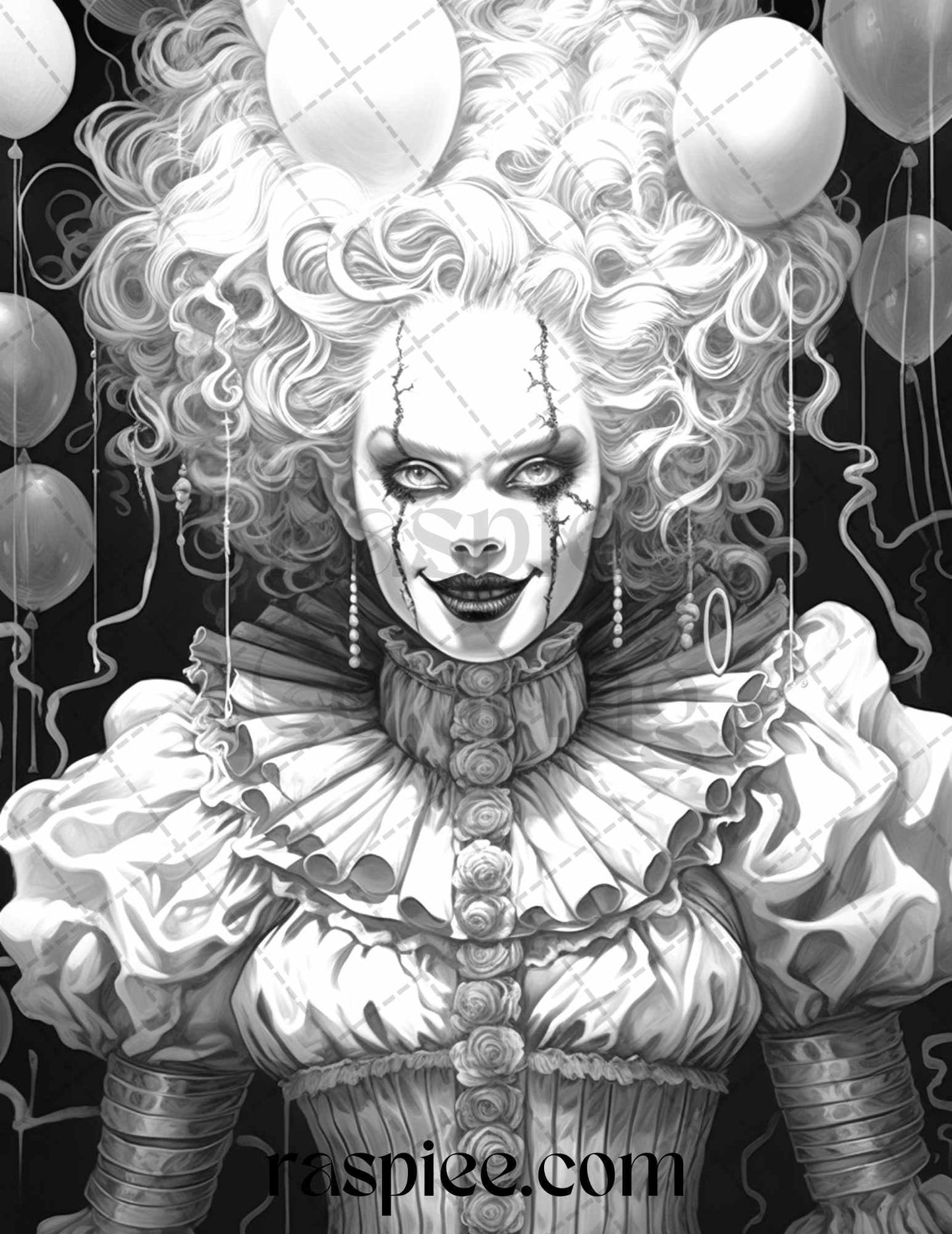 50 Scary Clown Girls Grayscale Coloring Pages Printable for Adults, PDF File Instant Download