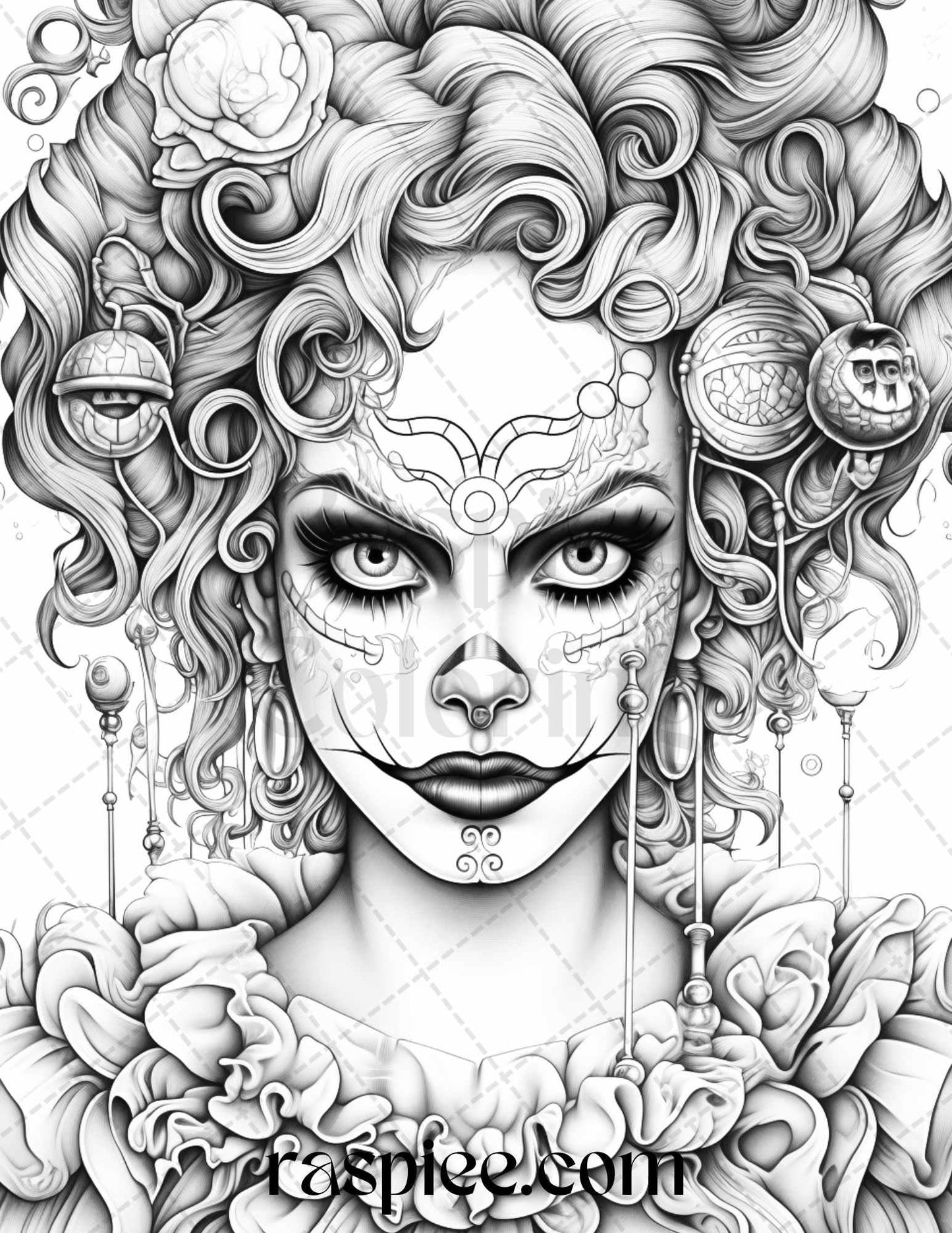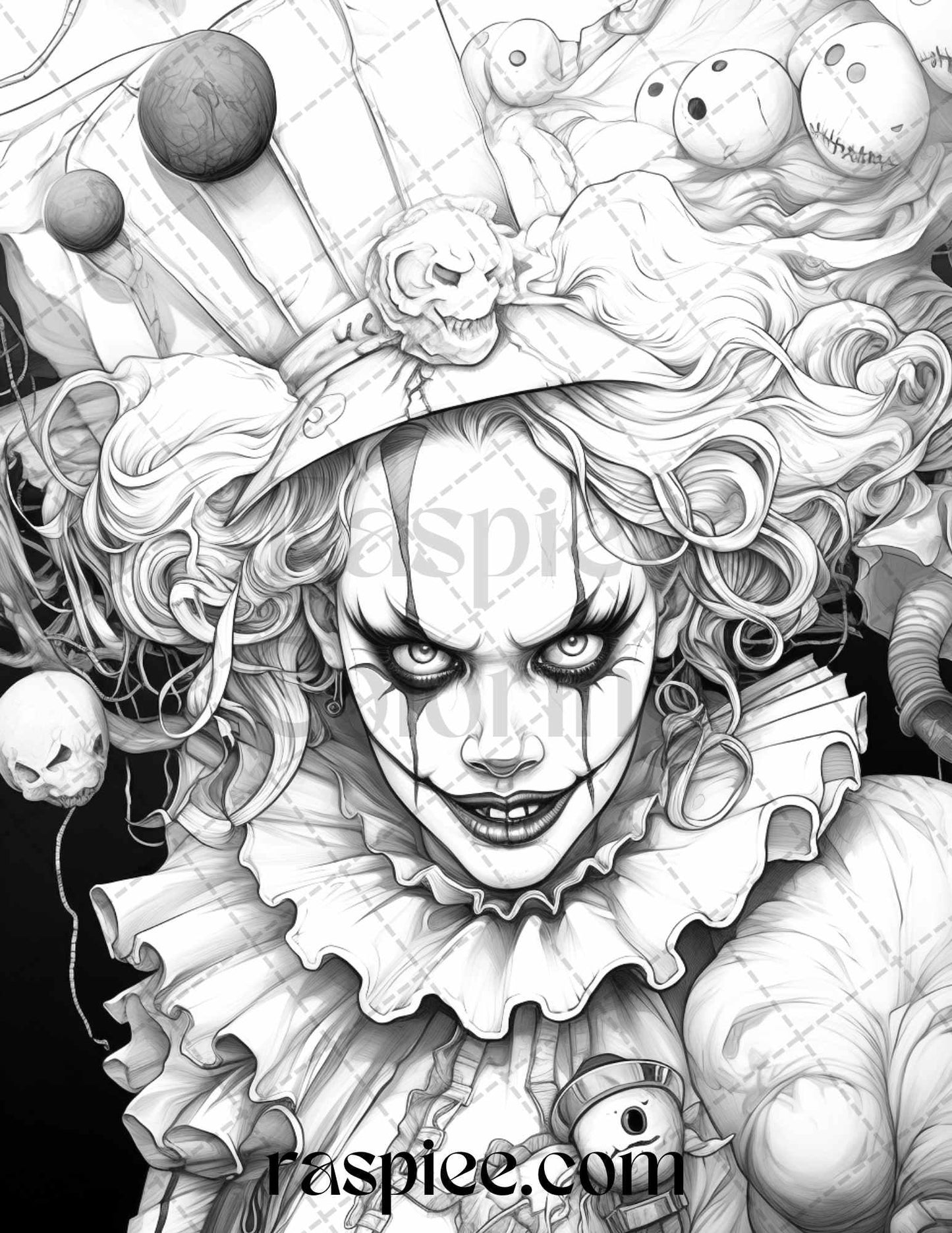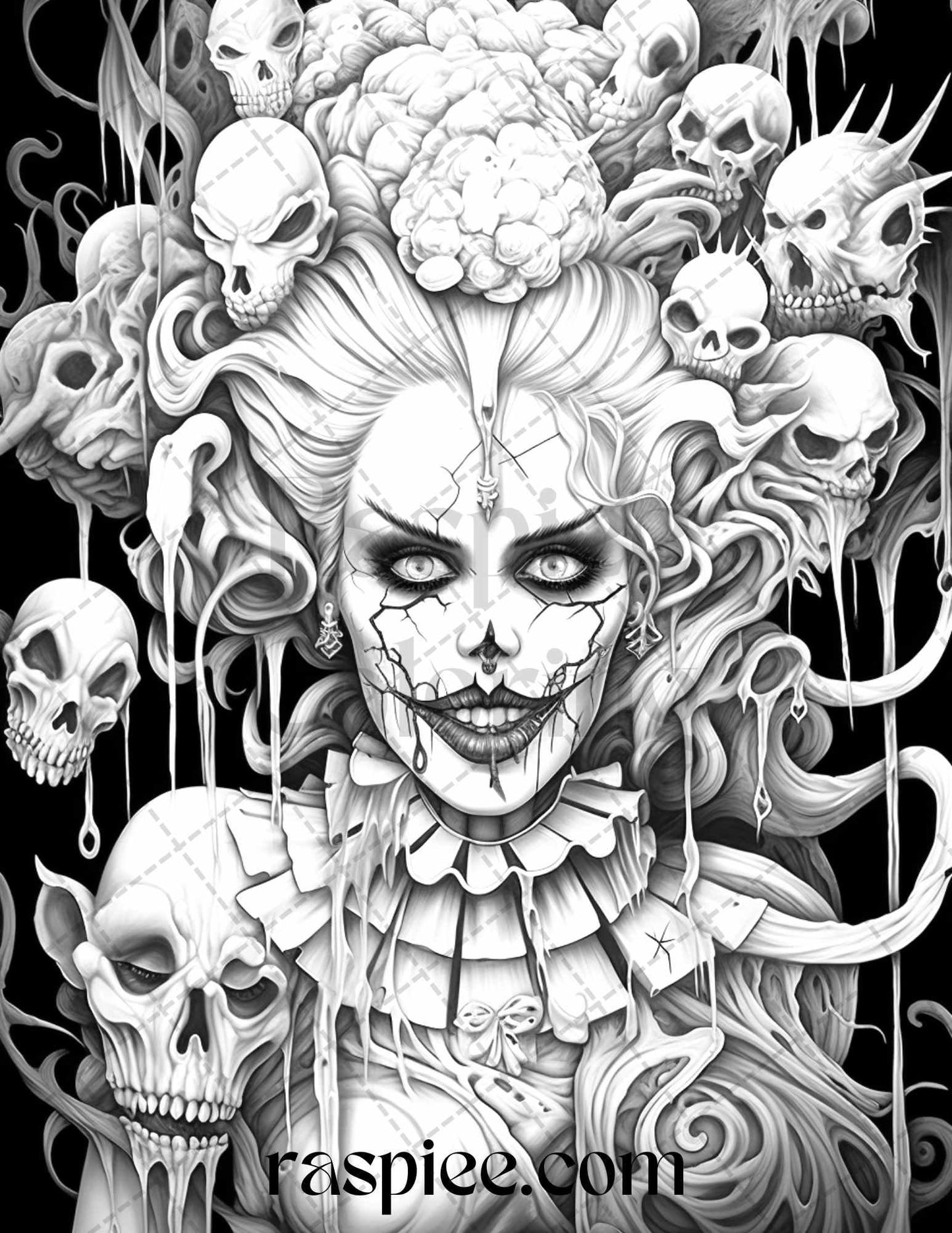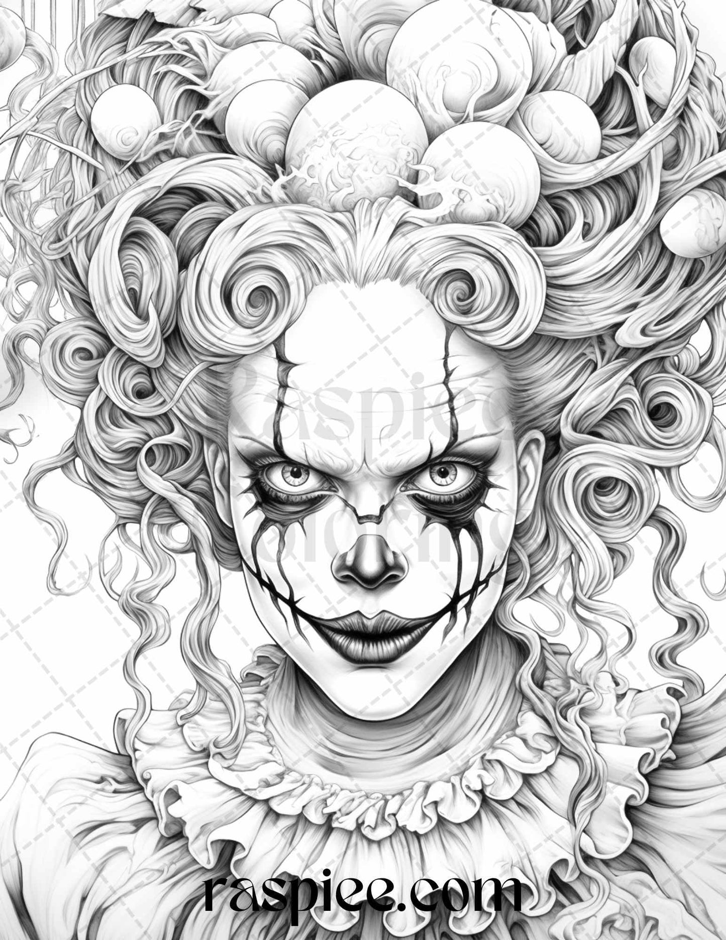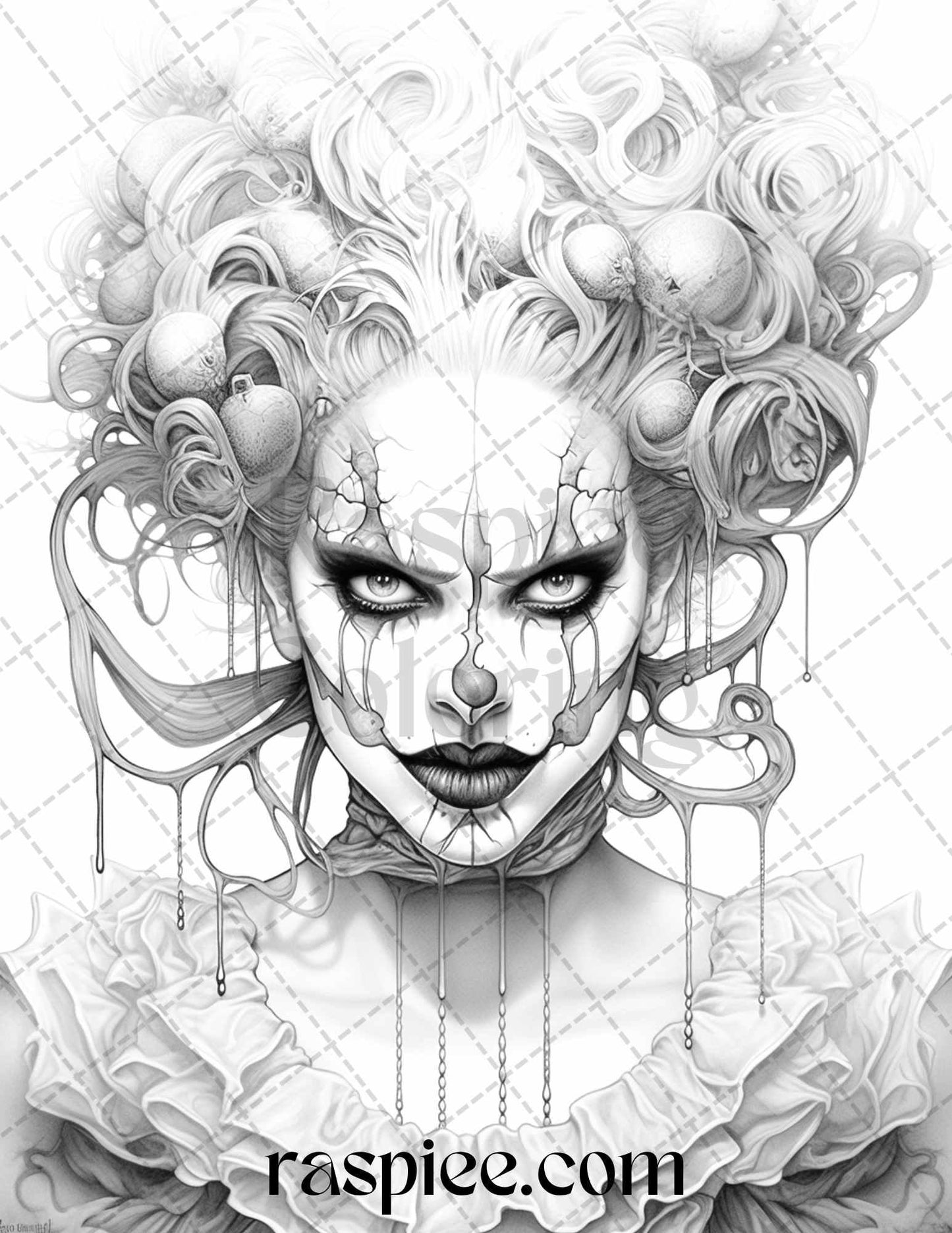 50 Scary Clown Girls Grayscale Coloring Pages Printable for Adults, PDF File Instant Download