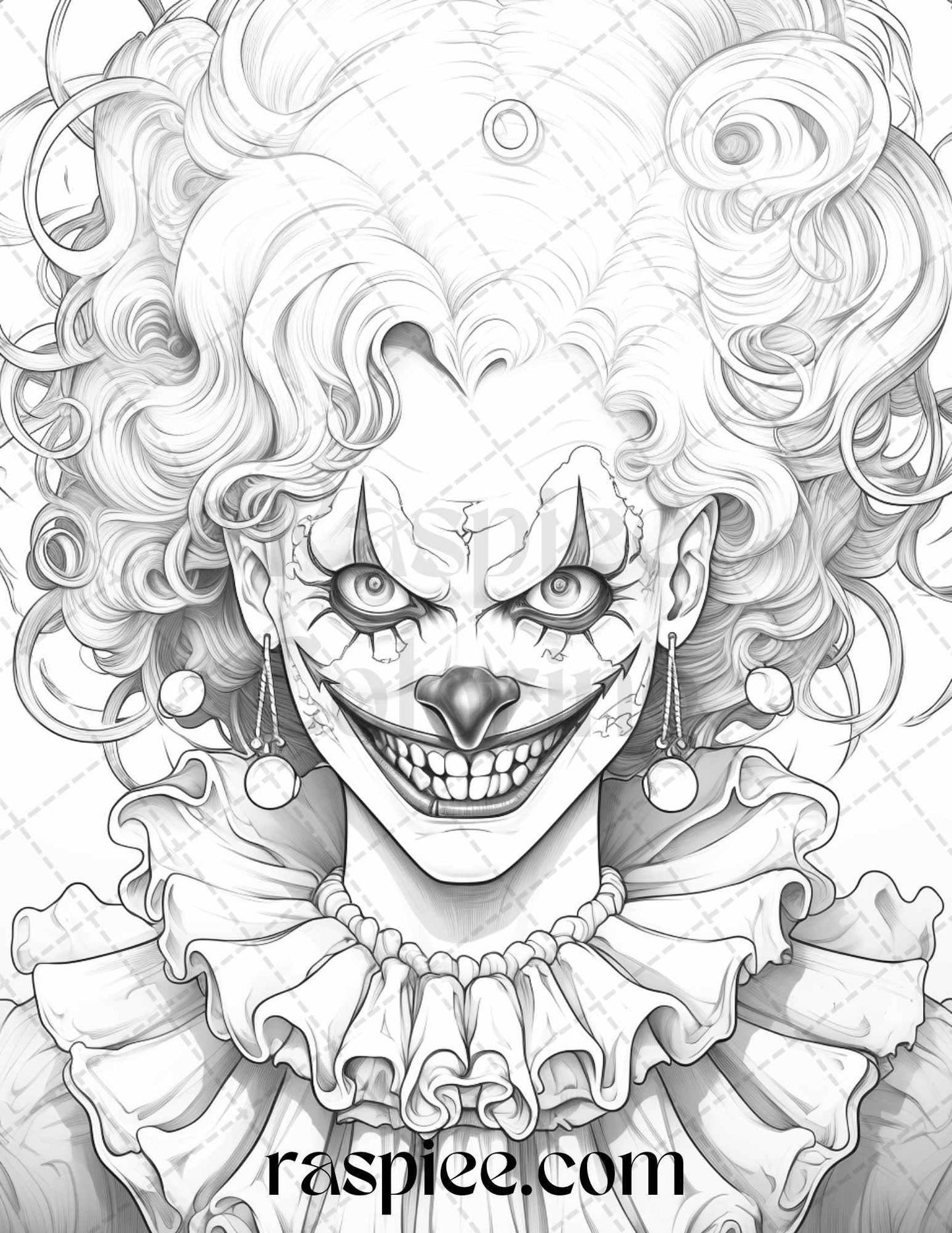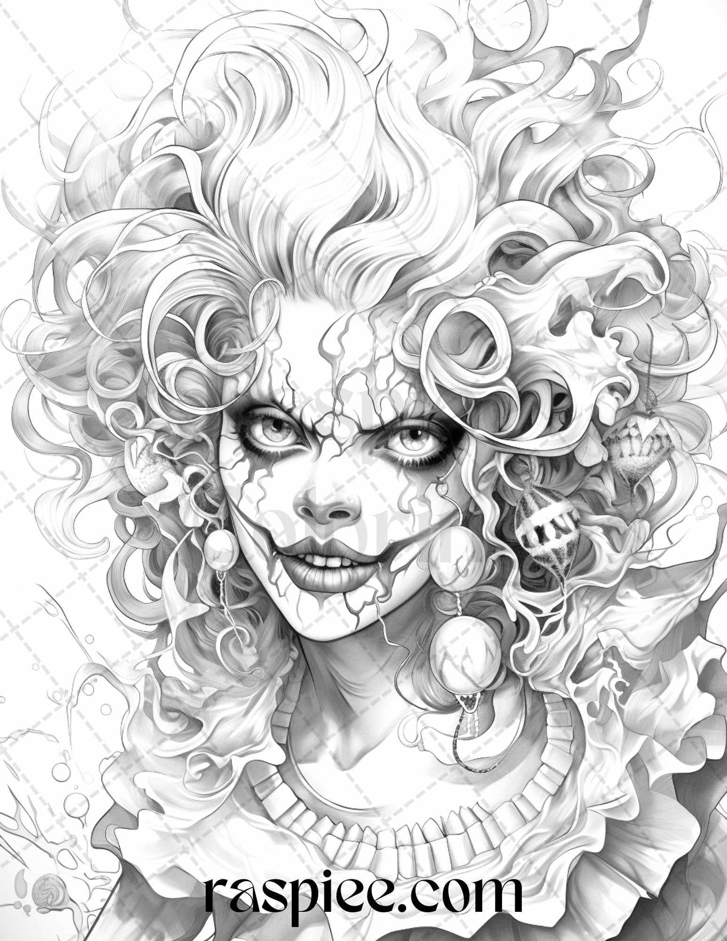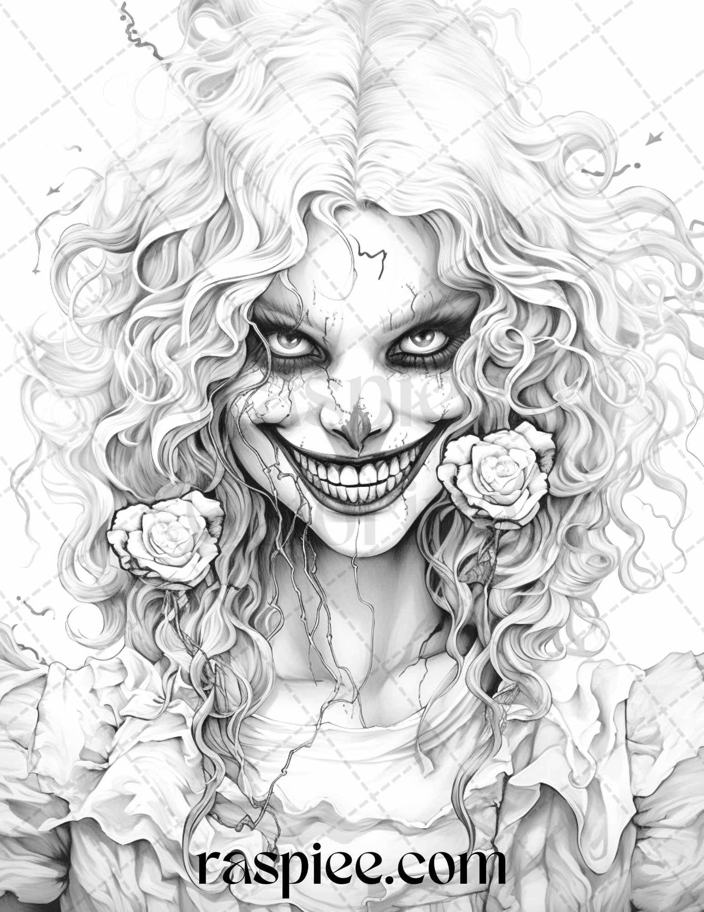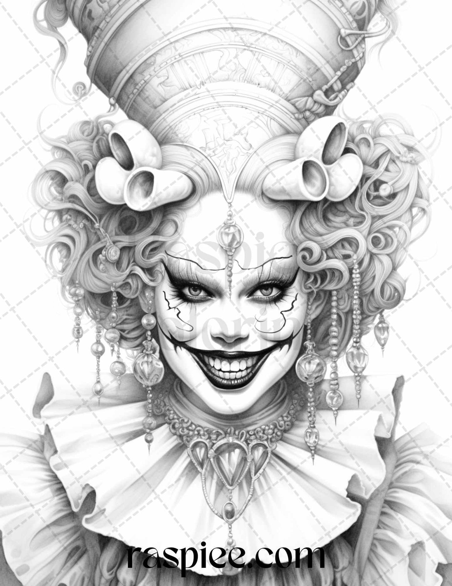 50 Scary Clown Girls Grayscale Coloring Pages Printable for Adults, PDF File Instant Download