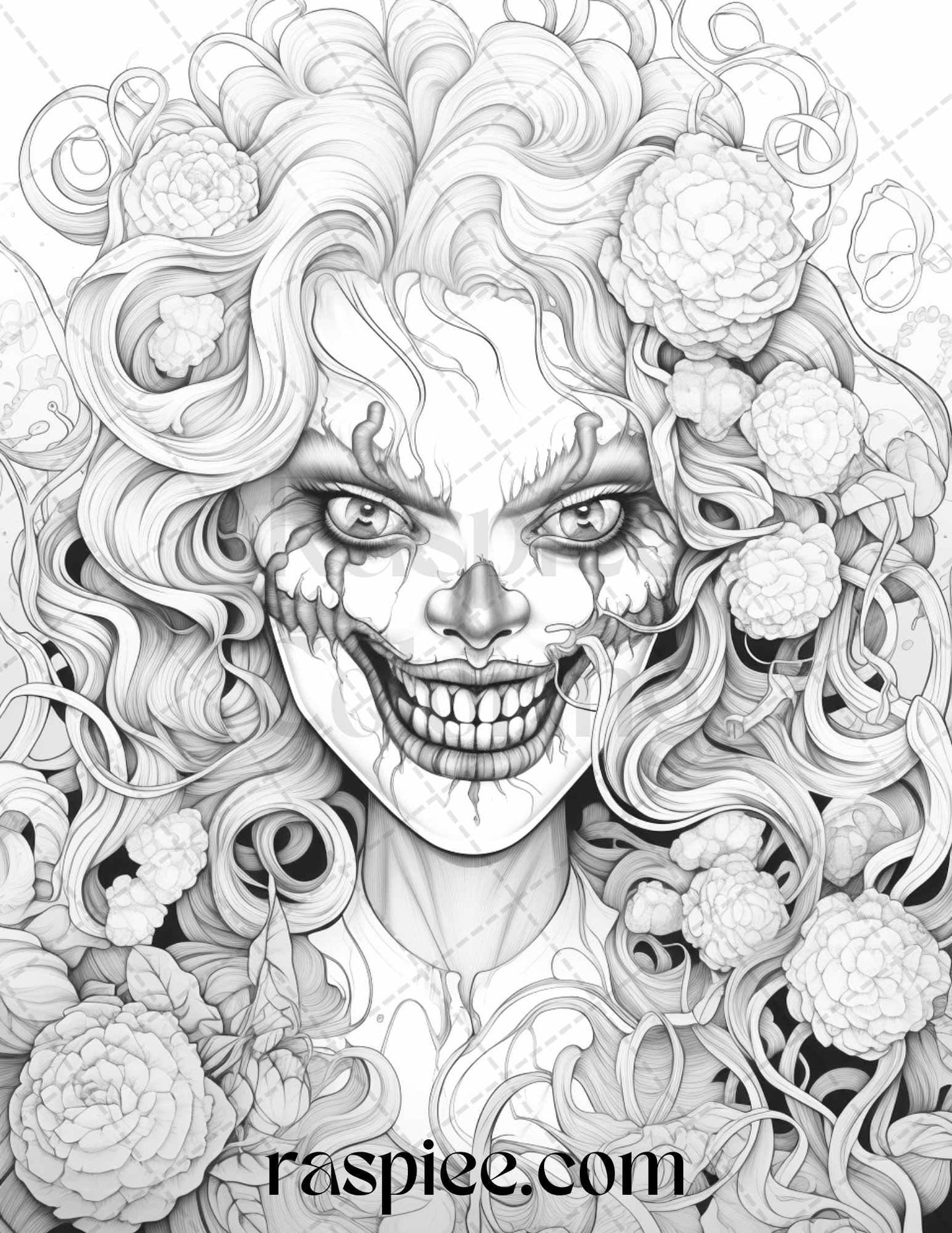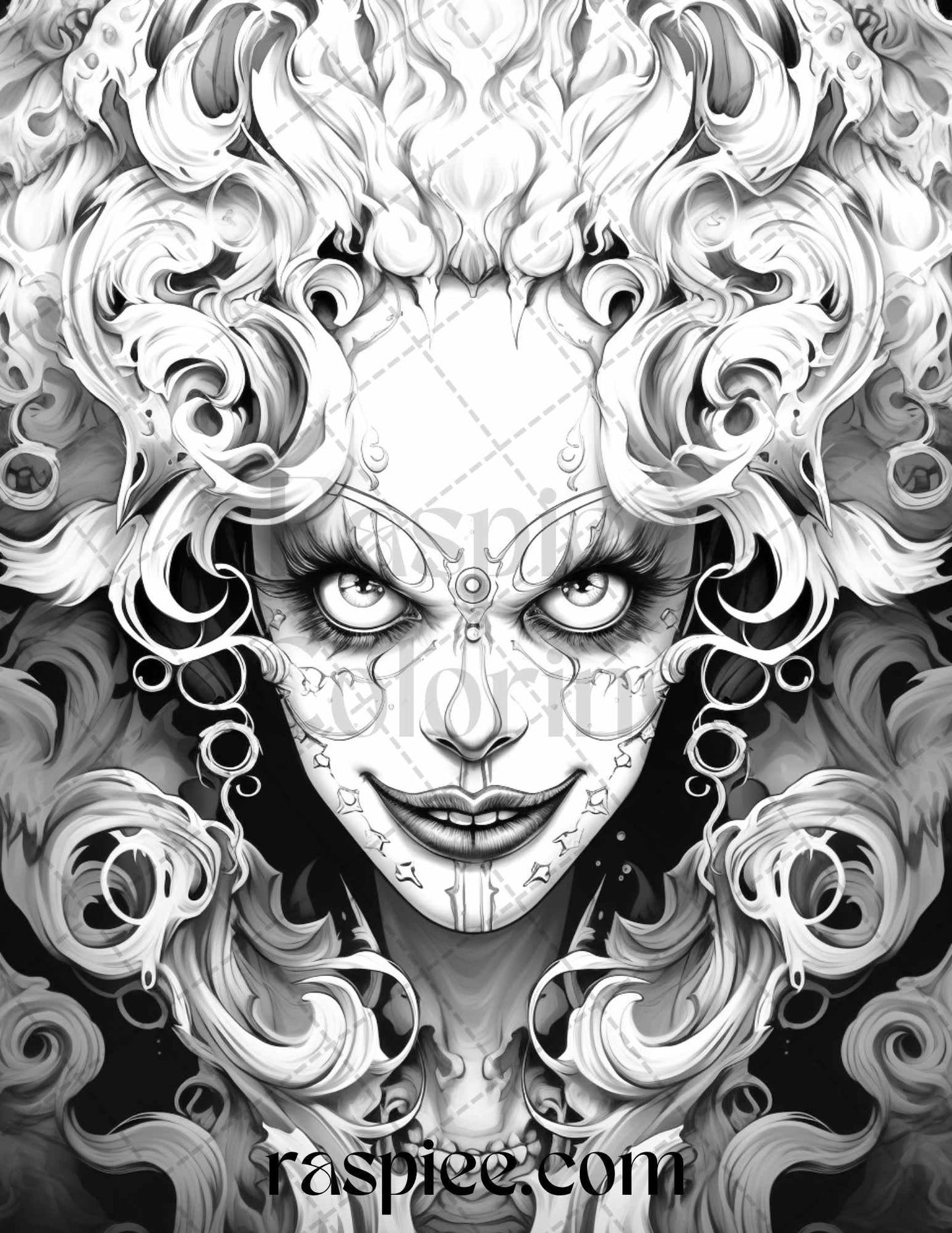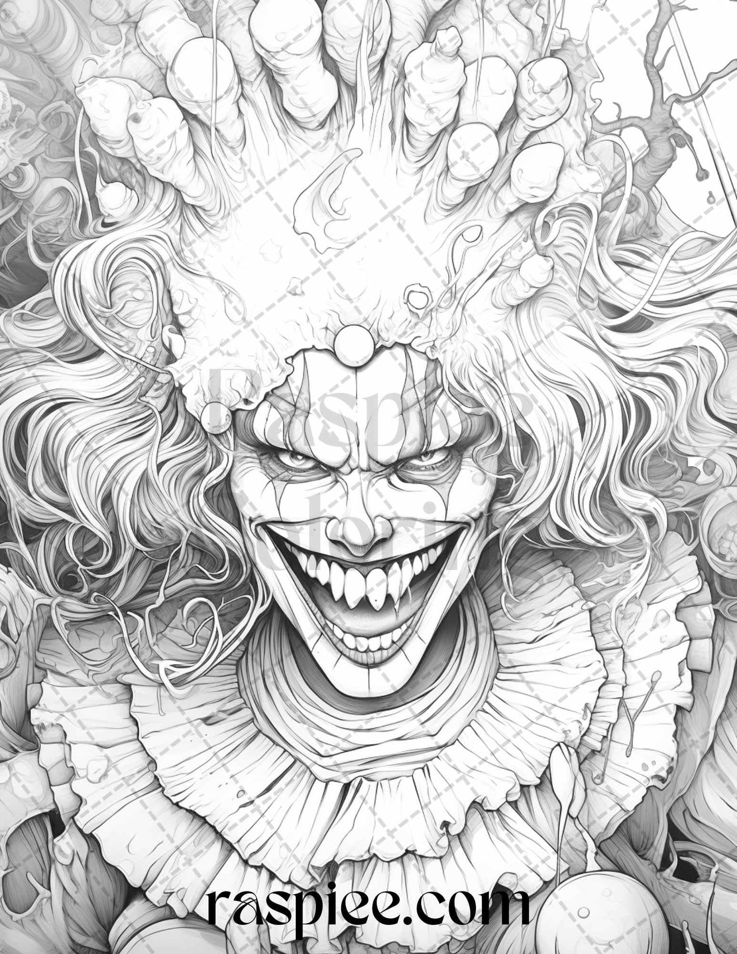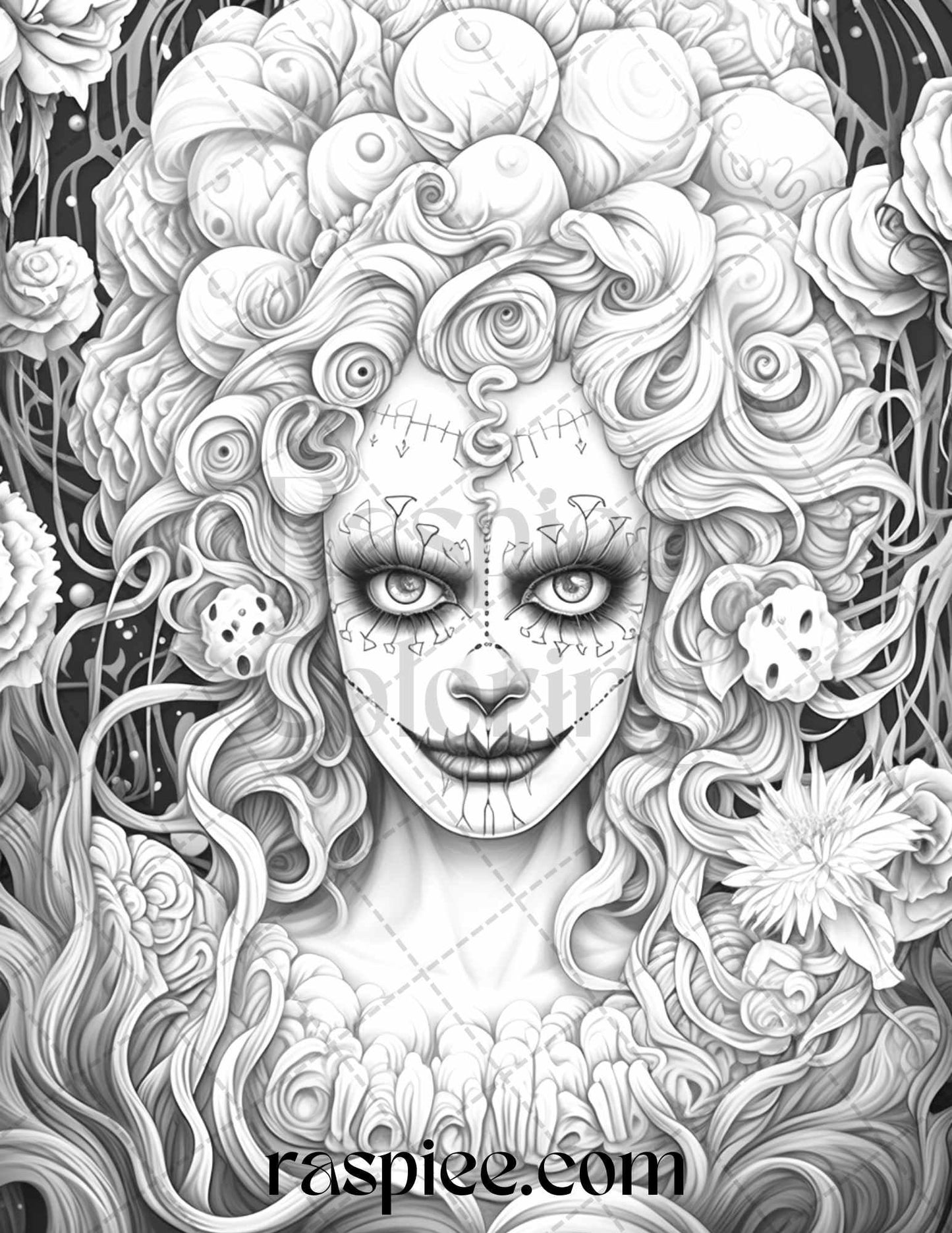 50 Scary Clown Girls Grayscale Coloring Pages Printable for Adults, PDF File Instant Download