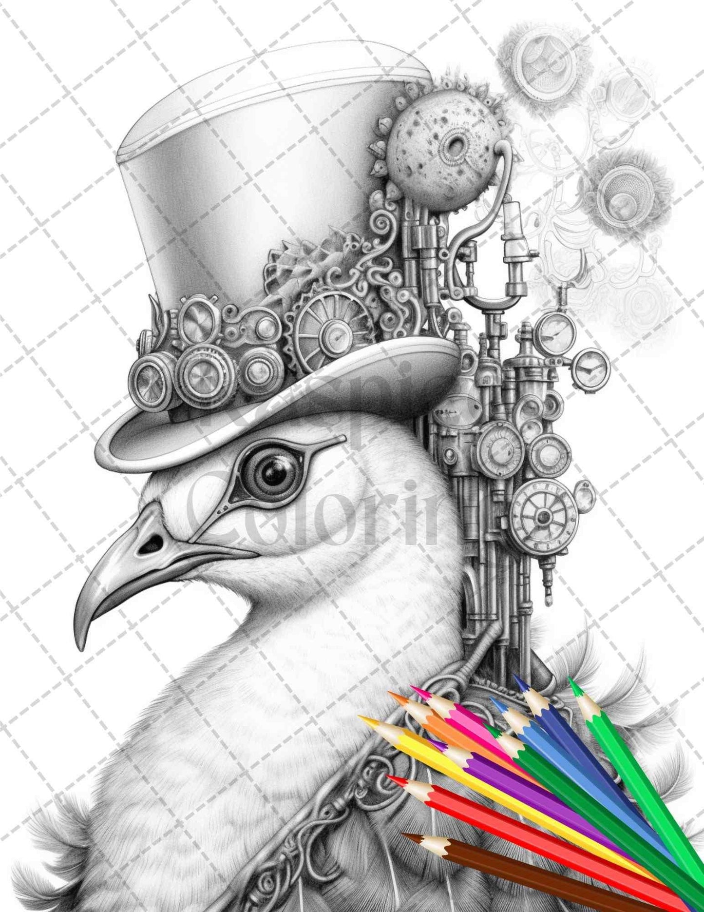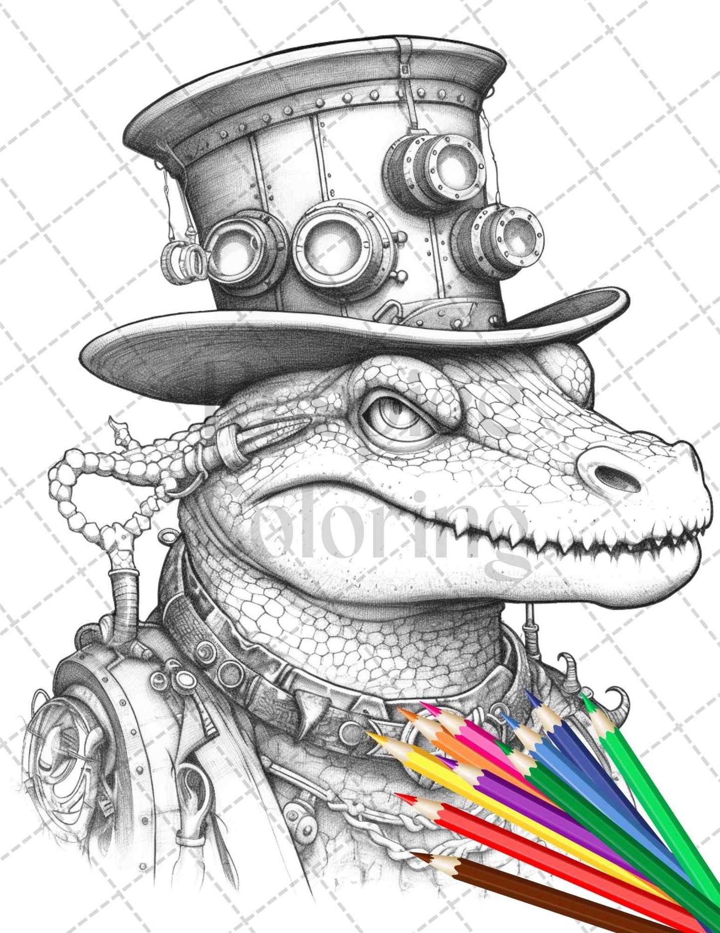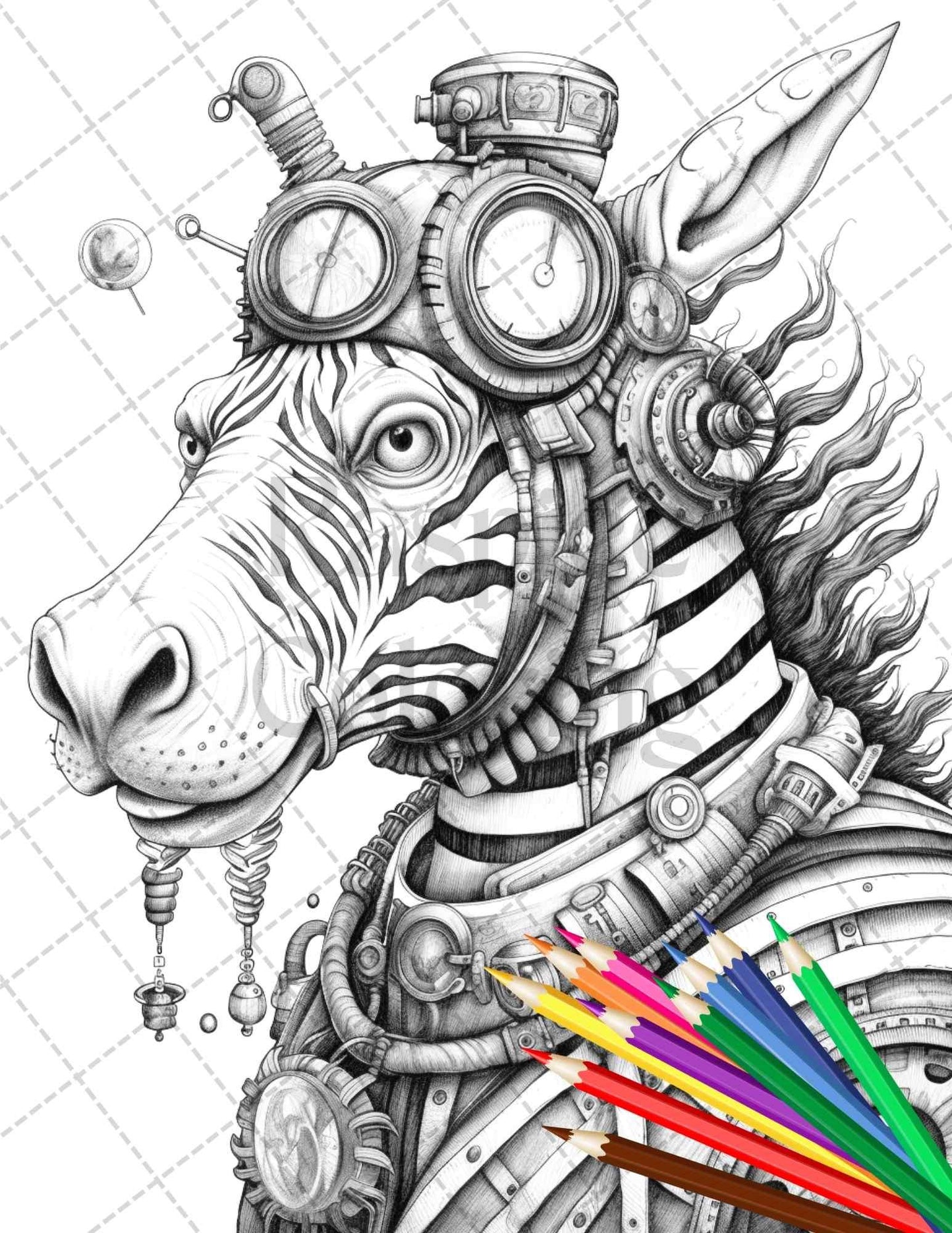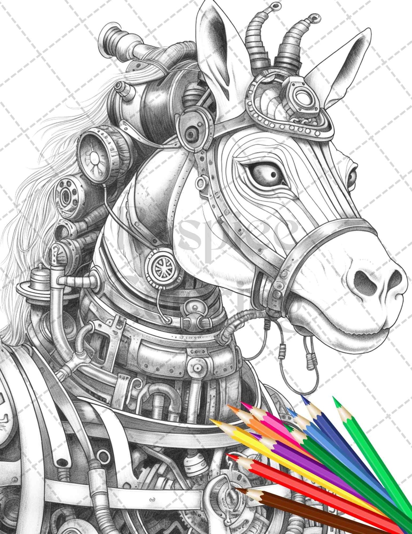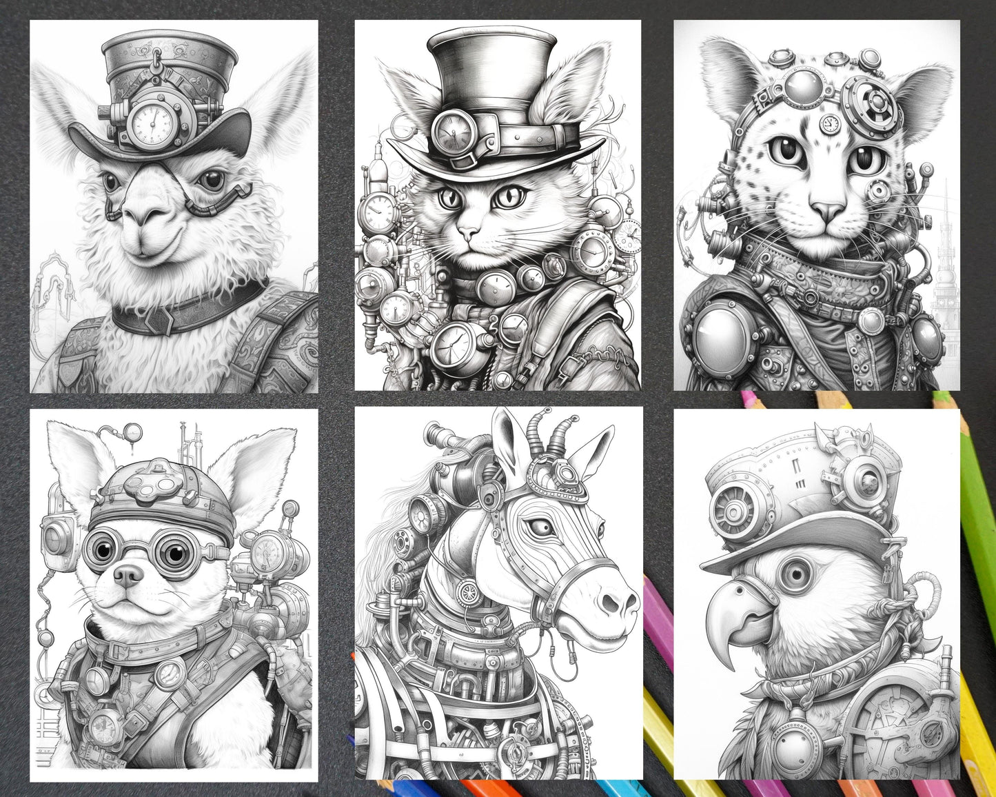 60 Steampunk Animals Grayscale Coloring Pages Printable for Adults, PDF File Instant Download