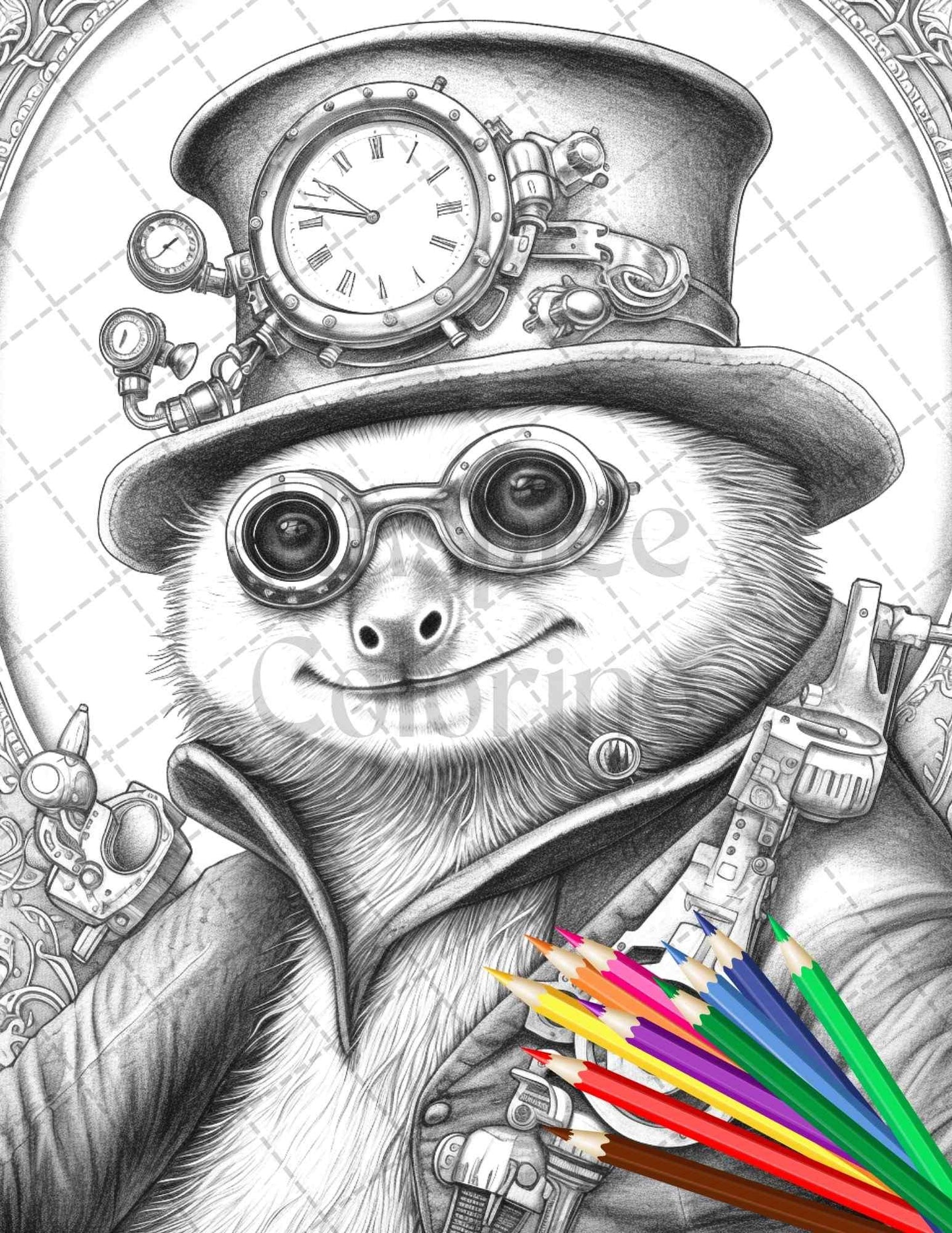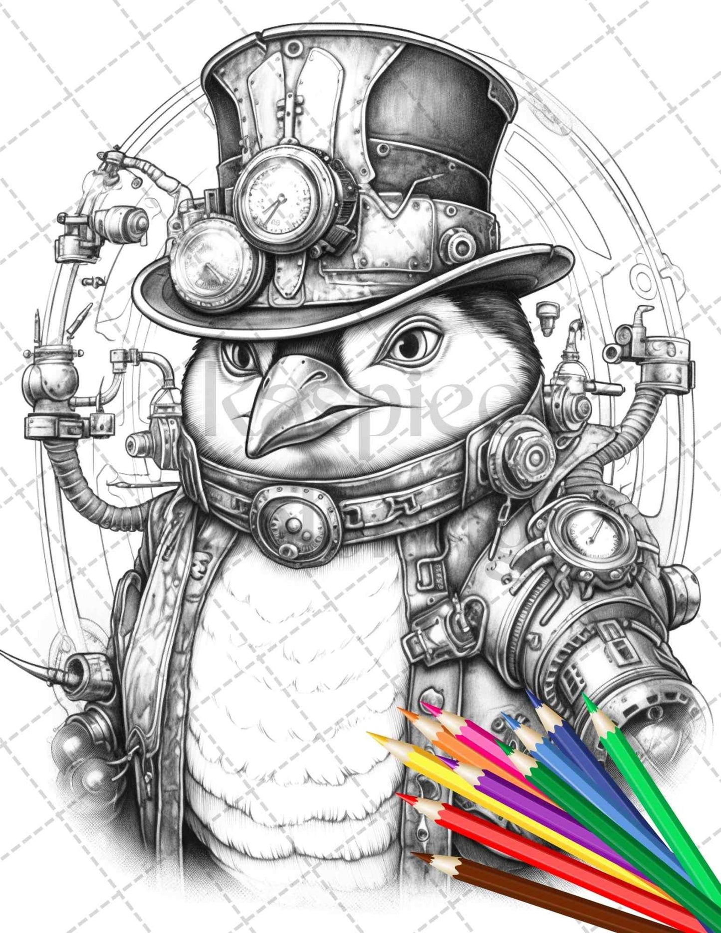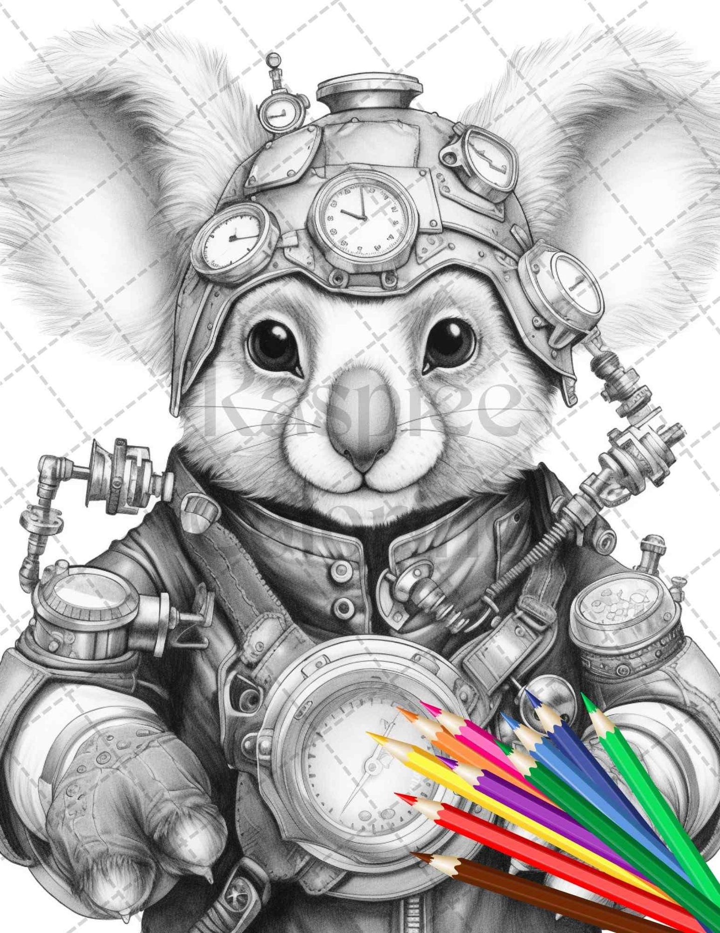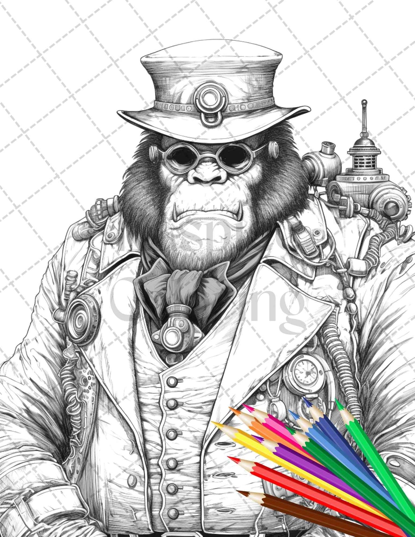 60 Steampunk Animals Grayscale Coloring Pages Printable for Adults, PDF File Instant Download