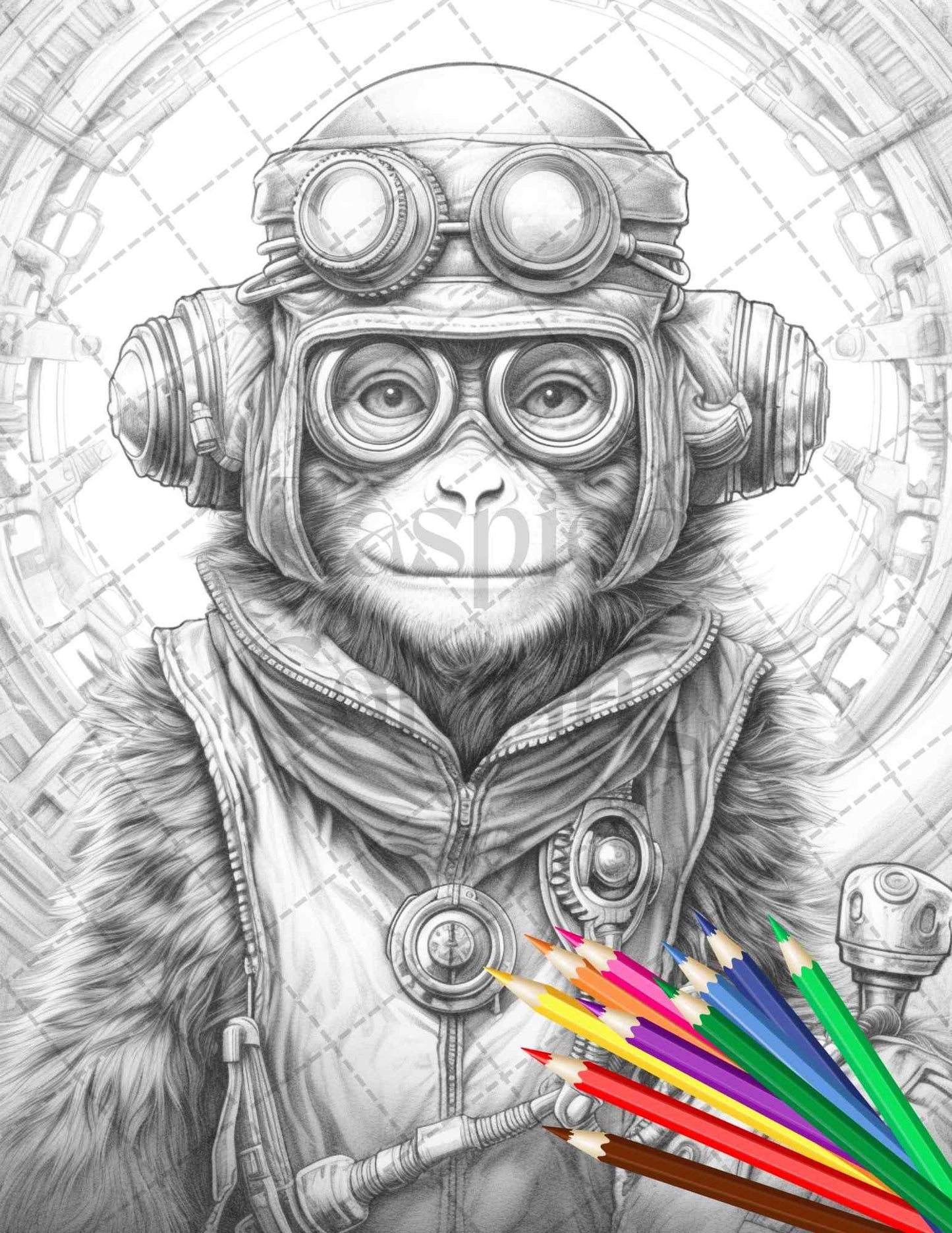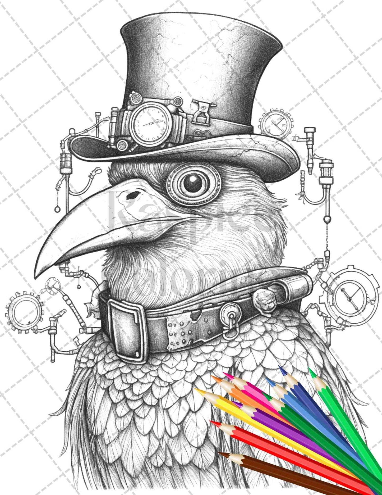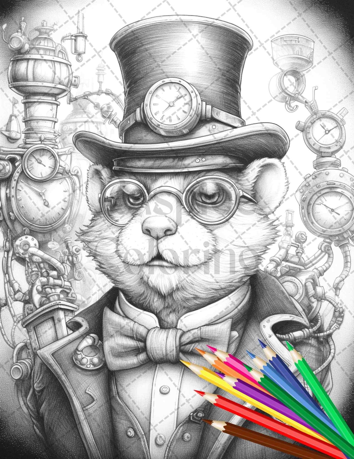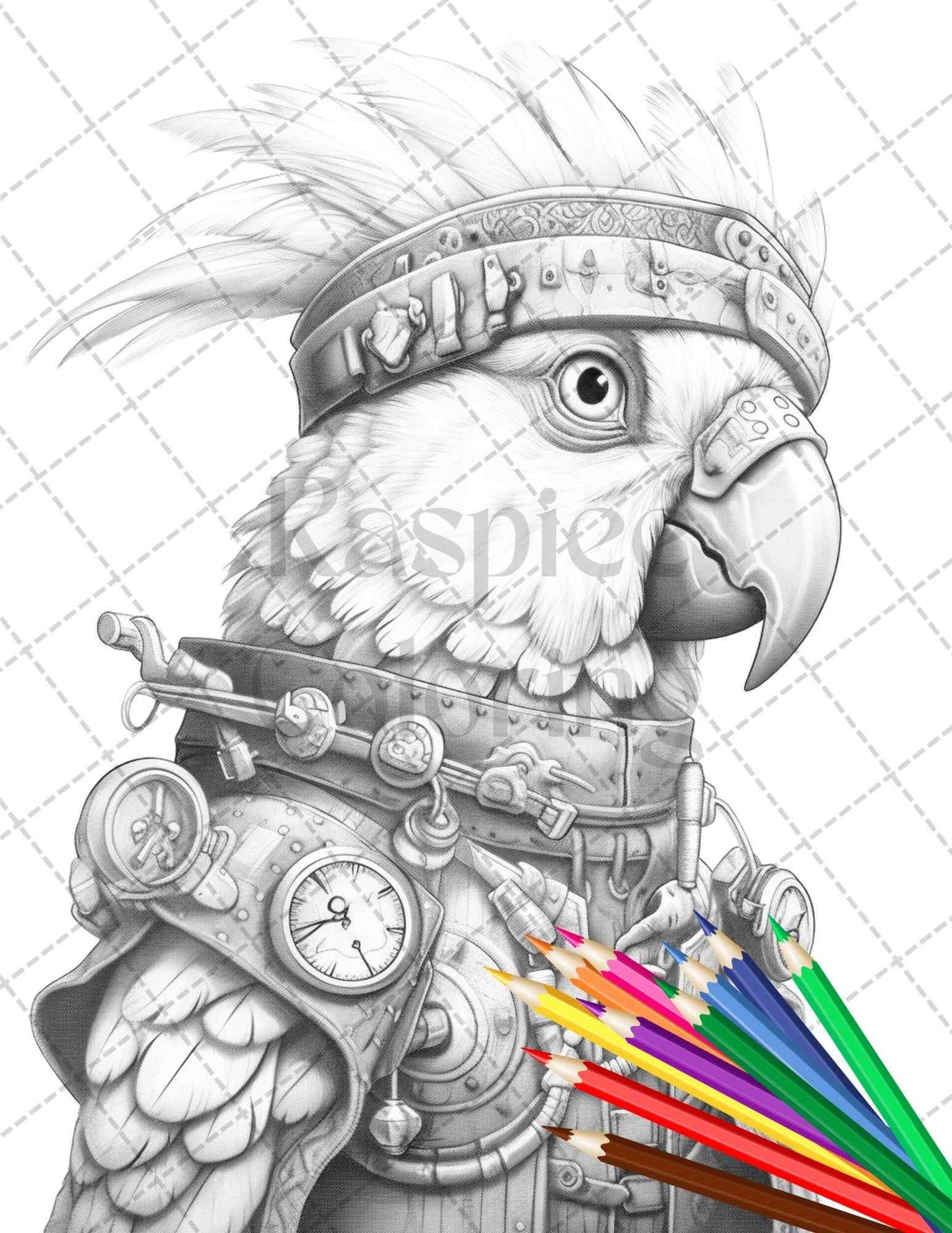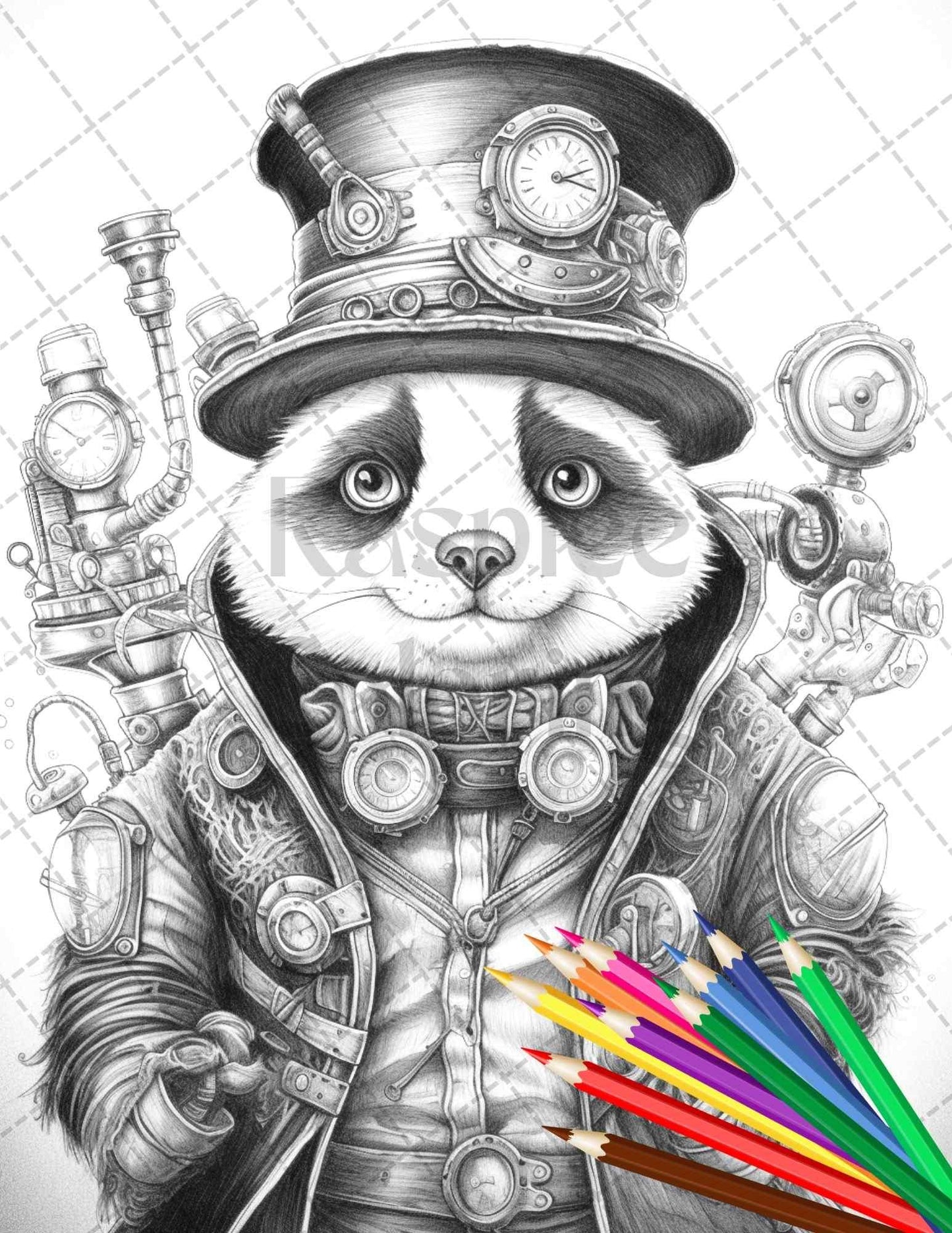 60 Steampunk Animals Grayscale Coloring Pages Printable for Adults, PDF File Instant Download