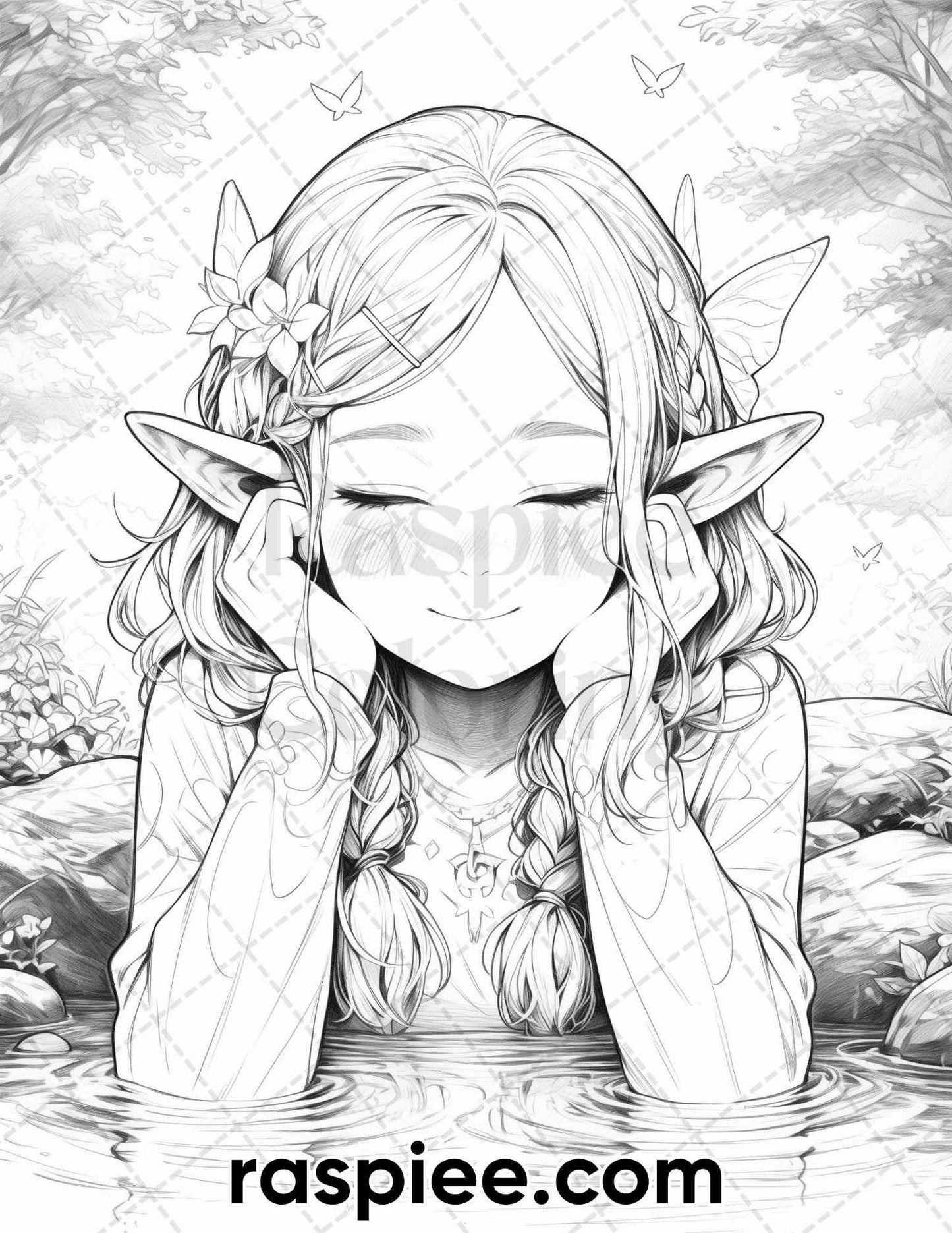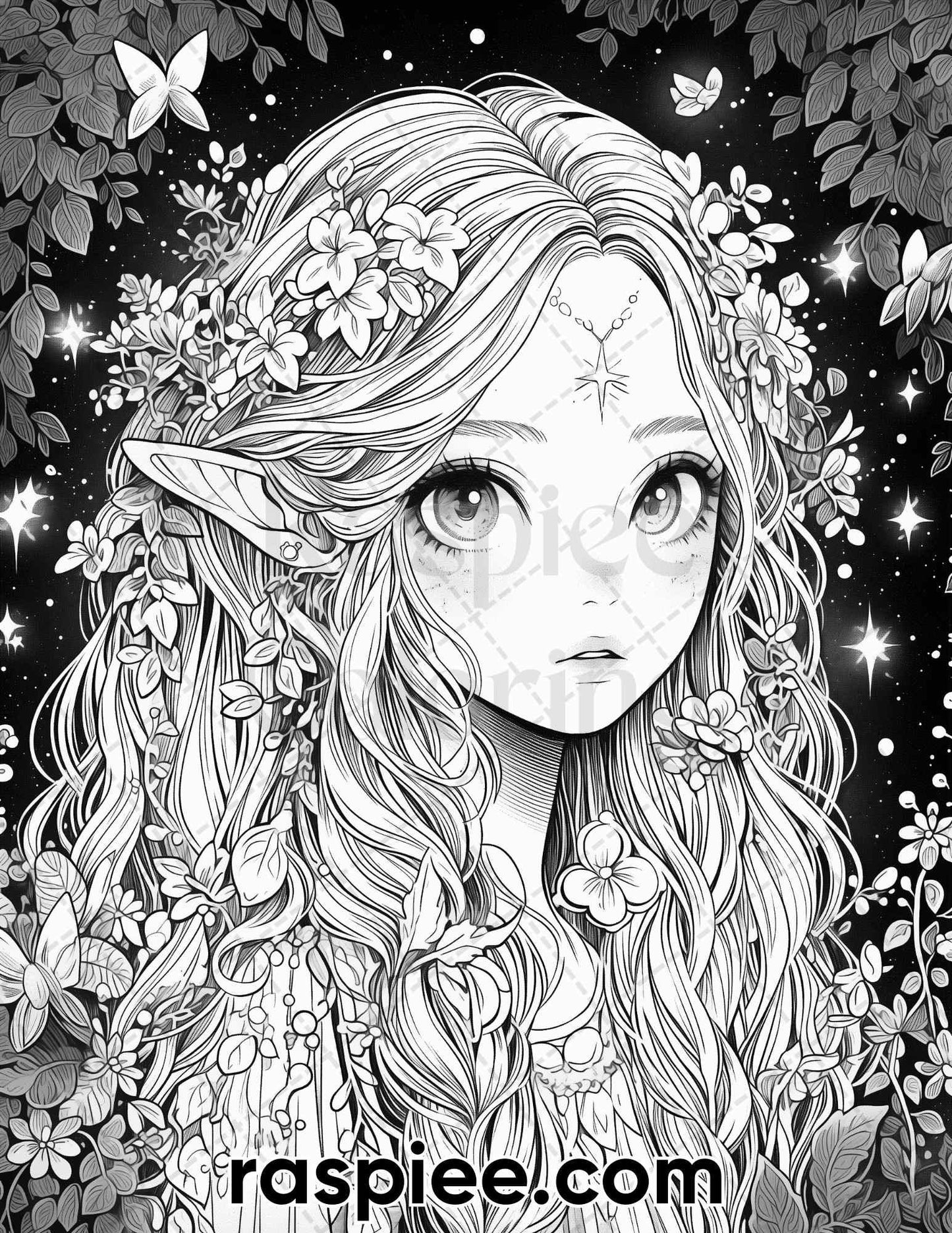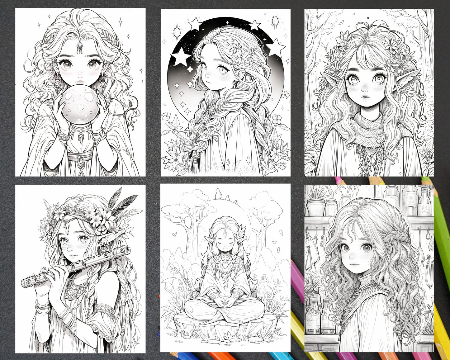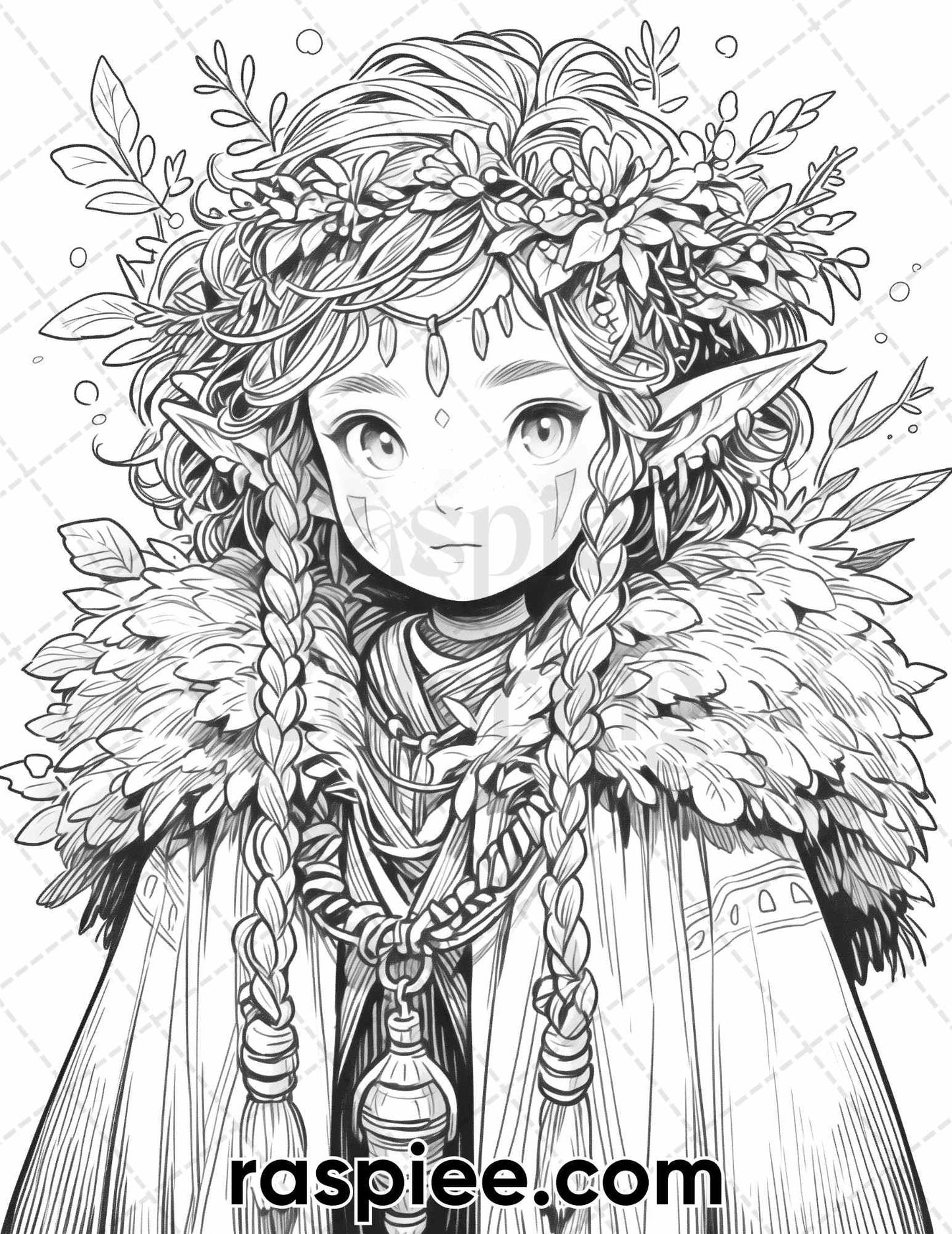 52 Cute Druid Girl Grayscale Coloring Pages for Adults, Printable PDF Instant Download