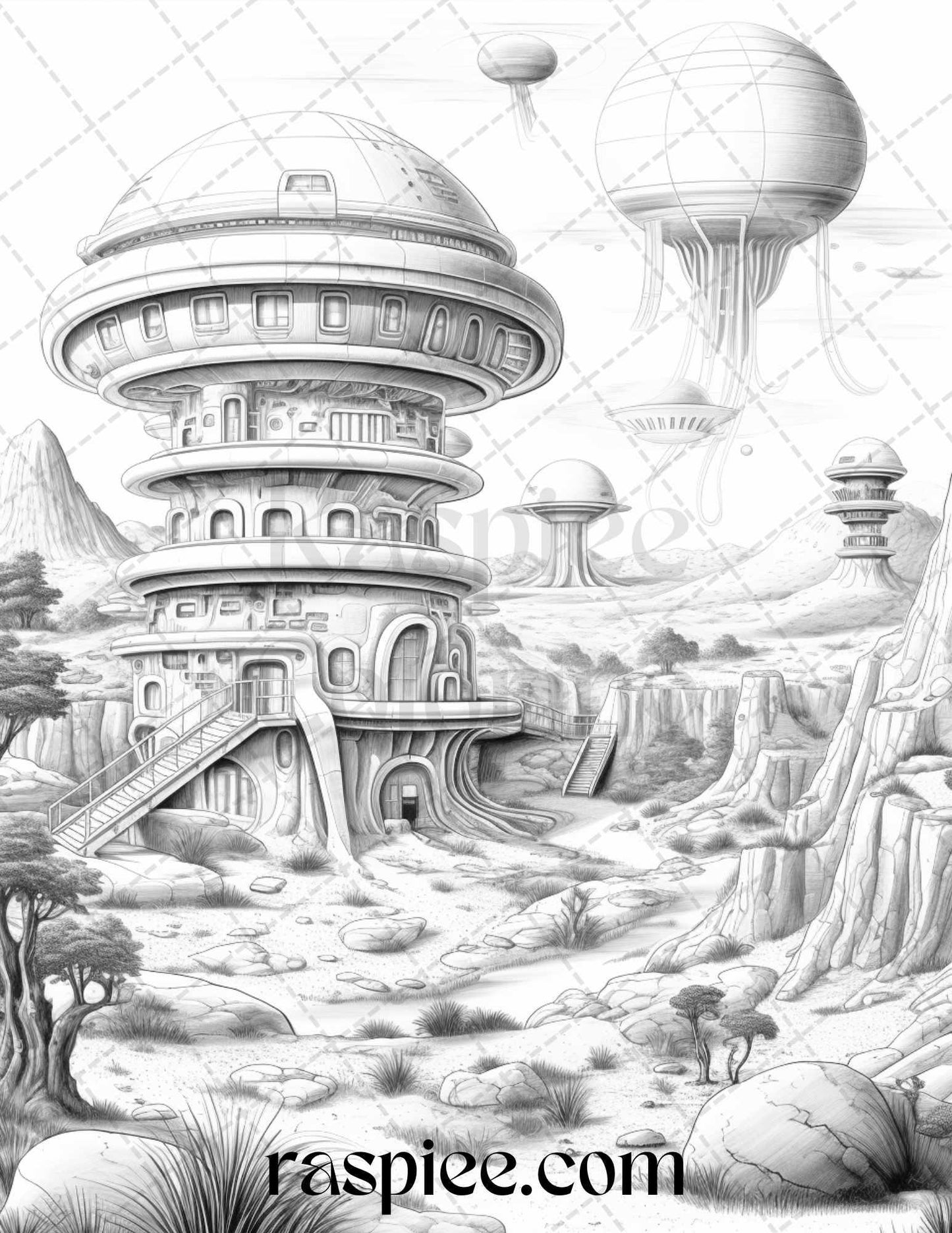 Unleash Your Imagination These grayscale coloring pages are not only a creative outlet but also a way to spark your imagination. Design the appearances of these alien houses, envision the beings who might inhabit them, and craft your own cosmic narratives.