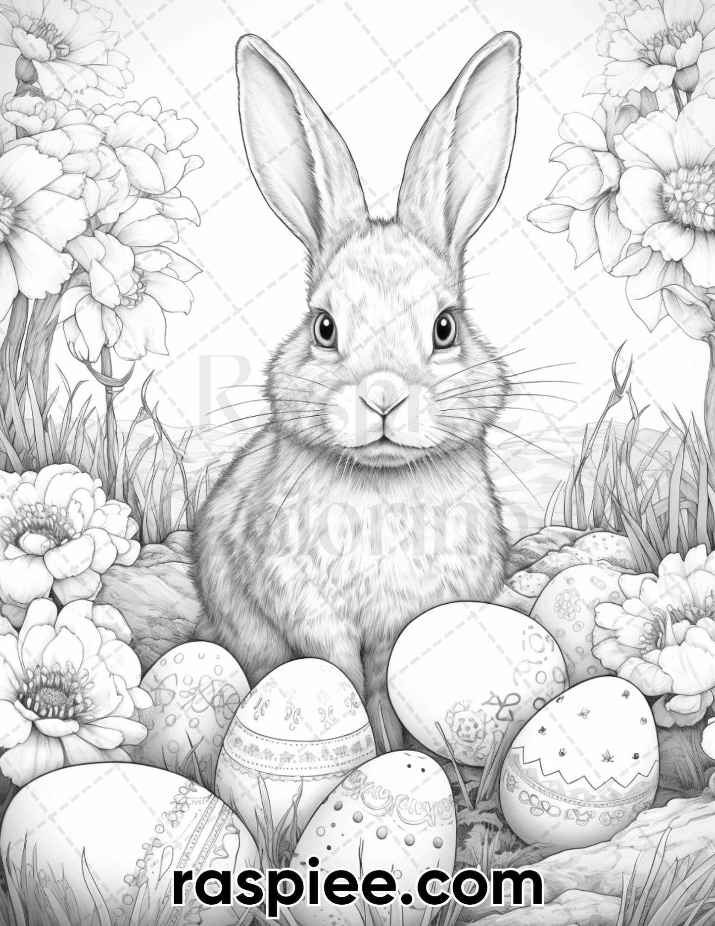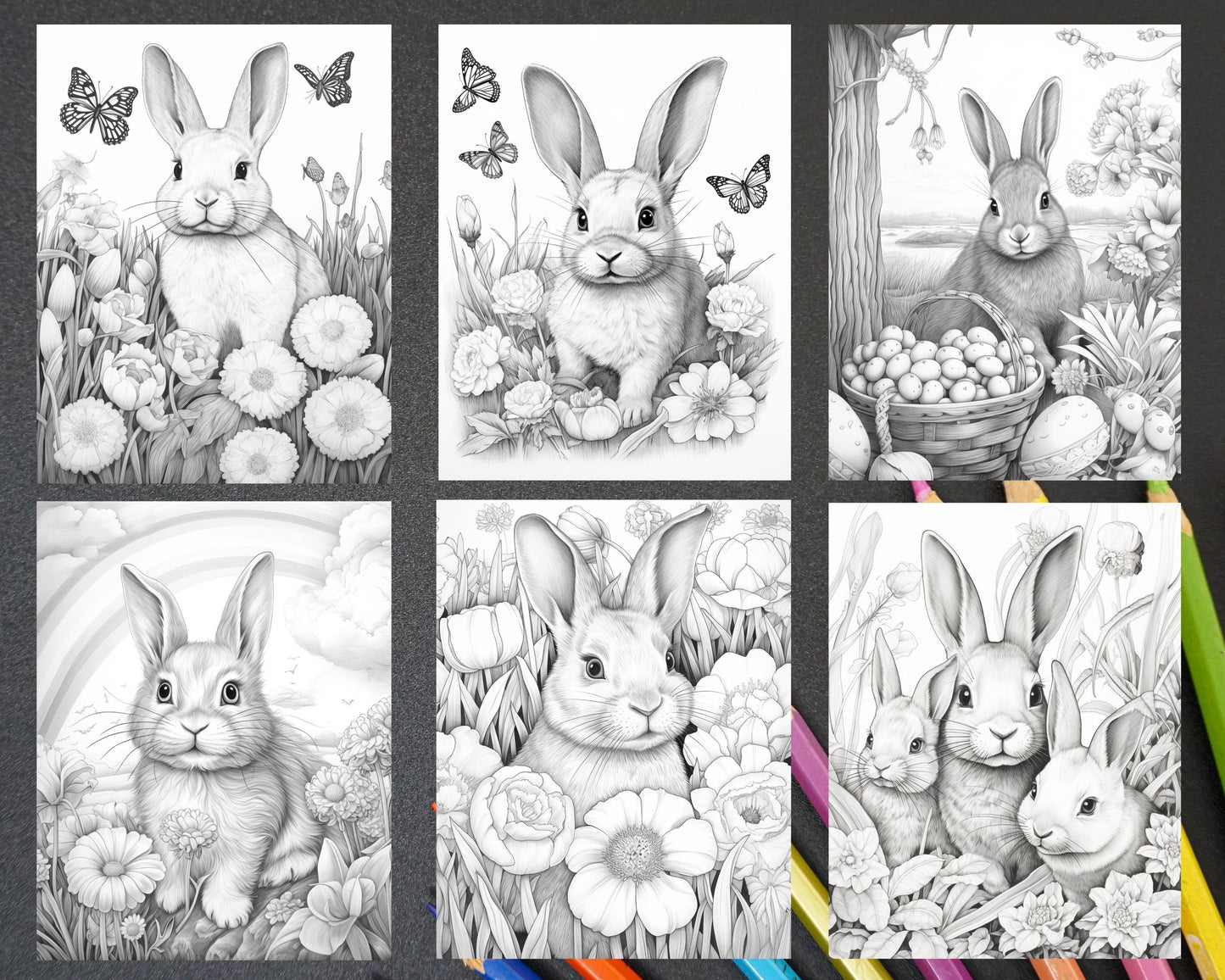 40 Easter Bunny Grayscale Adult Coloring Pages, Printable PDF Instant Download