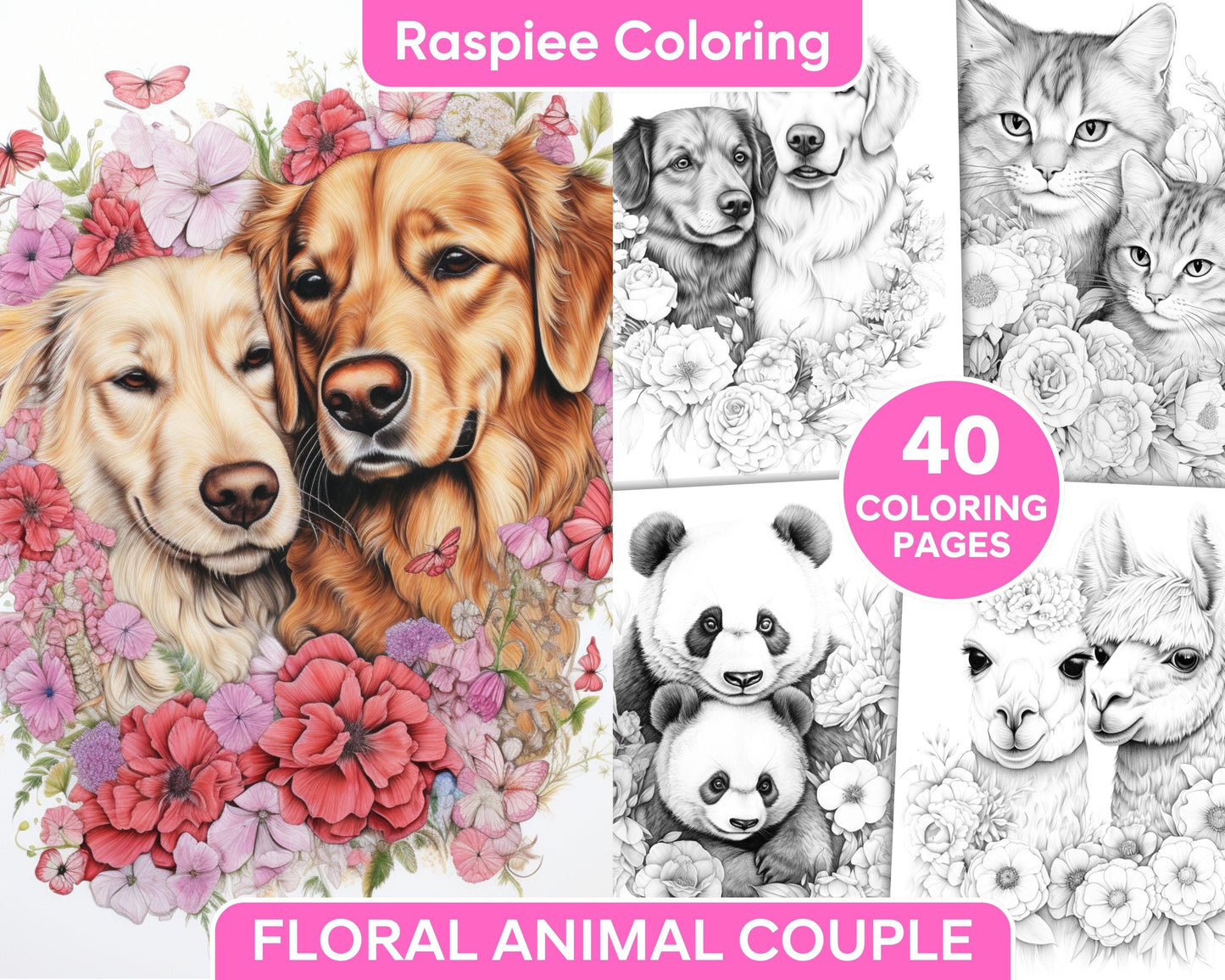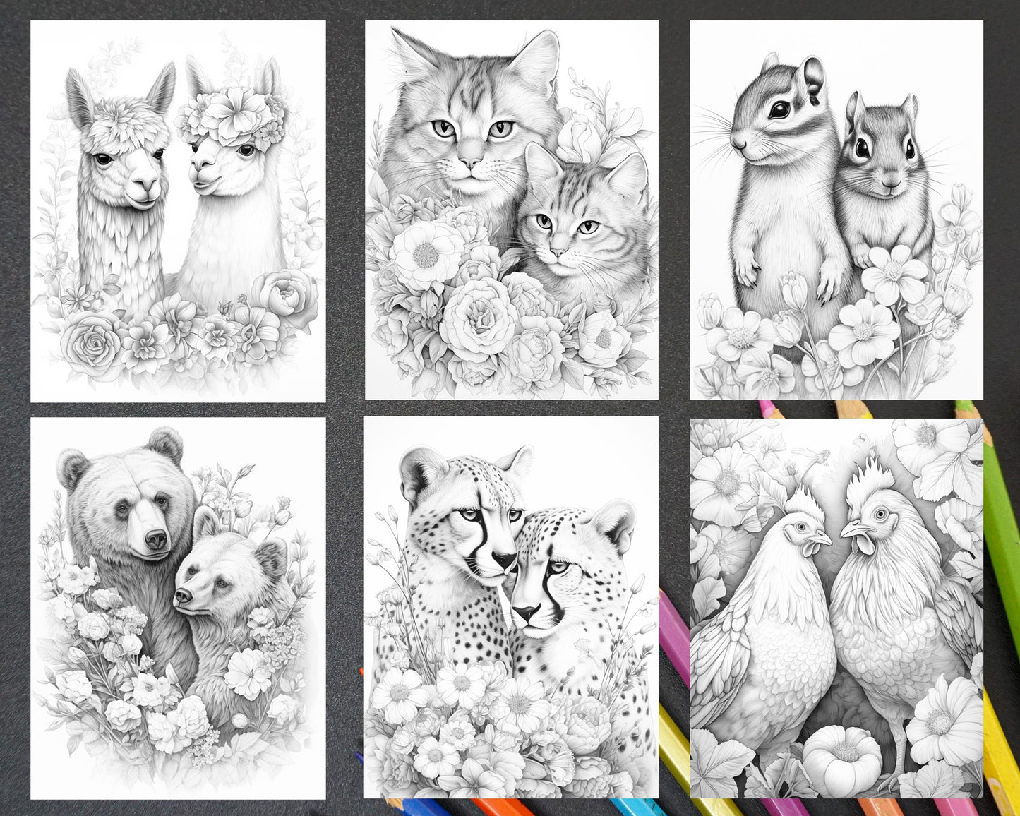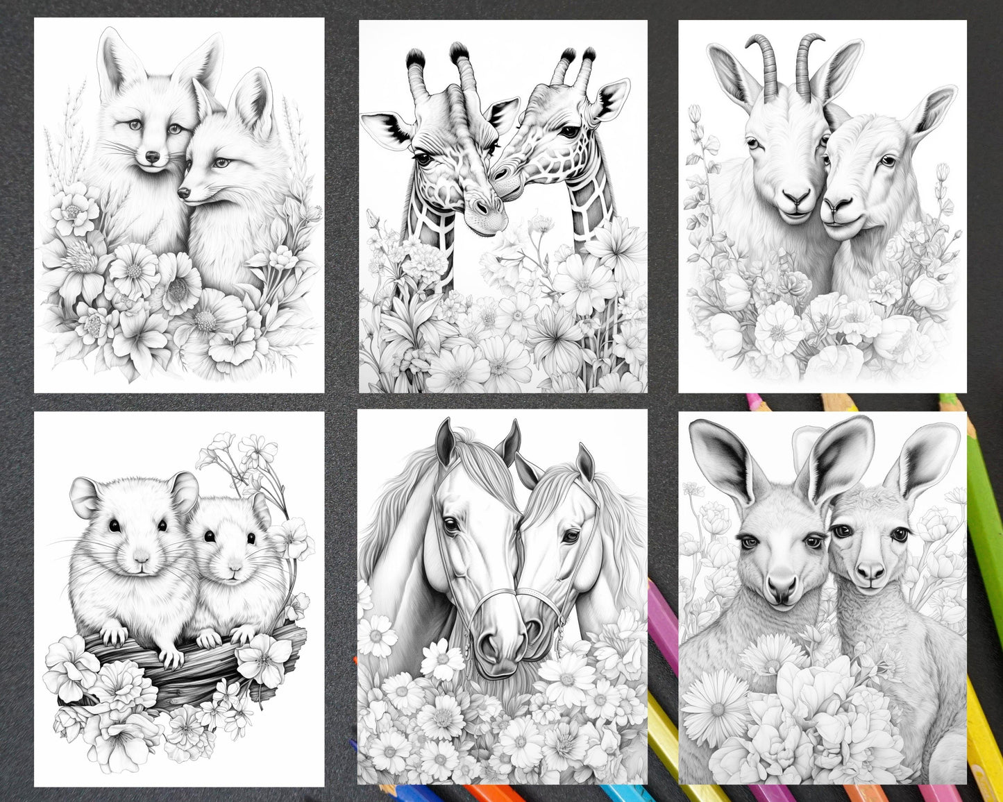40 Floral Animal Couple Grayscale Coloring Pages for Adults, Printable PDF Instant Download
