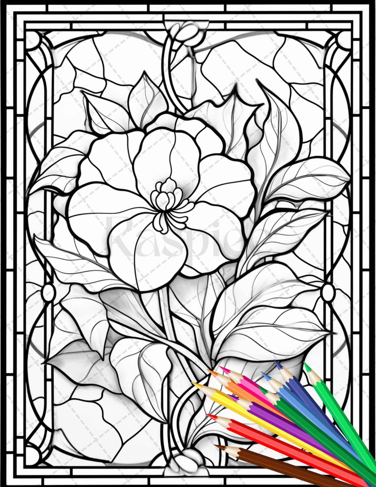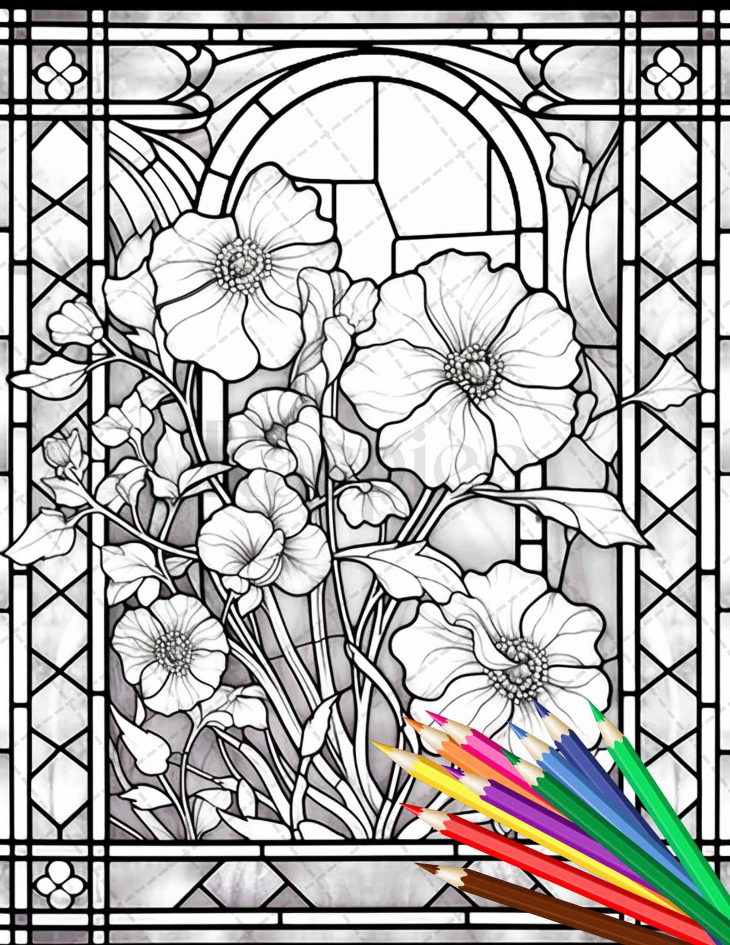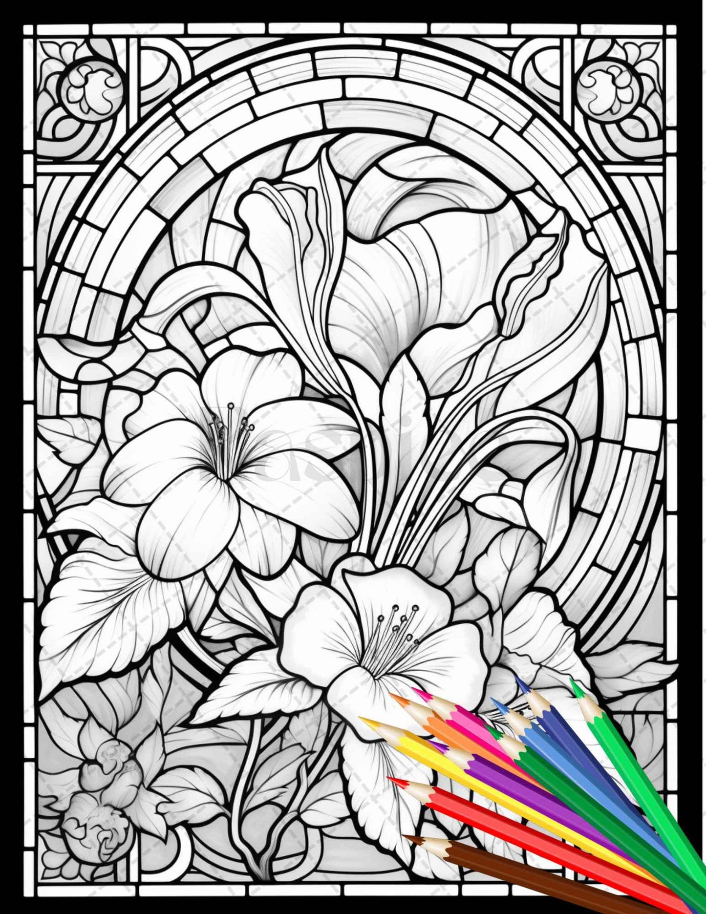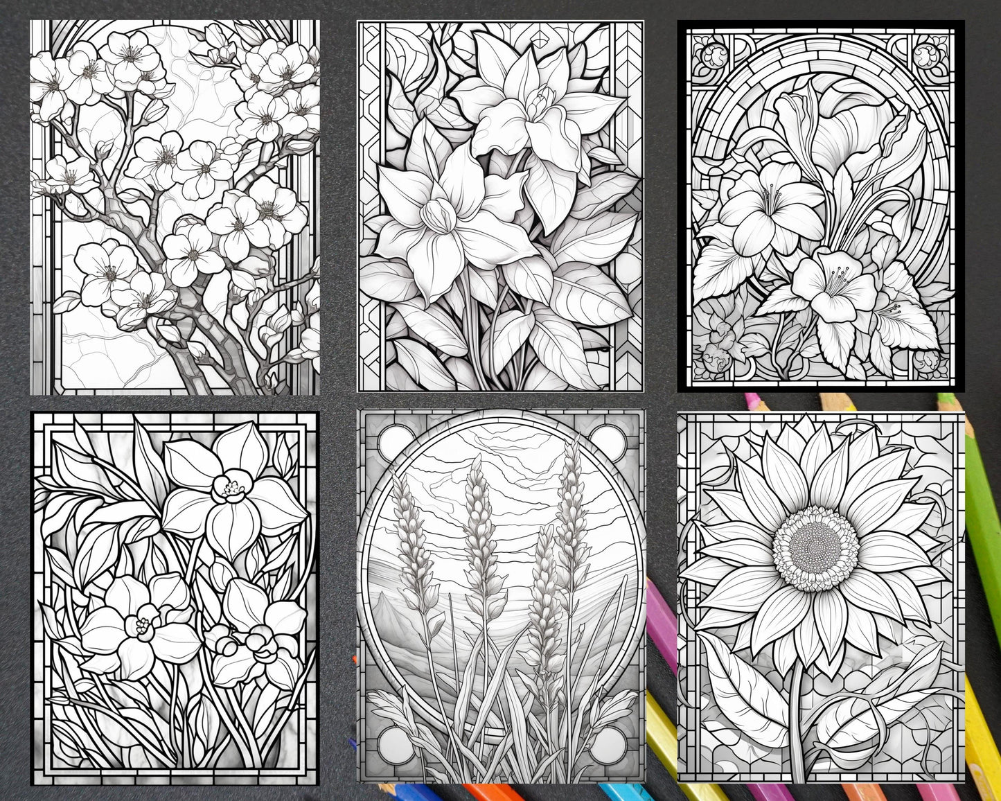 30 Stained Glass Flowers Grayscale Coloring Pages Printable for Adults, PDF File Instant Download