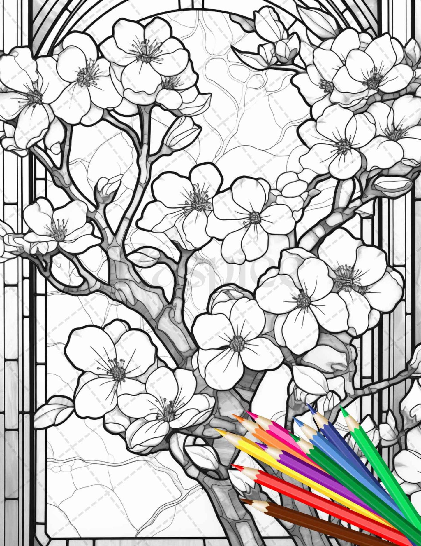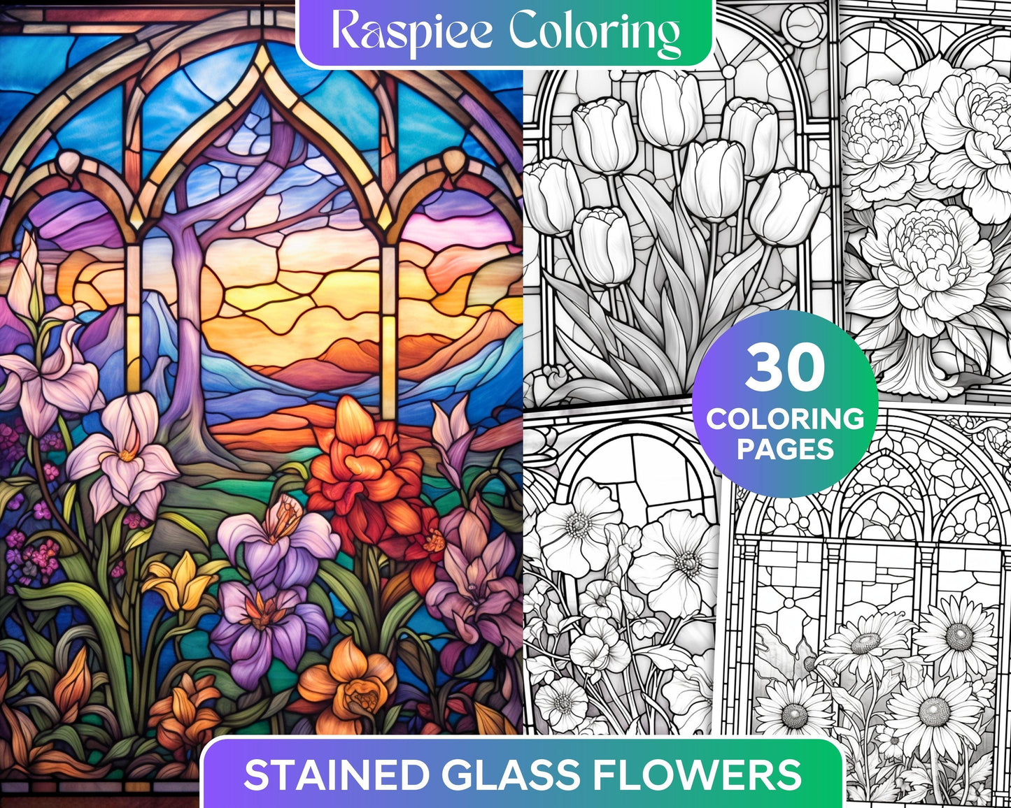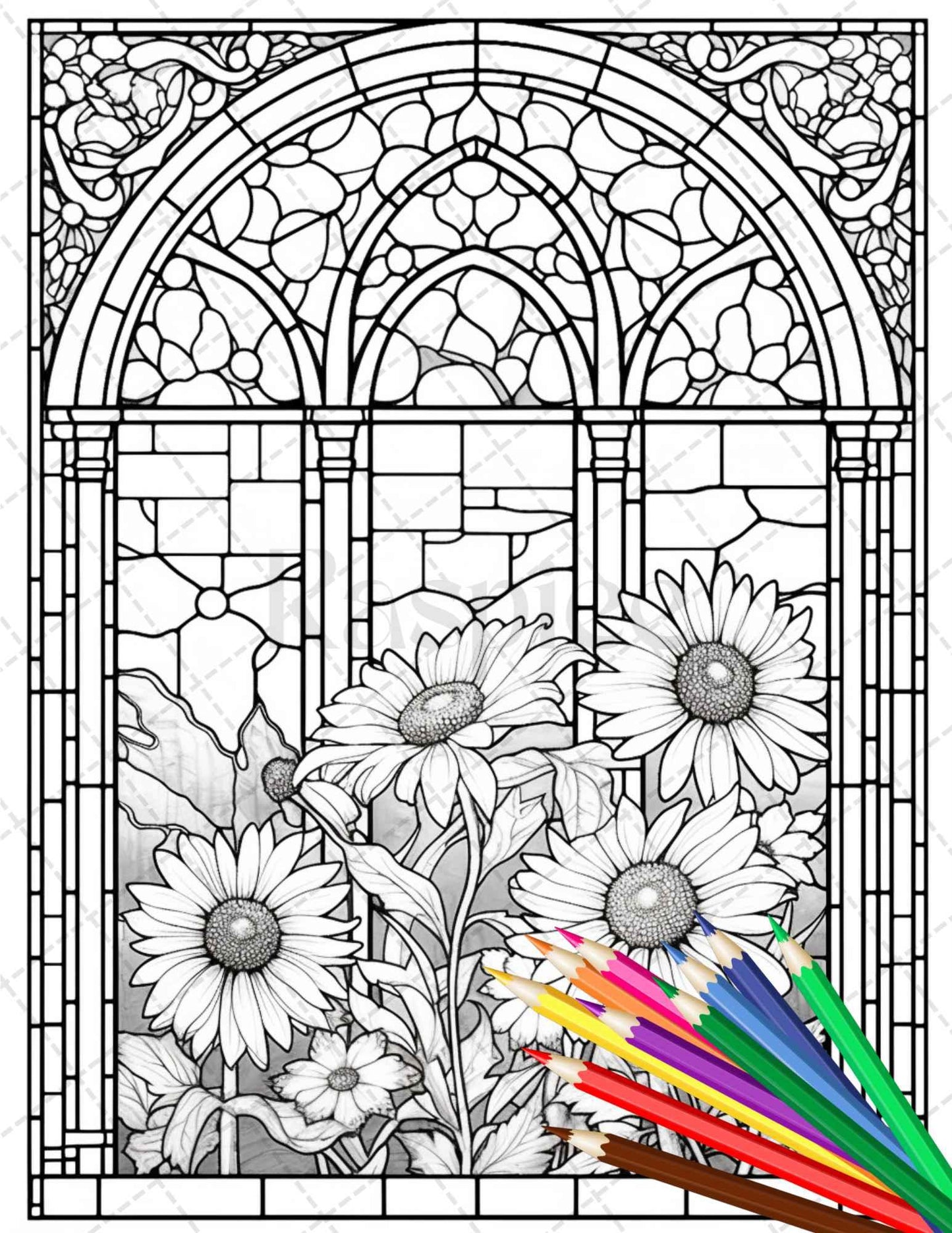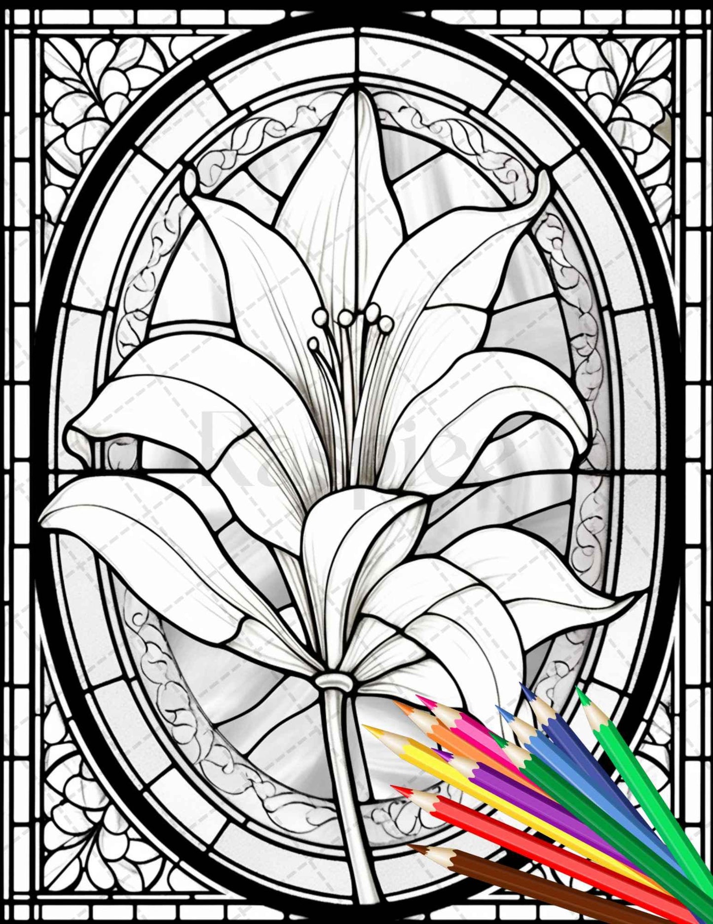30 Stained Glass Flowers Grayscale Coloring Pages Printable for Adults, PDF File Instant Download