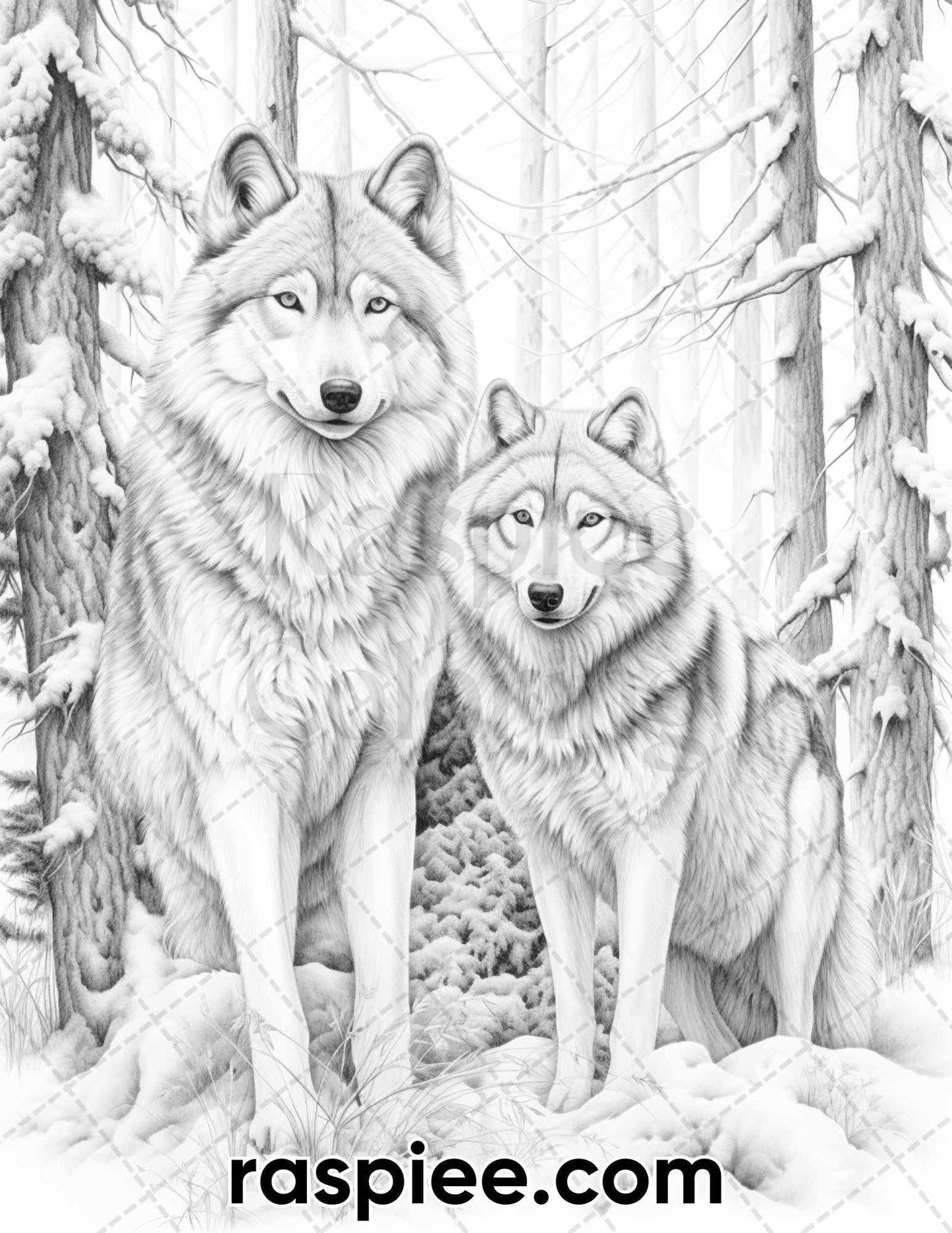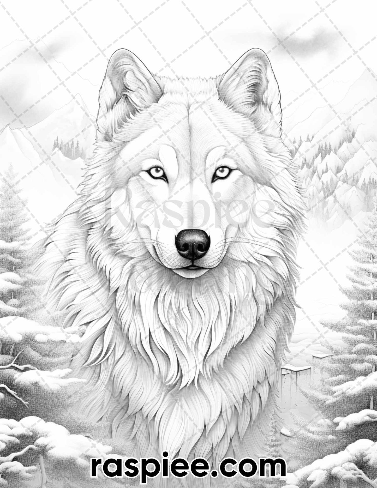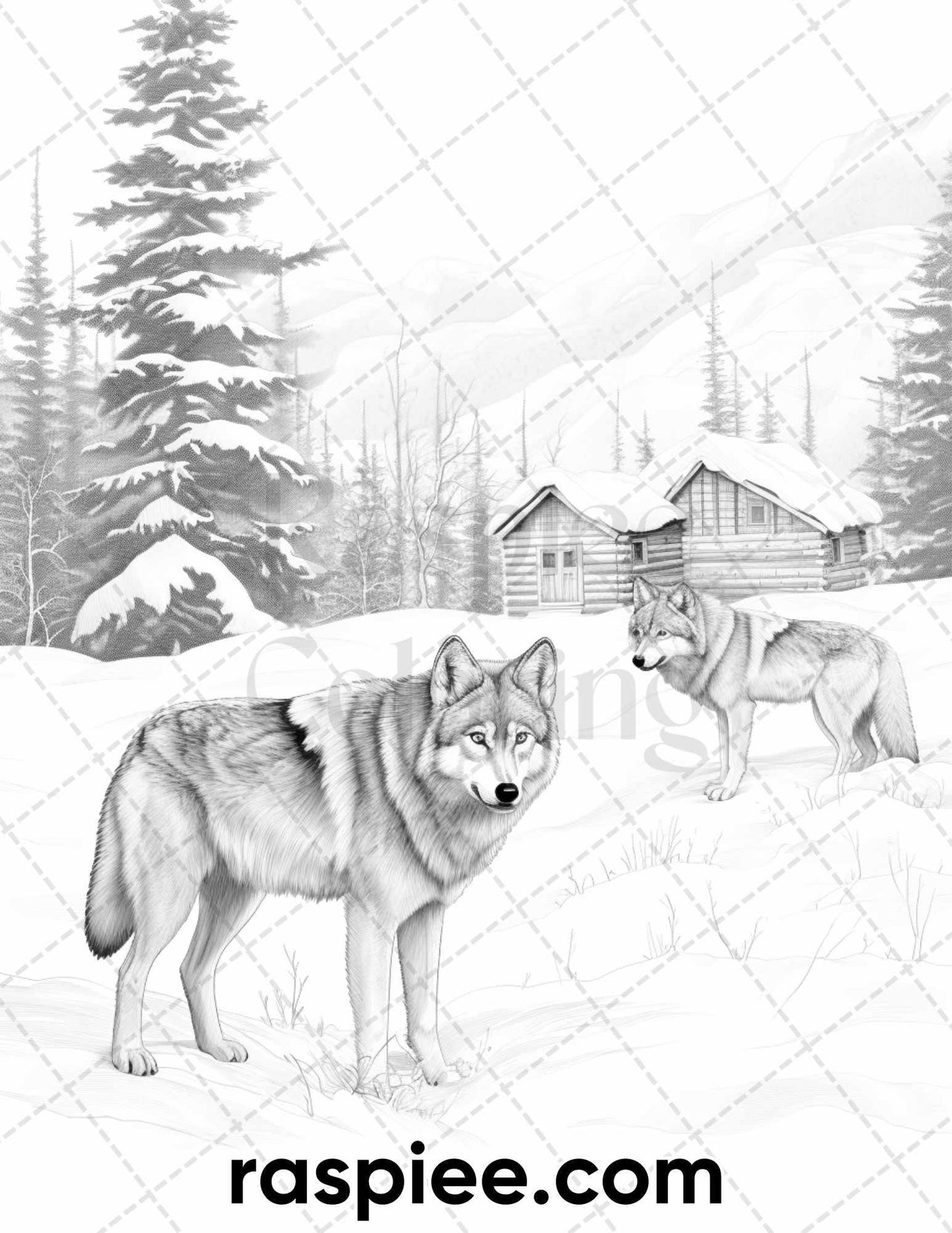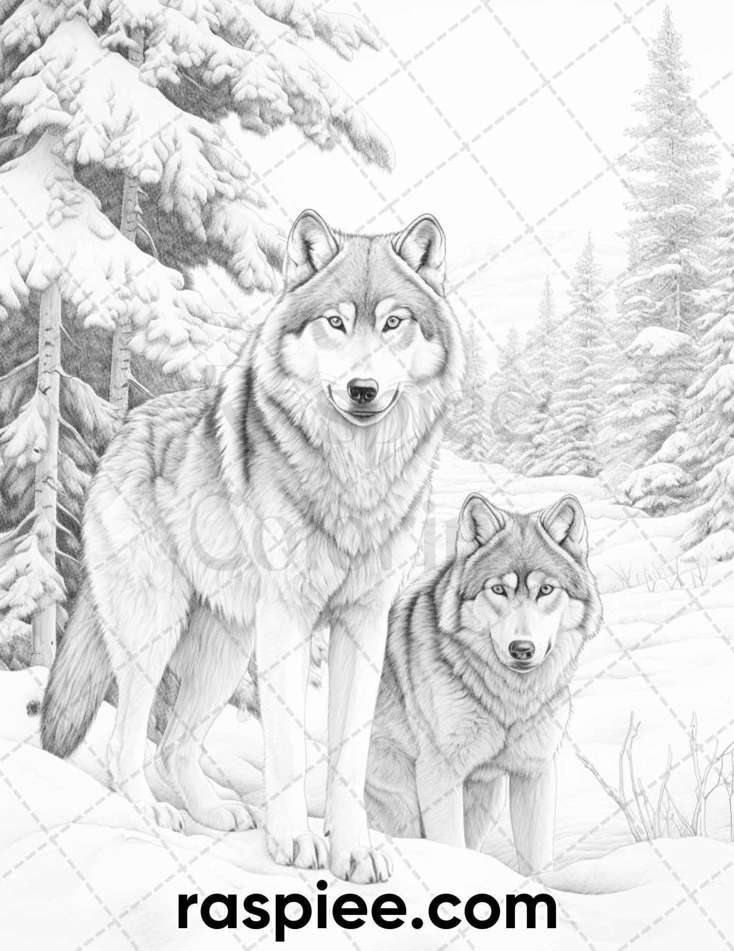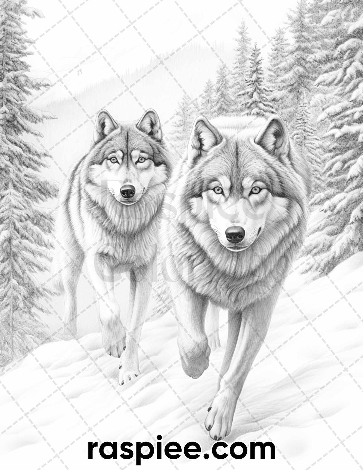50 Winter Wolf Grayscale Coloring Pages for Adults, Printable PDF Instant Download