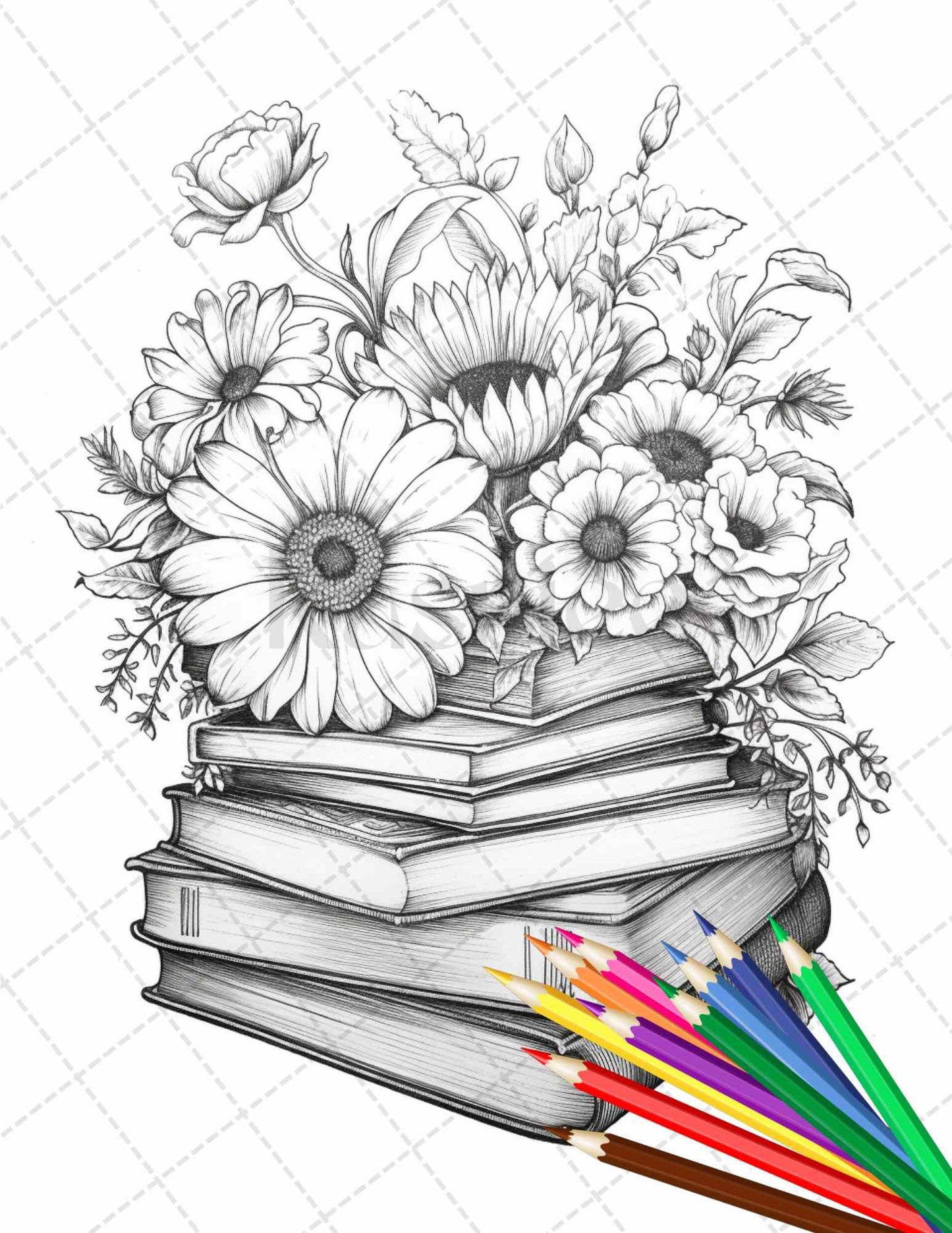 31 Book Flowers Coloring Pages Printable for Adults, Grayscale Coloring Page, PDF File Instant Download