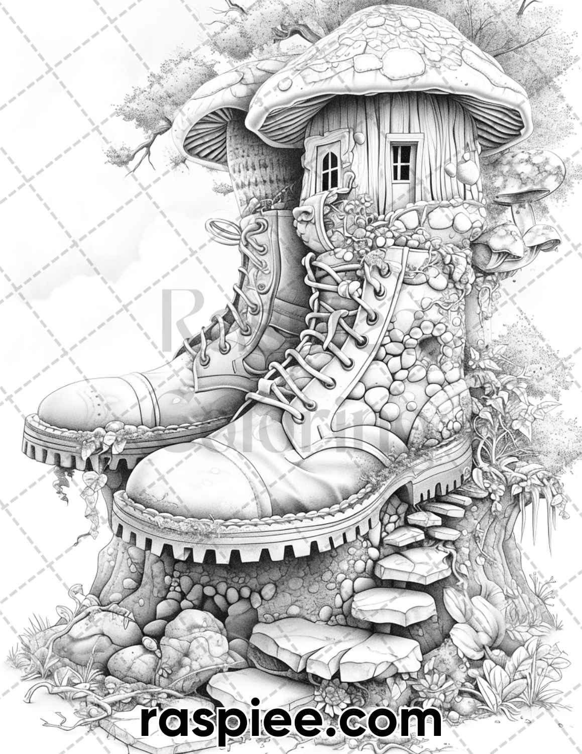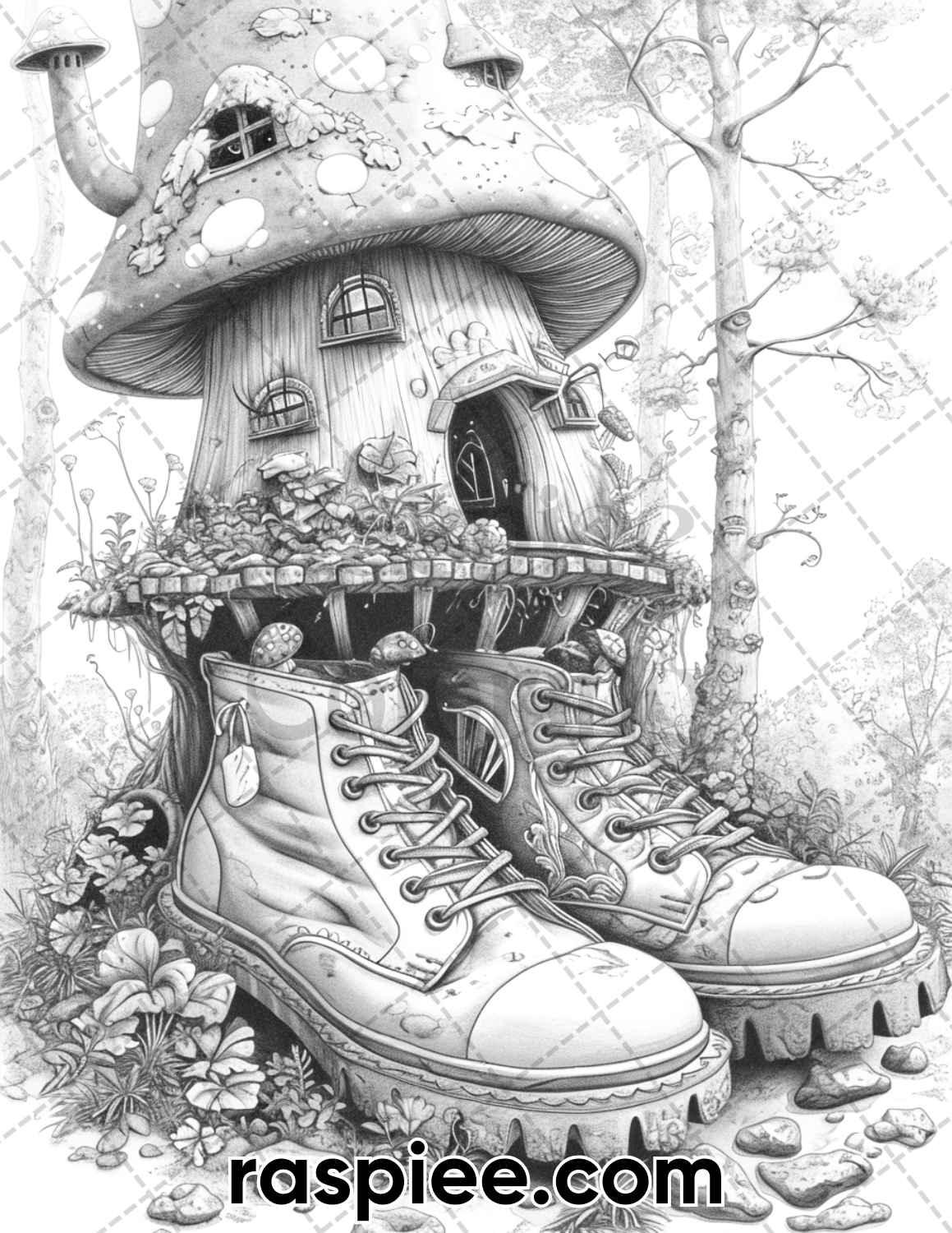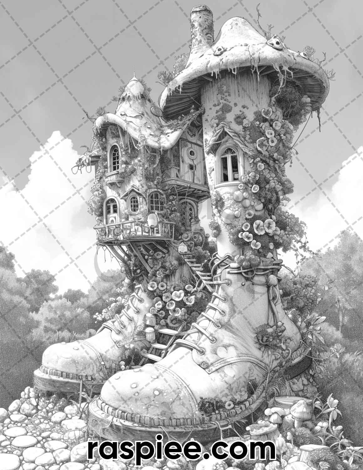 Embark on a magical coloring journey like no other with our 80 Fantasy Shoe House Grayscale Coloring Pages. Download your PDF today and step into a whimsical world where fantasy and creativity unite in perfect harmony.