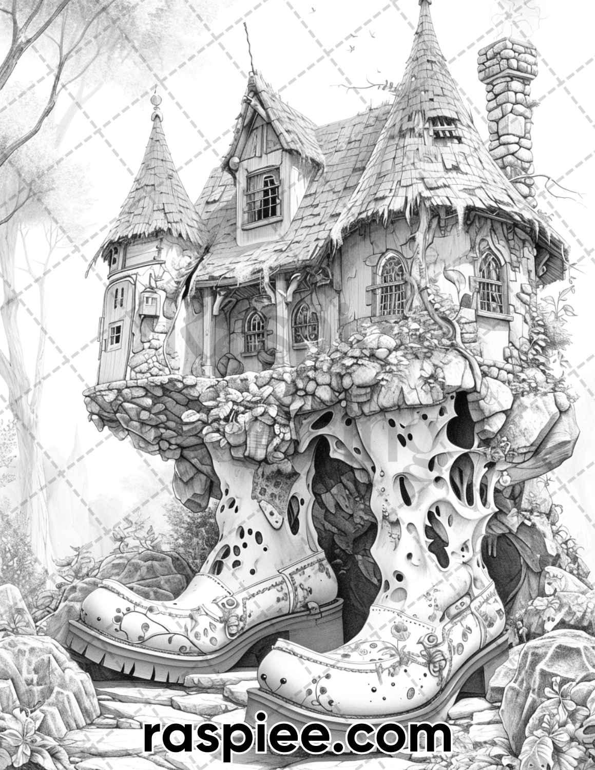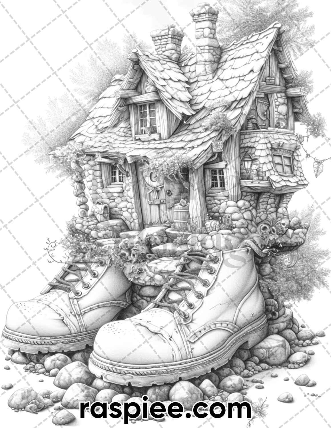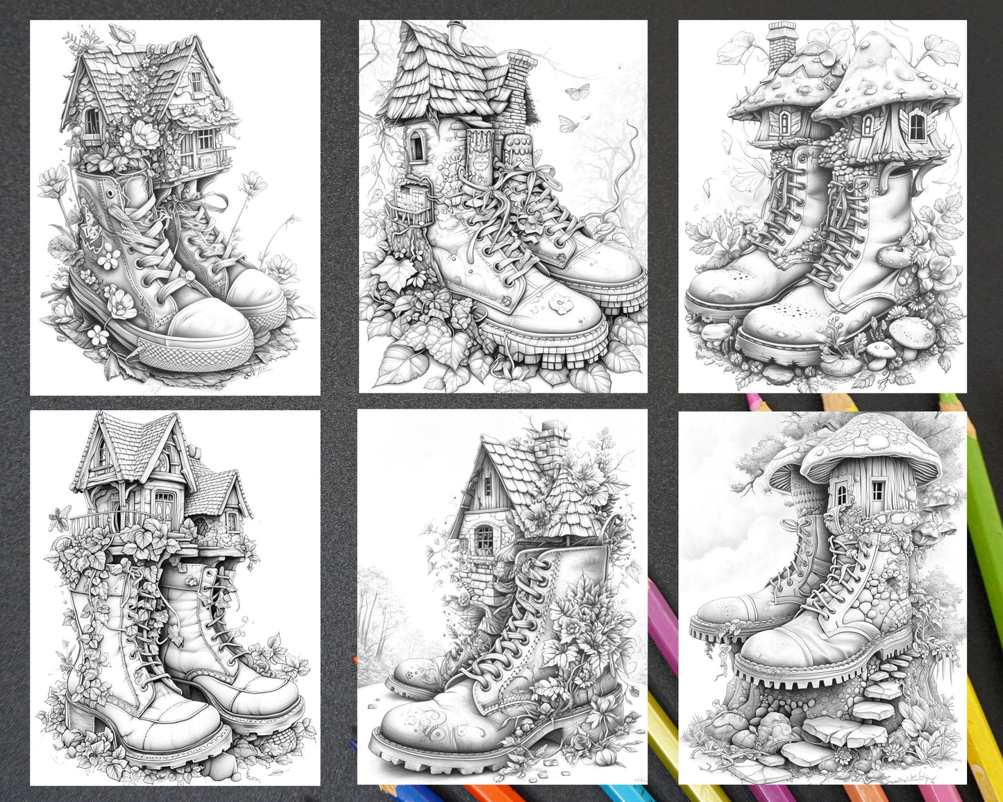 80 Fantasy Shoe House Grayscale Adult Coloring Pages, Printable PDF Instant Download