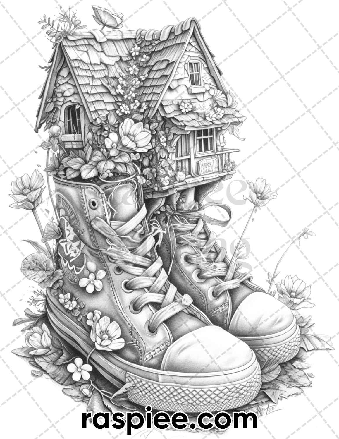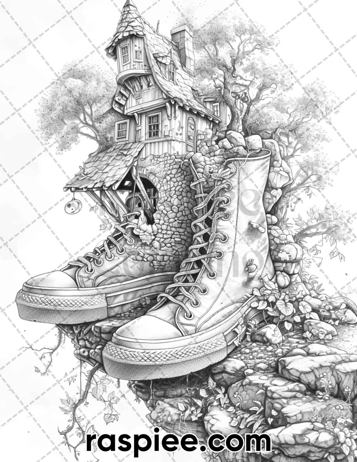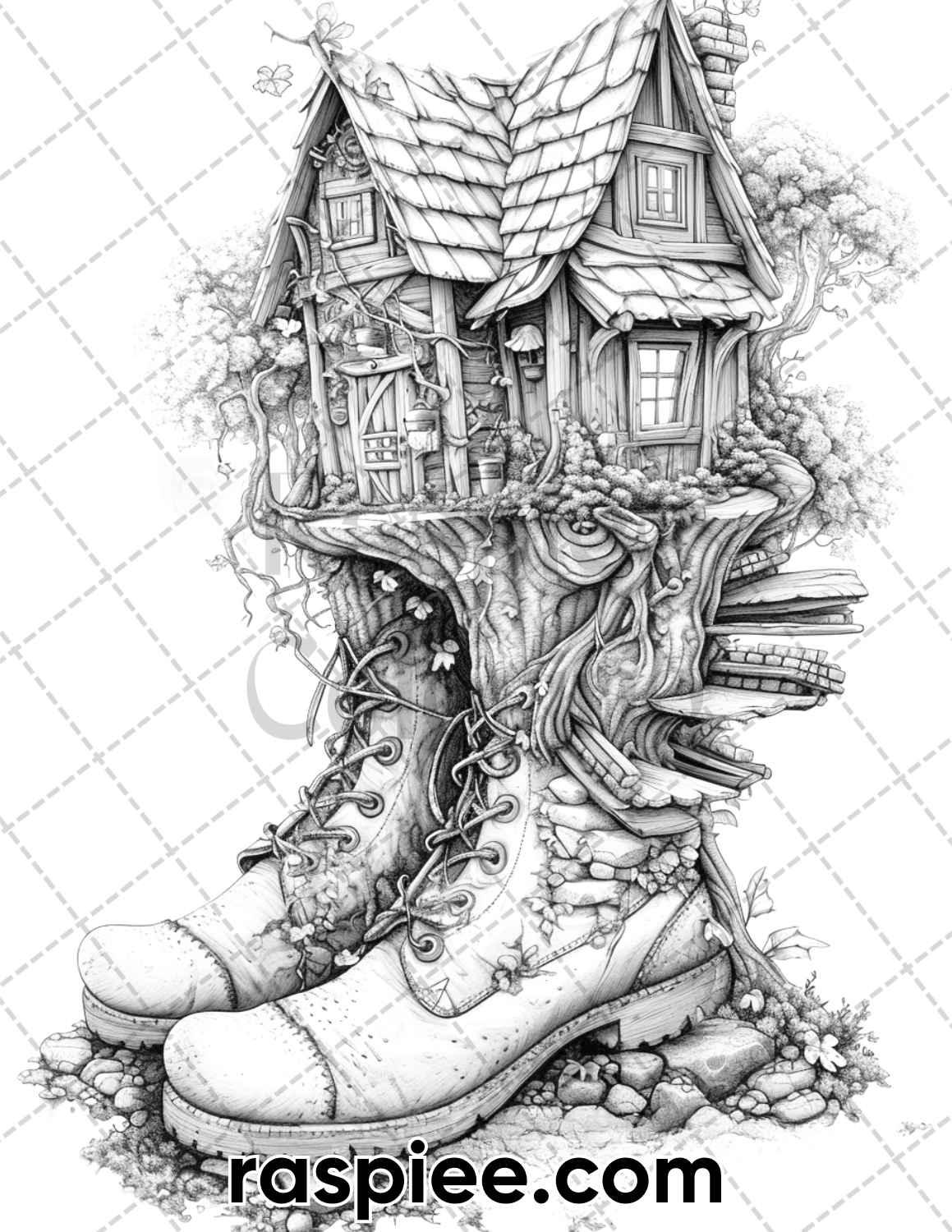 80 Fantasy Shoe House Grayscale Adult Coloring Pages, Printable PDF Instant Download