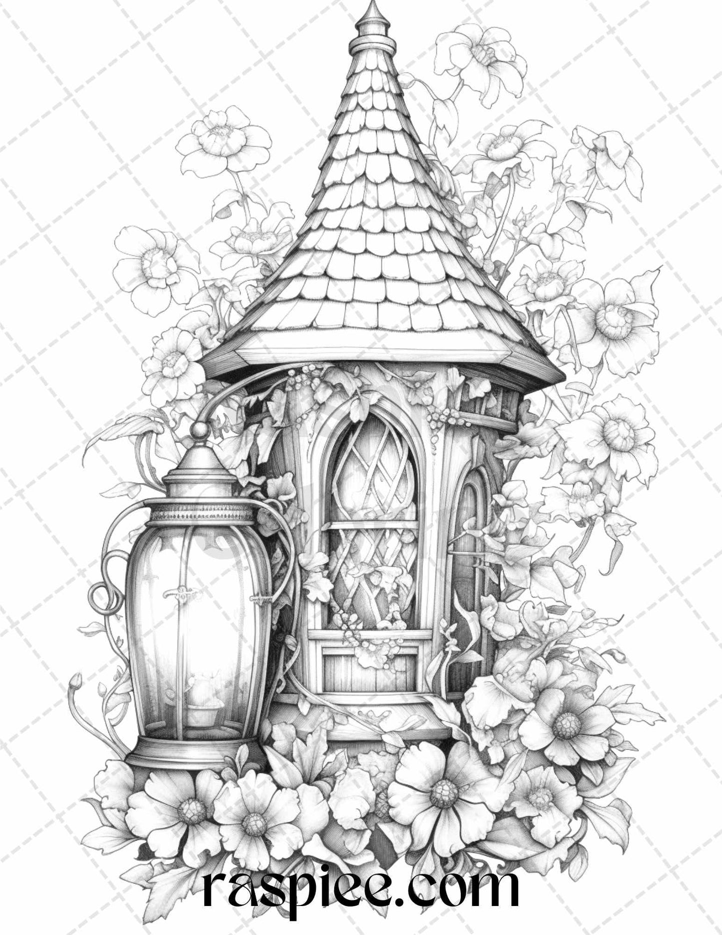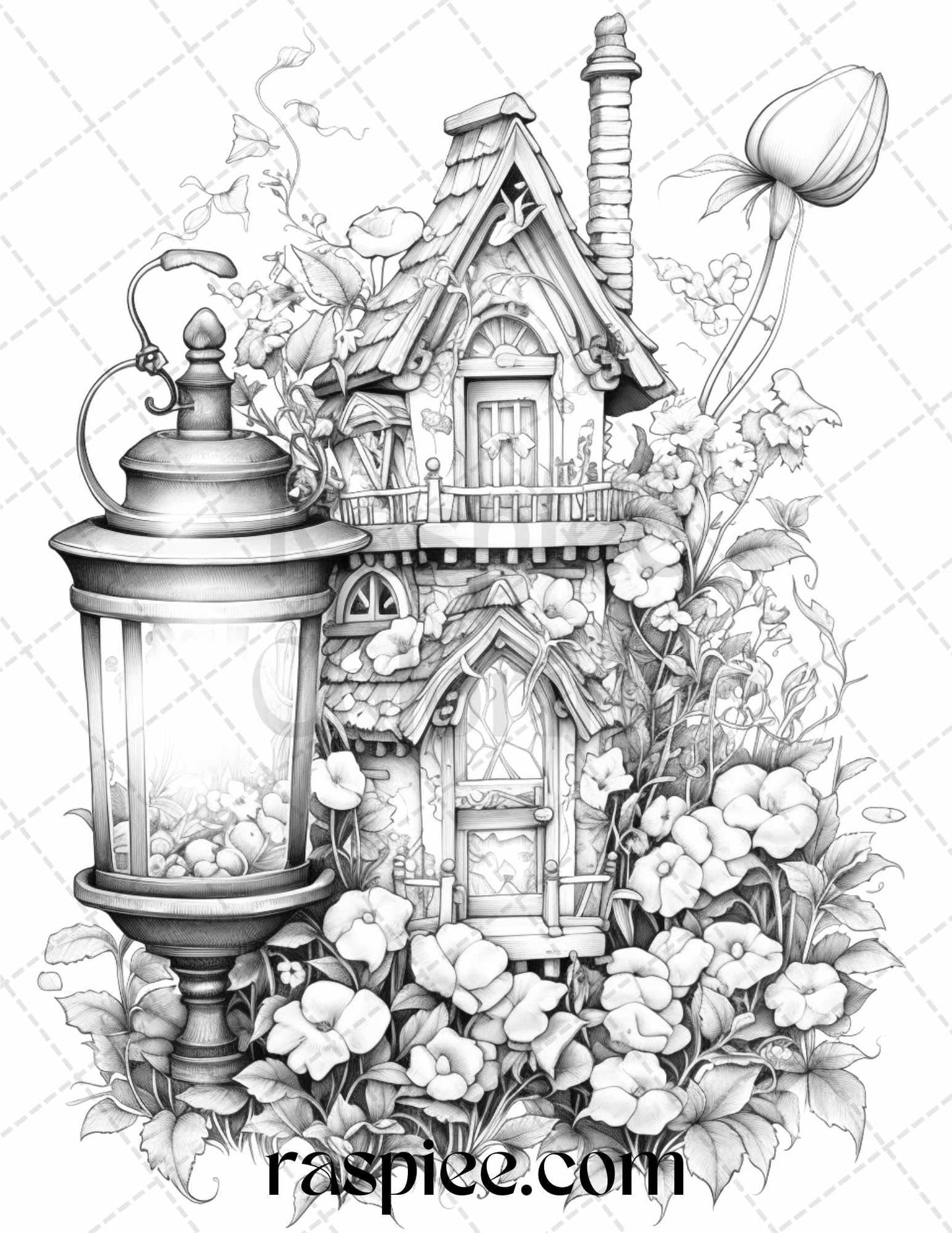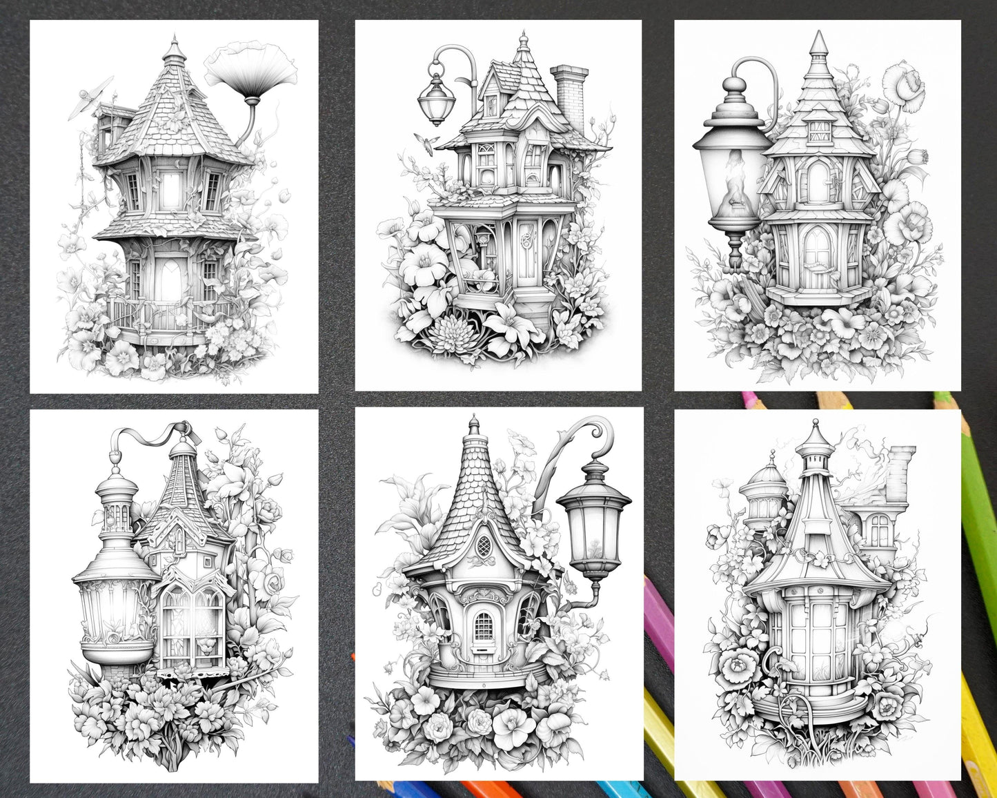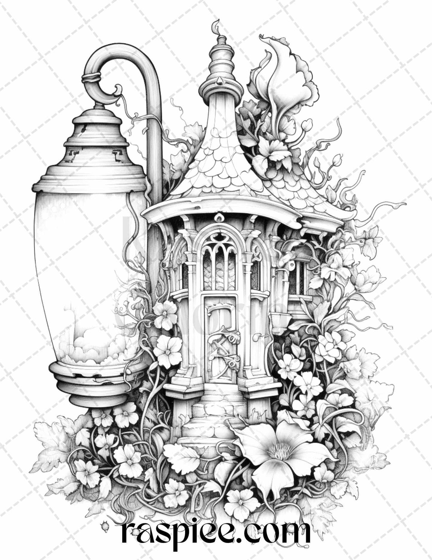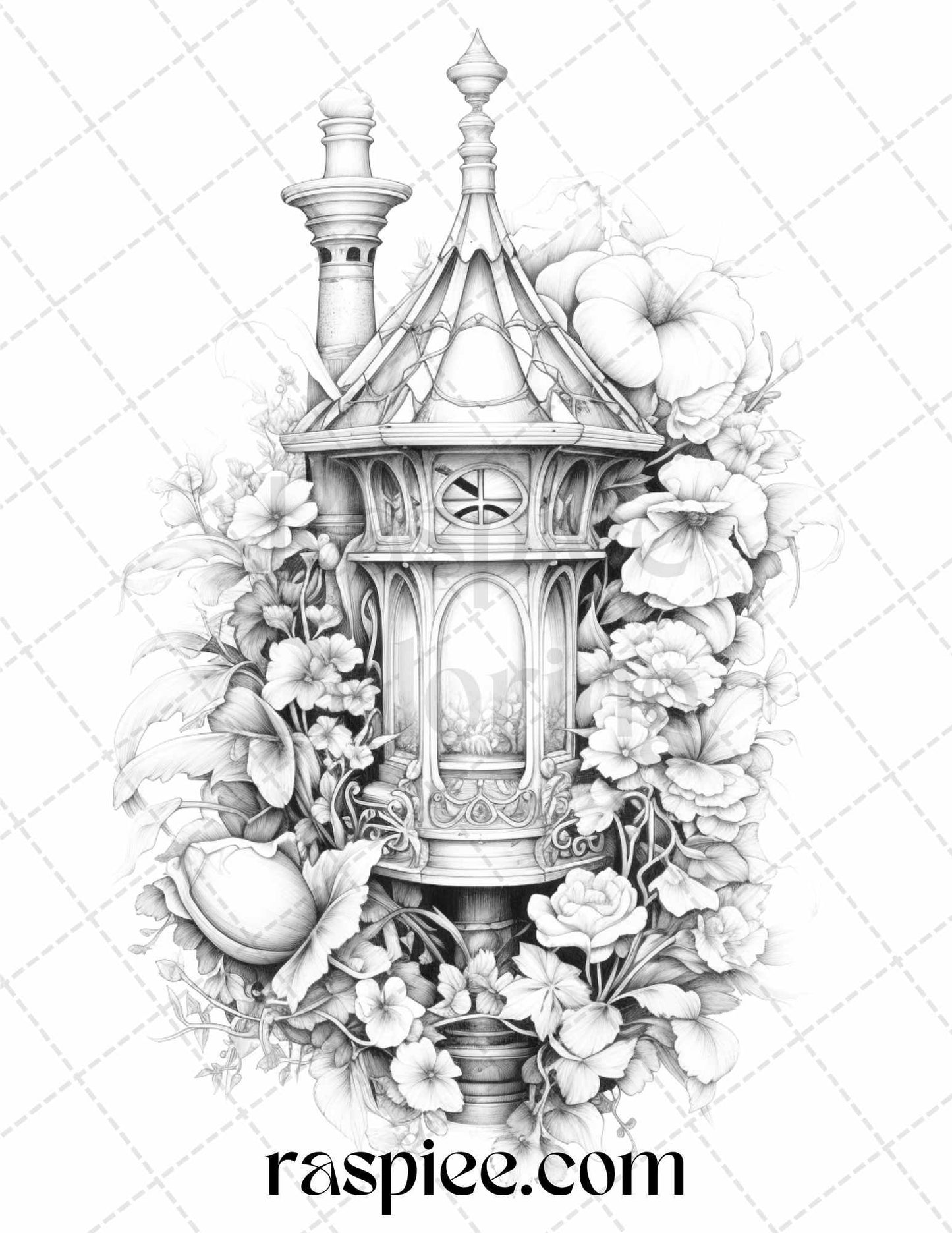 50 Lantern Fairy Houses Grayscale Coloring Pages Printable for Adults, PDF File Instant Download