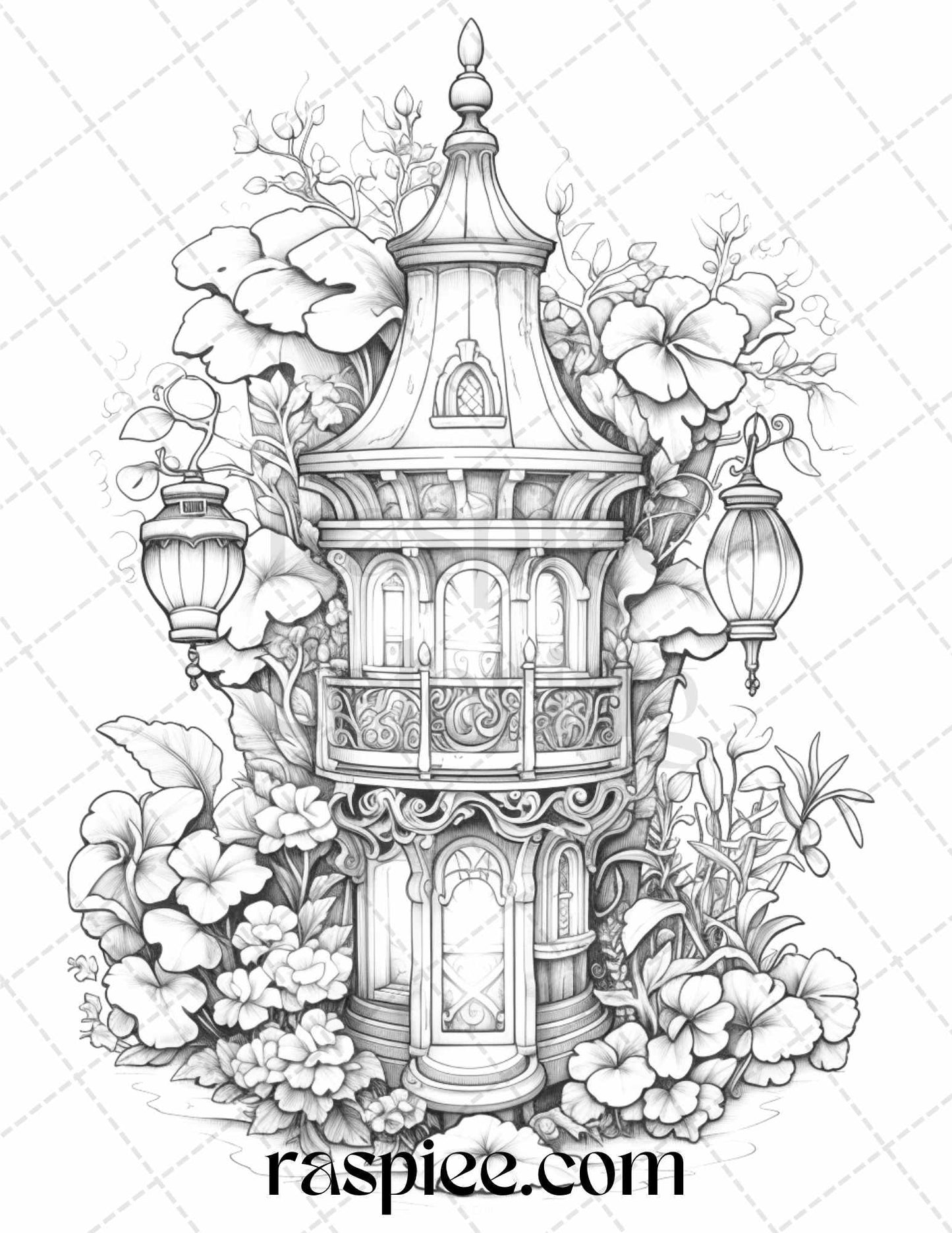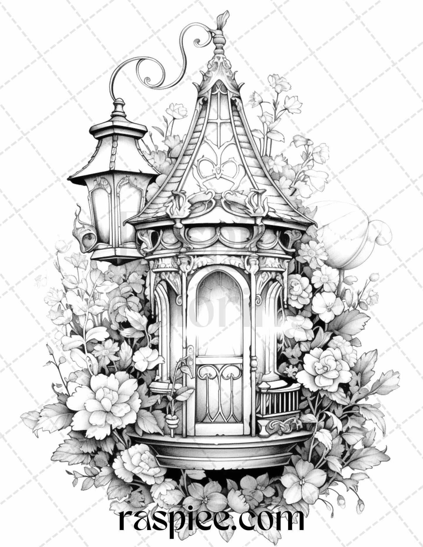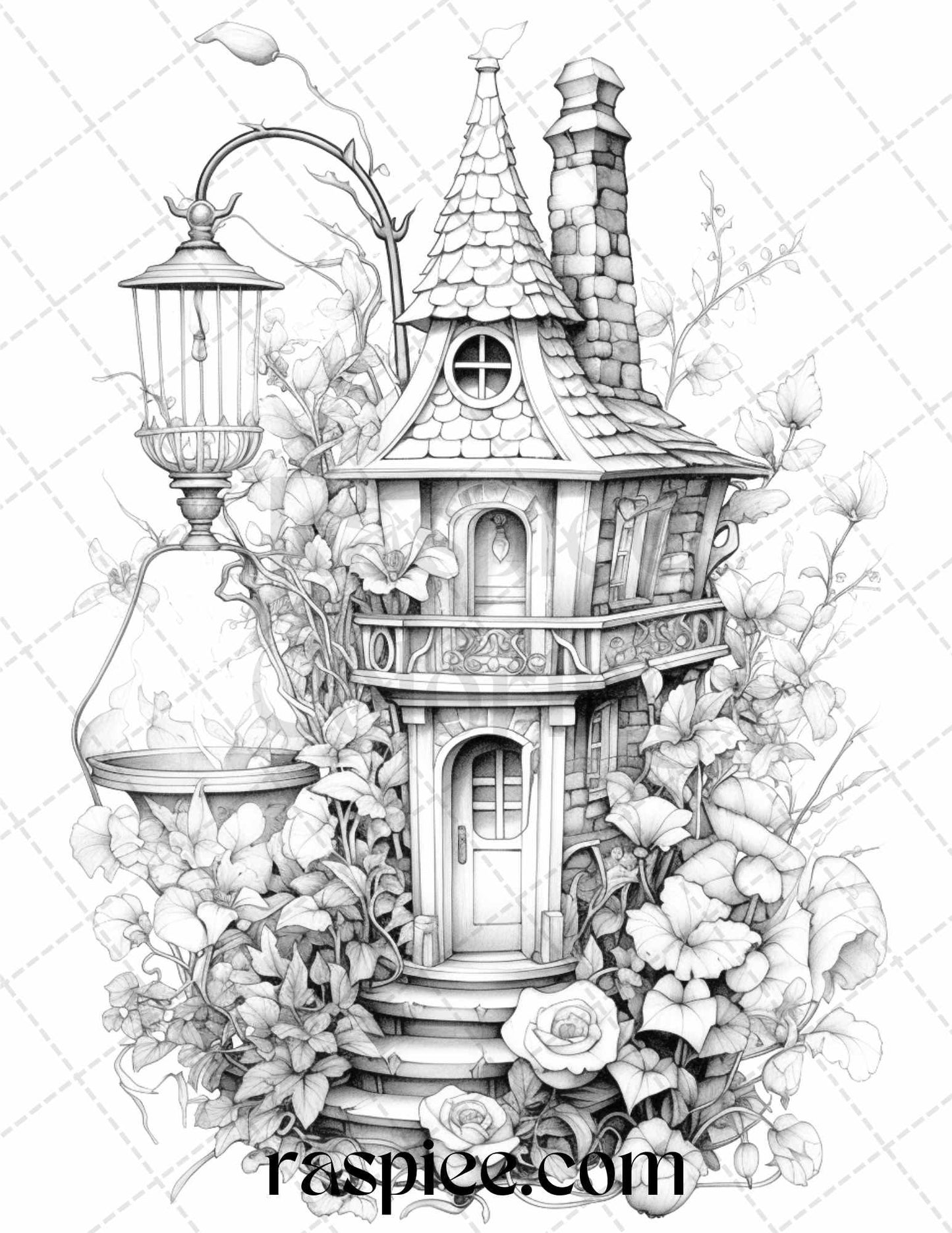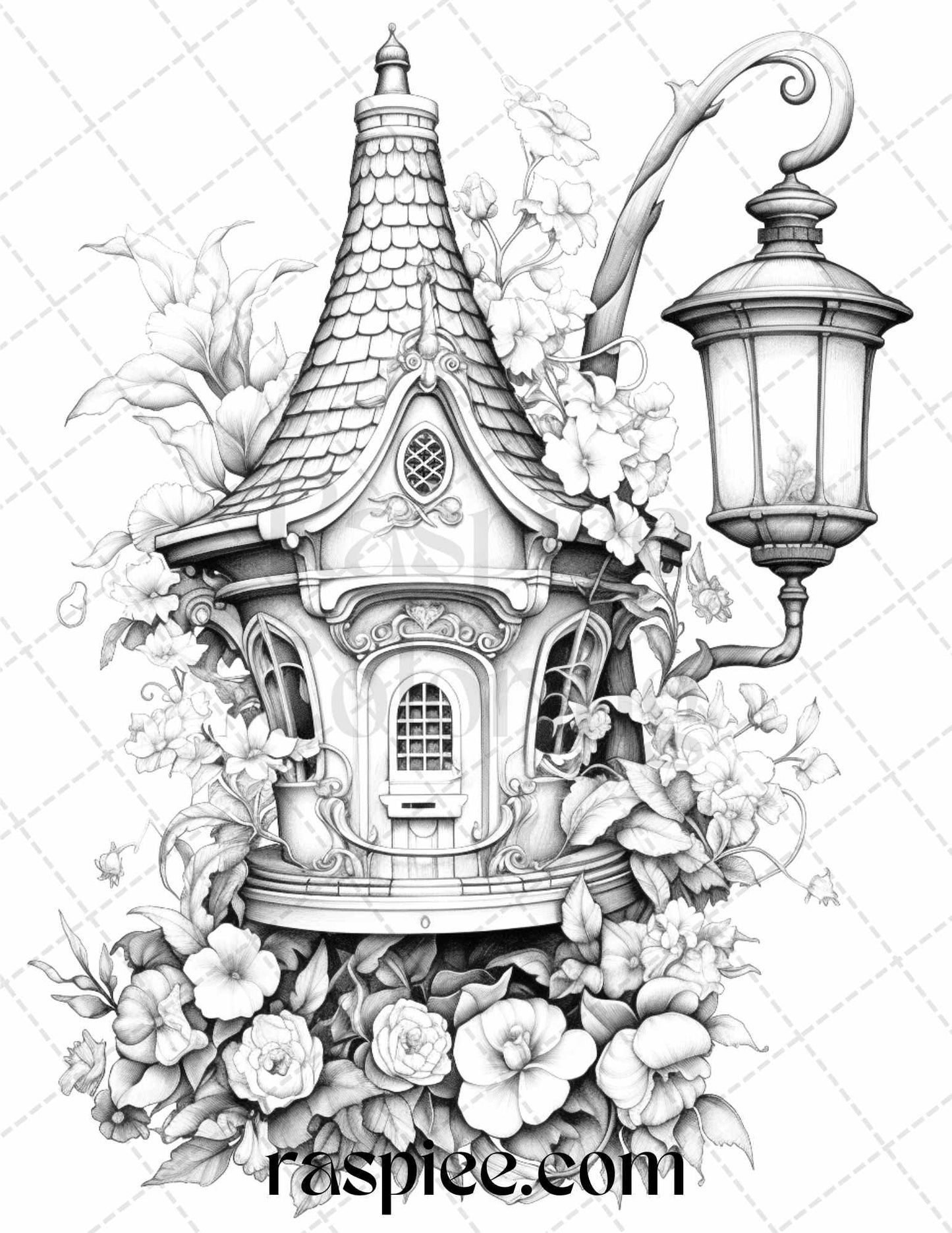 50 Lantern Fairy Houses Grayscale Coloring Pages Printable for Adults, PDF File Instant Download