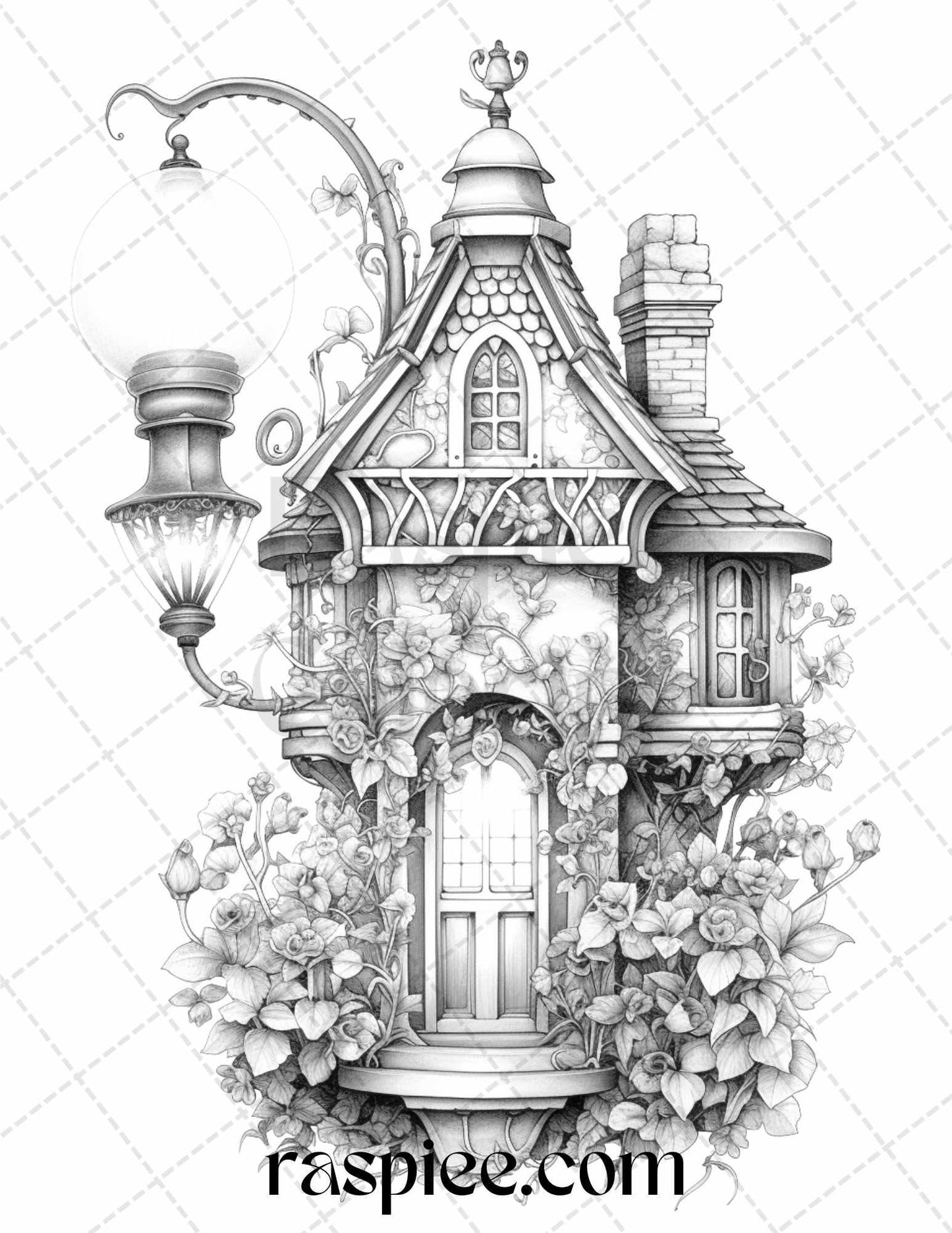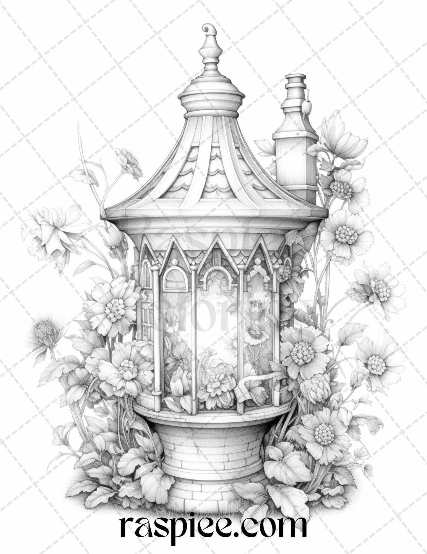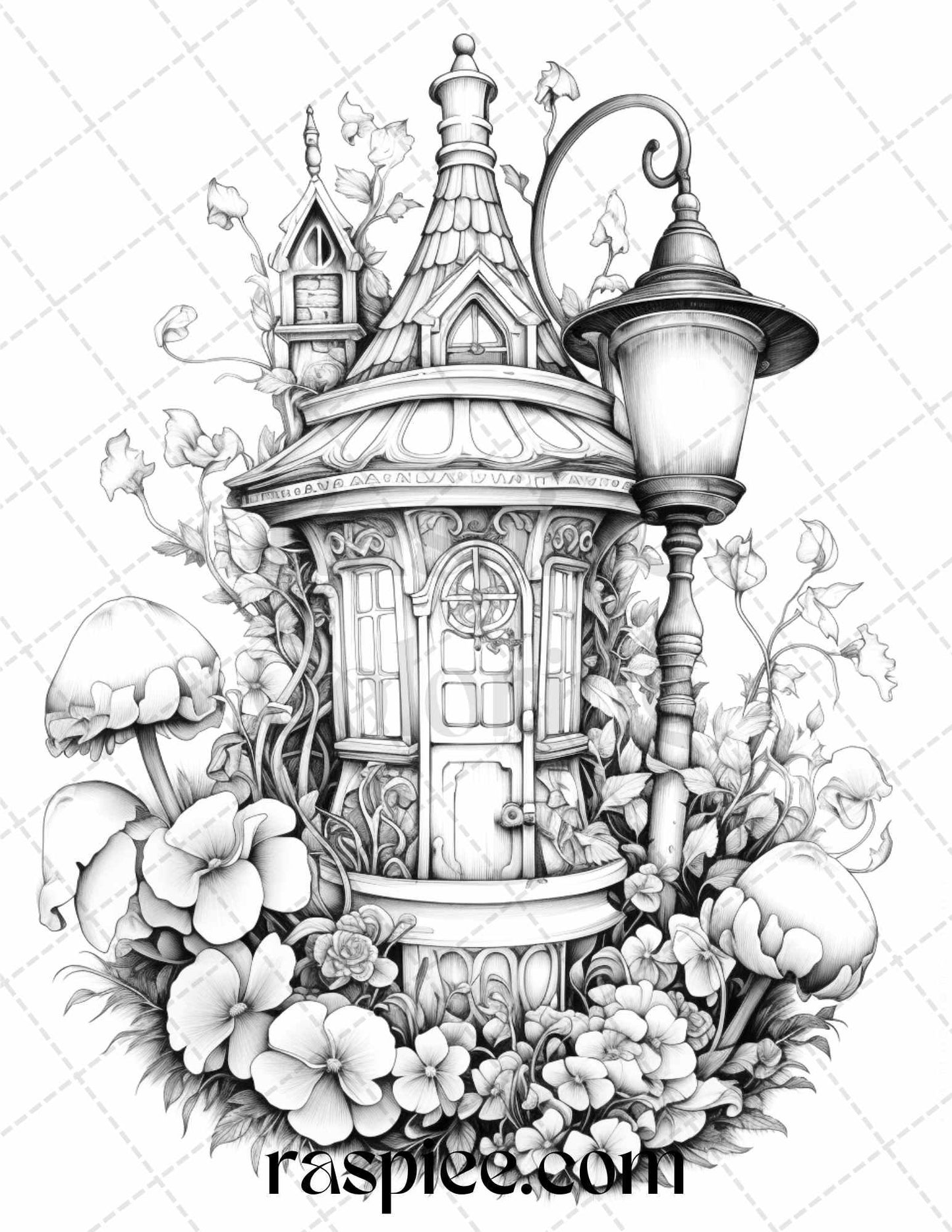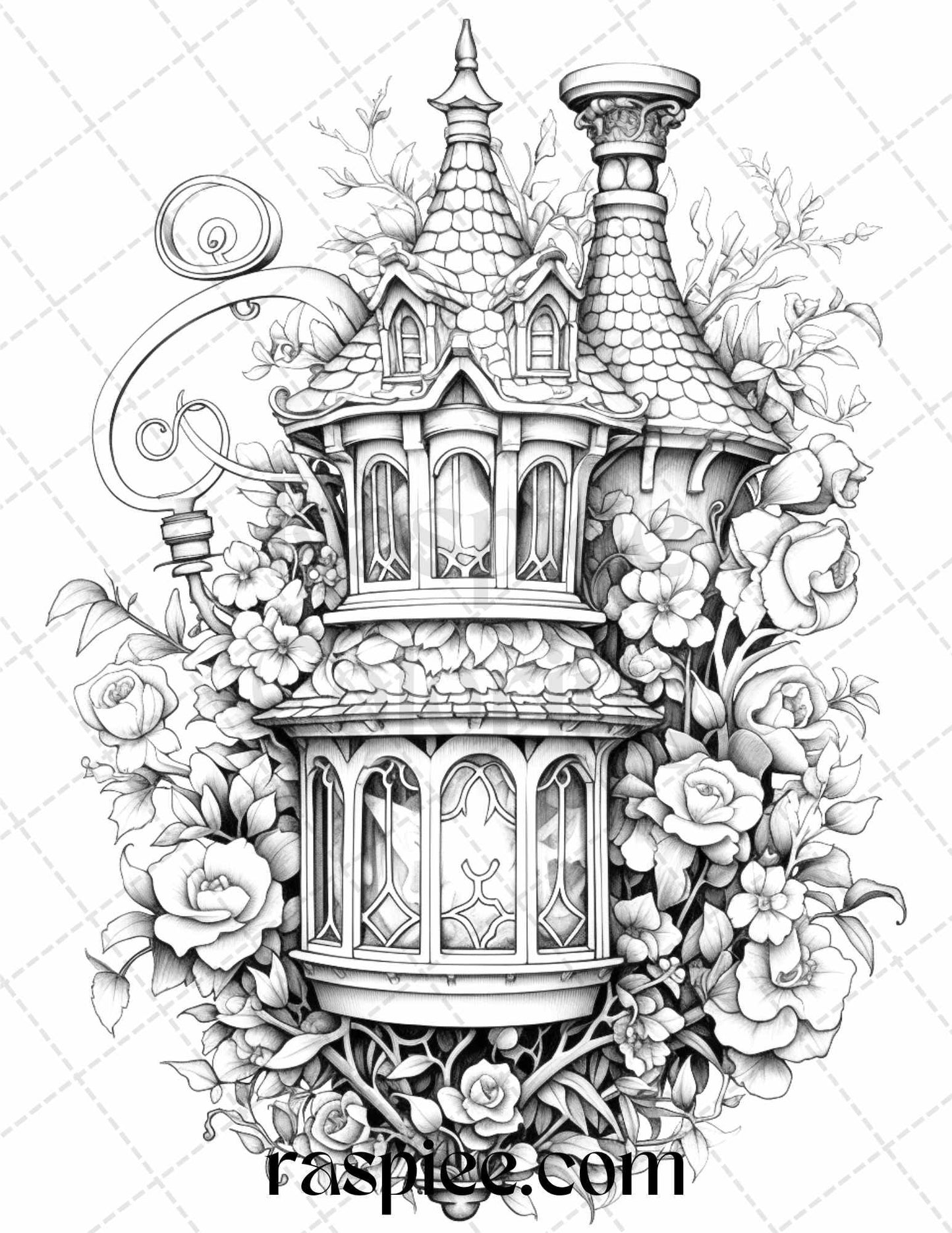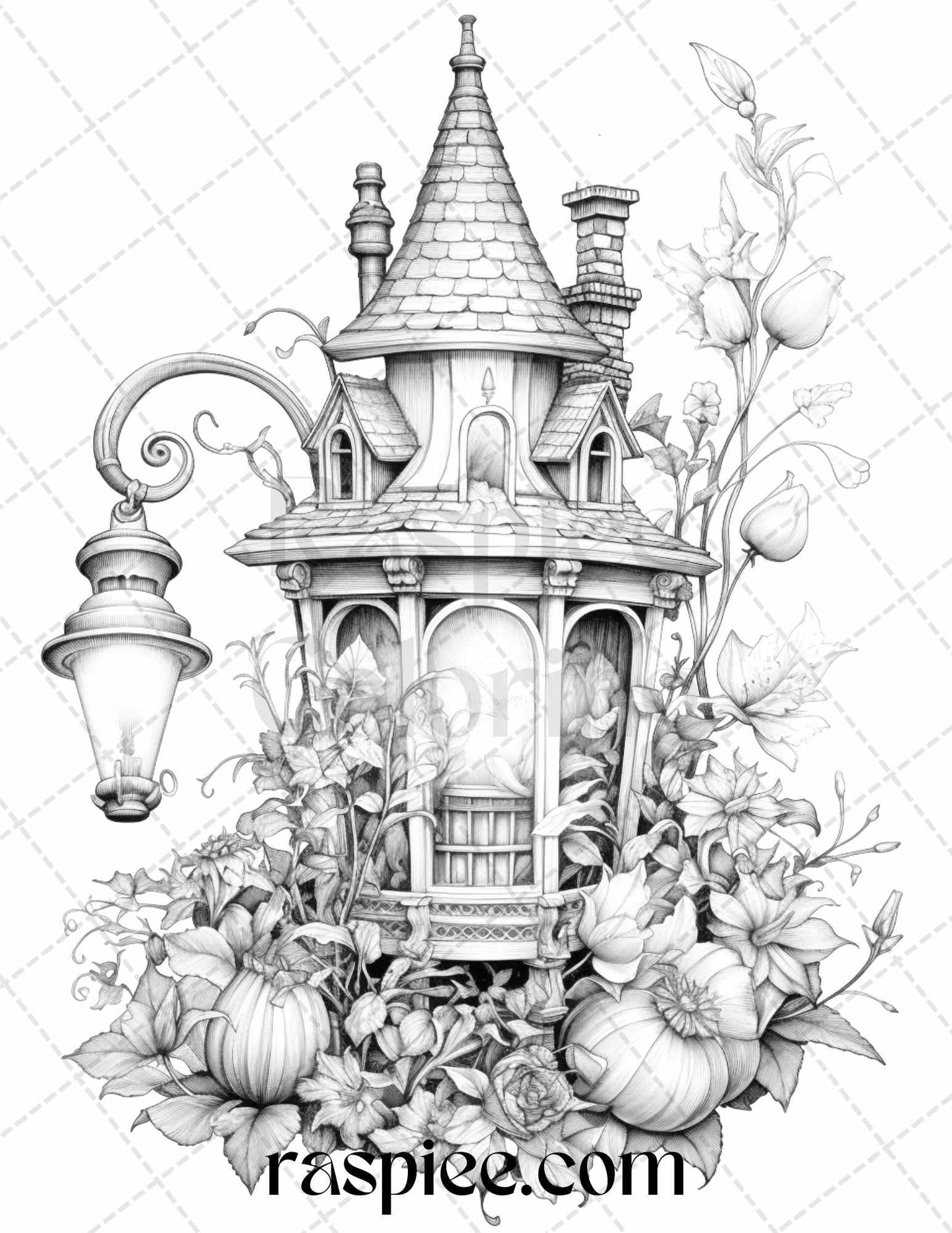 50 Lantern Fairy Houses Grayscale Coloring Pages Printable for Adults, PDF File Instant Download