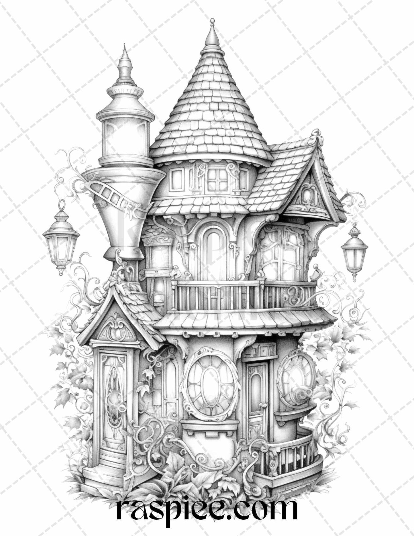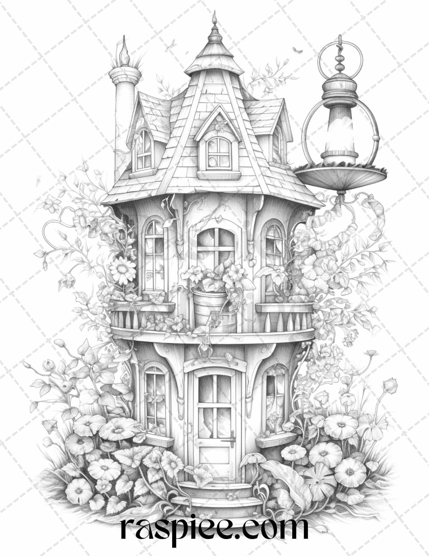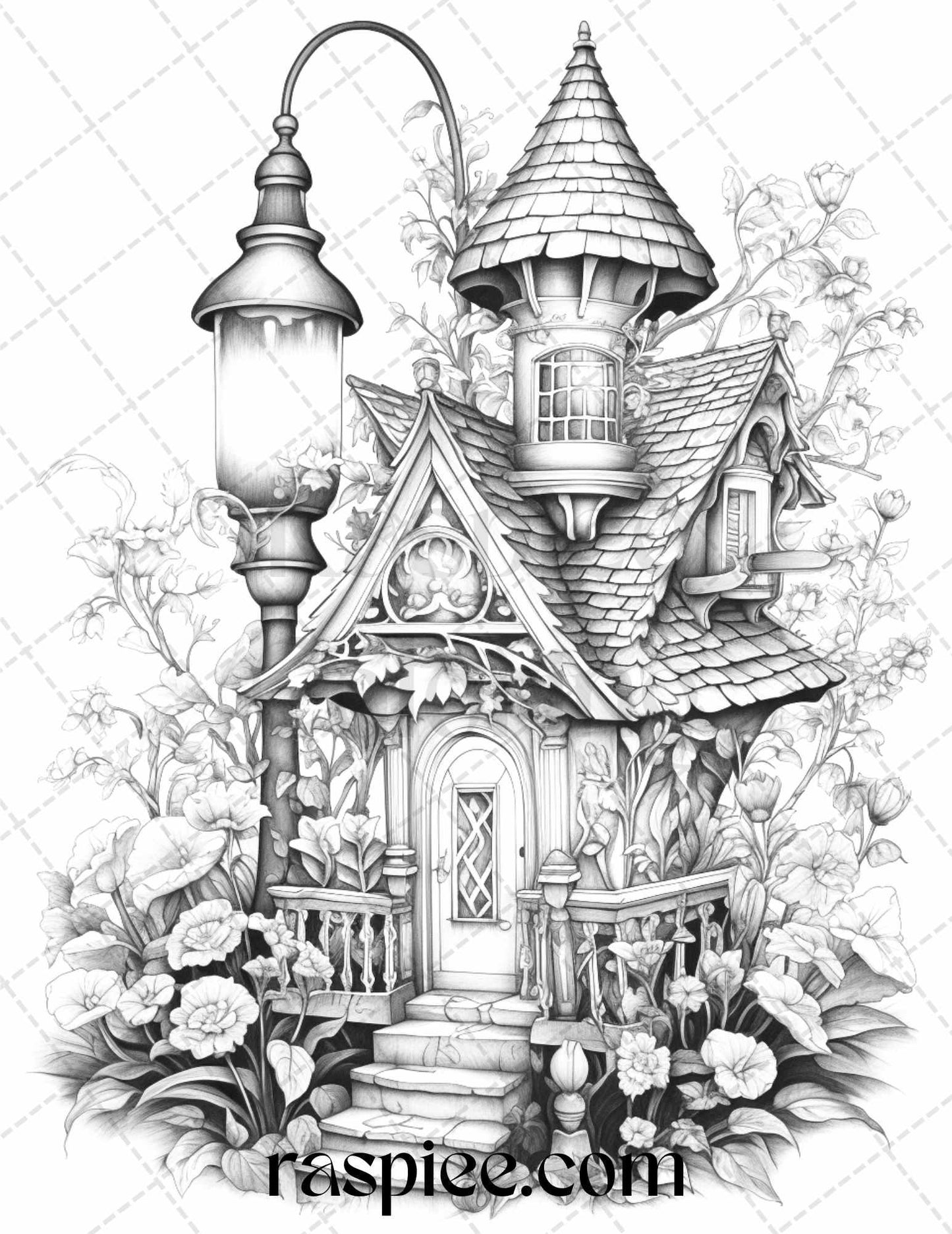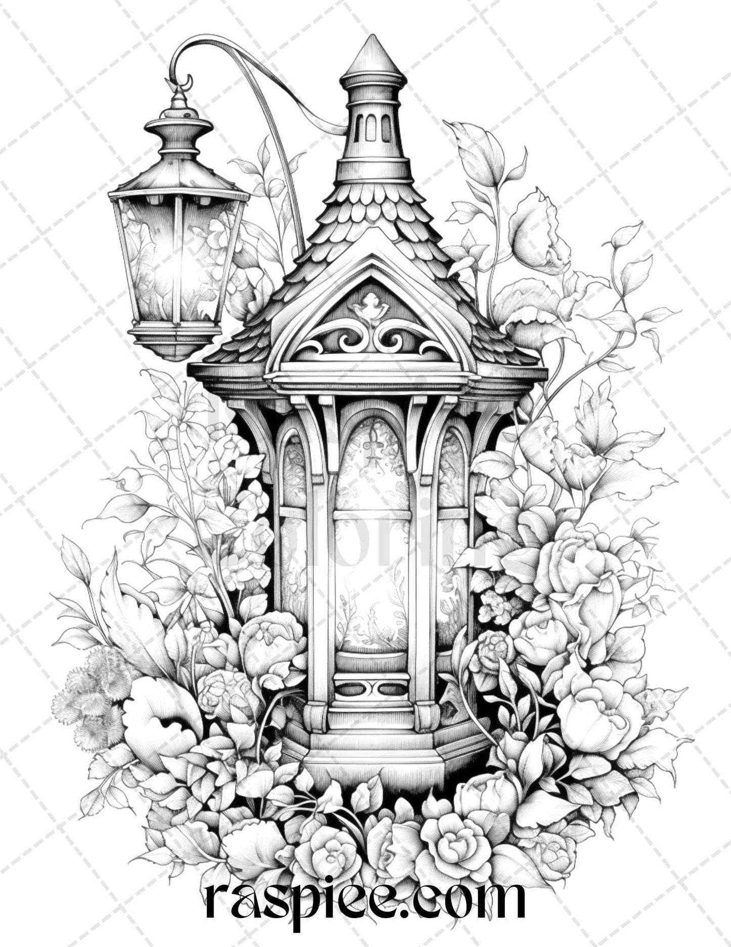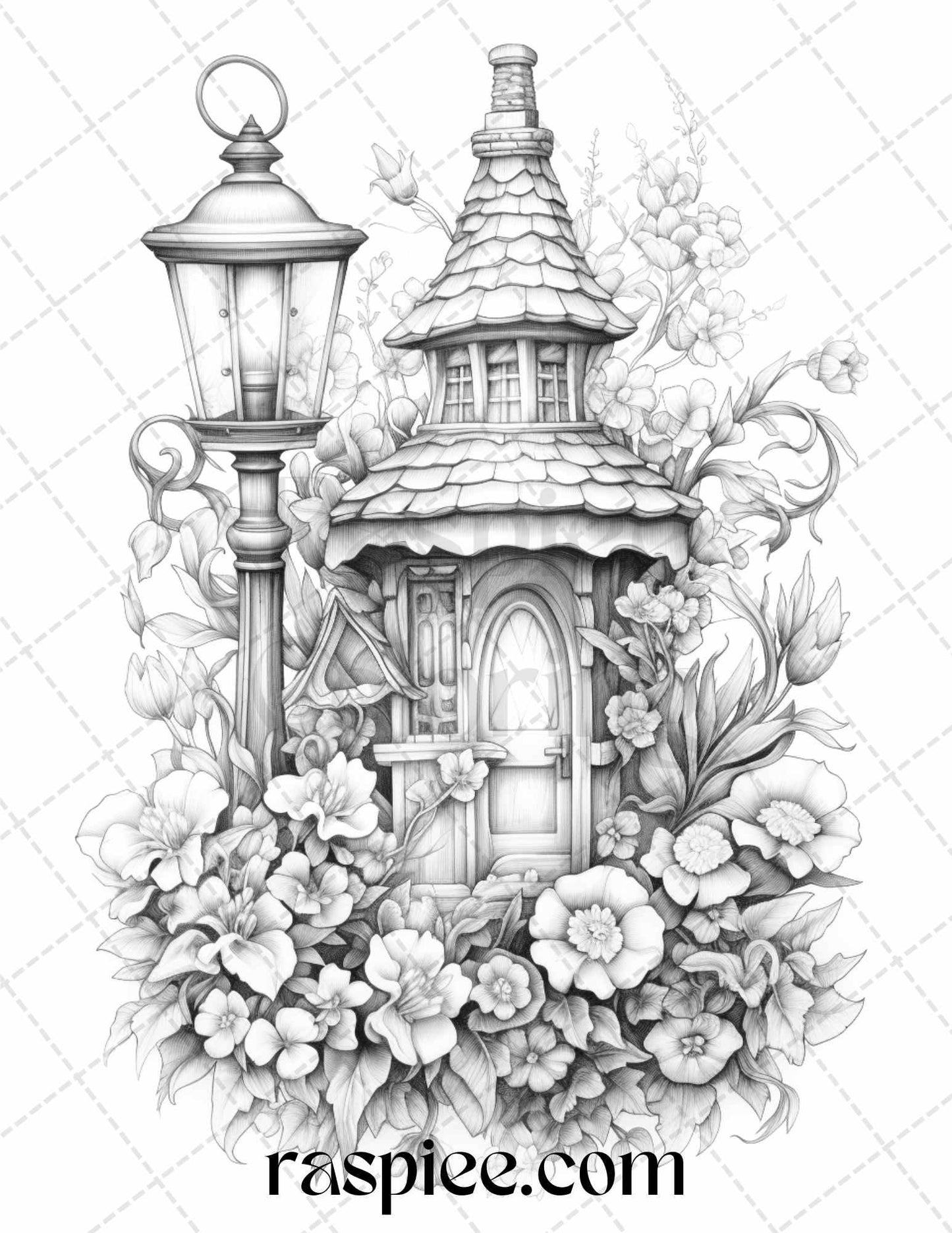 50 Lantern Fairy Houses Grayscale Coloring Pages Printable for Adults, PDF File Instant Download
