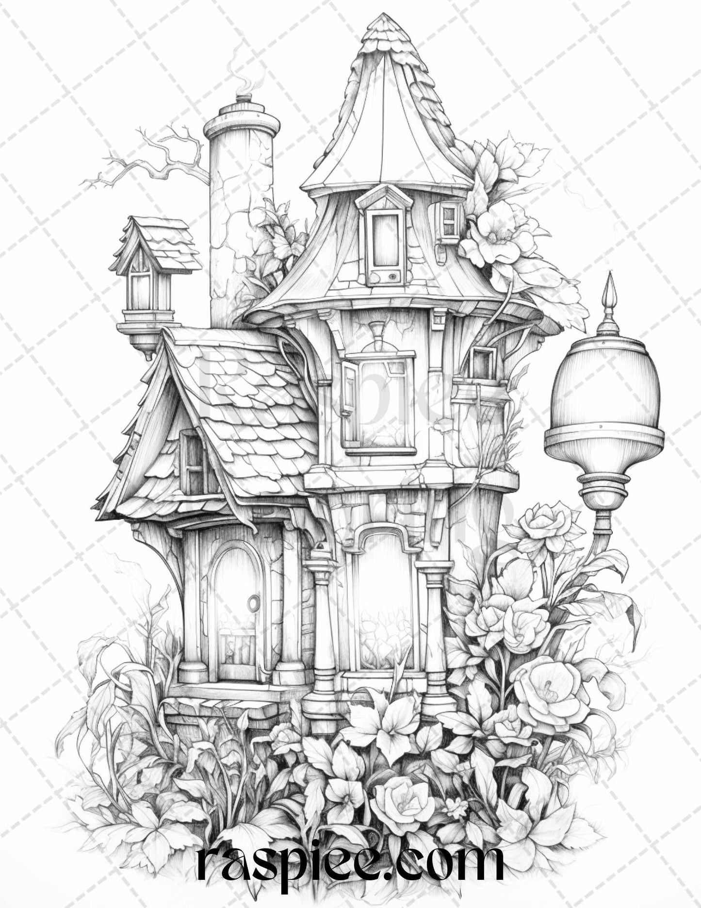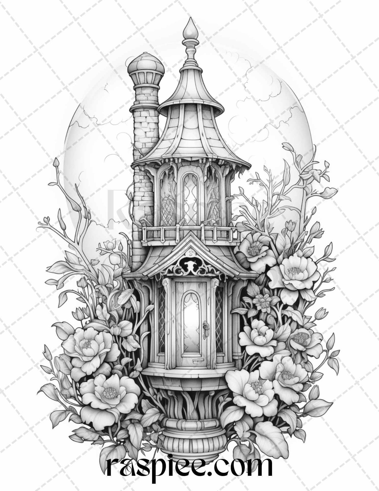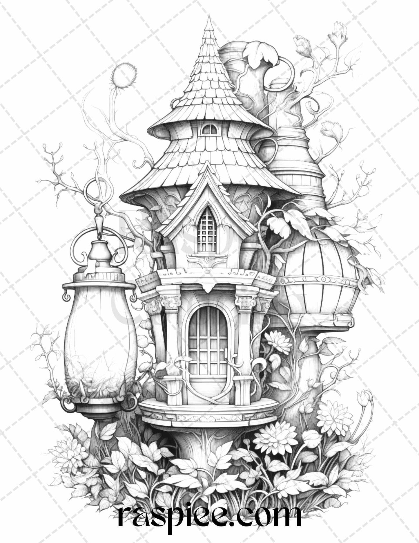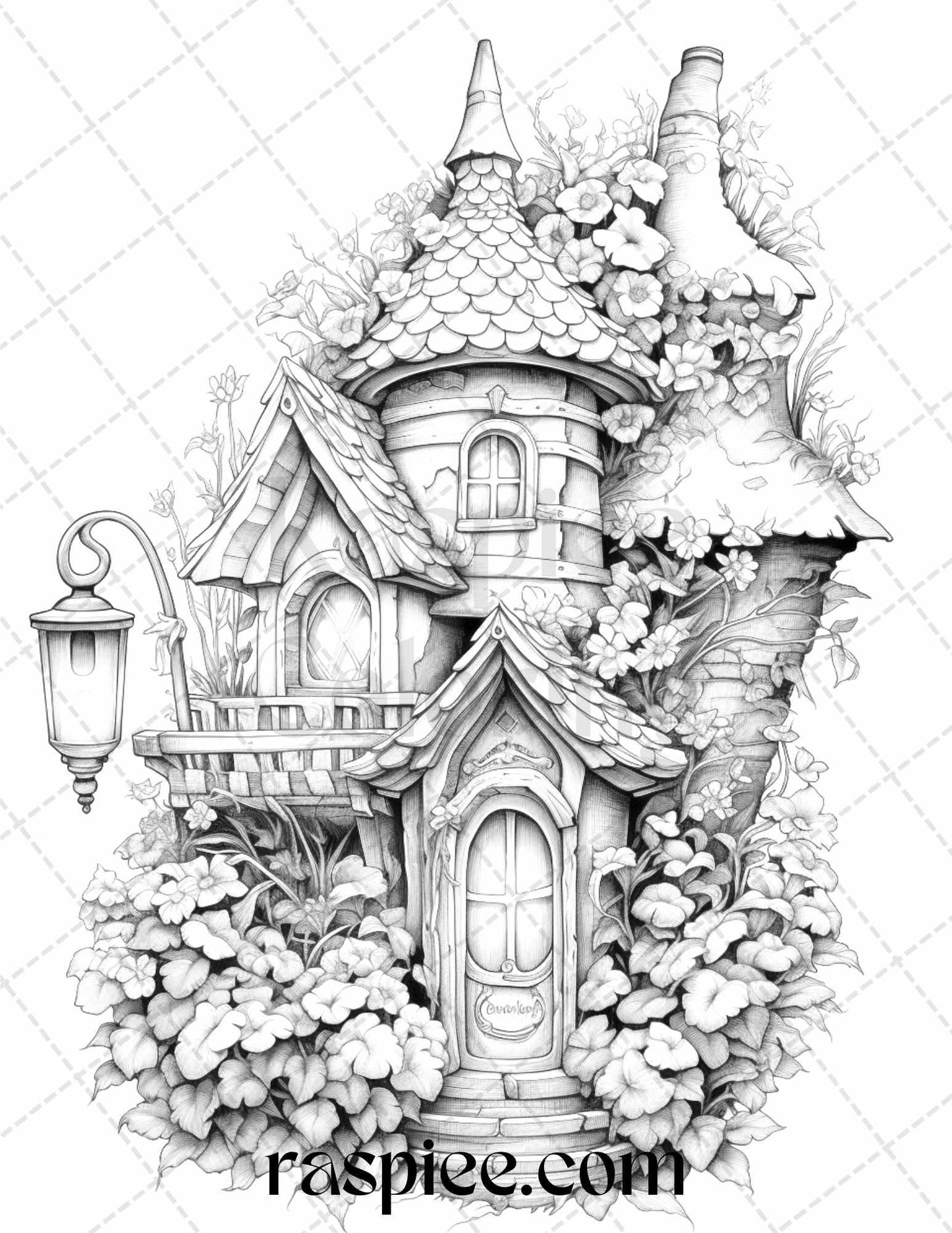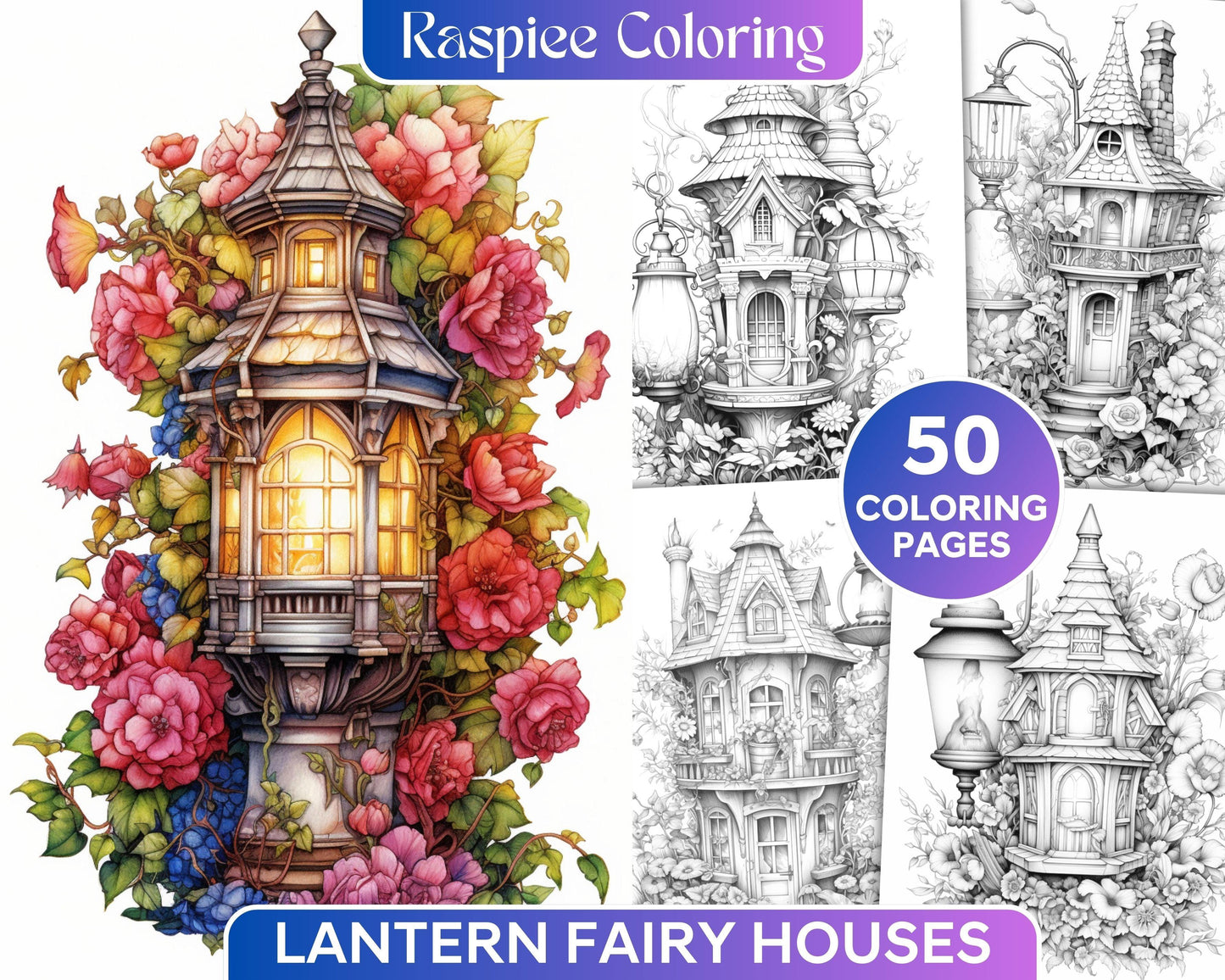 50 Lantern Fairy Houses Grayscale Coloring Pages Printable for Adults, PDF File Instant Download