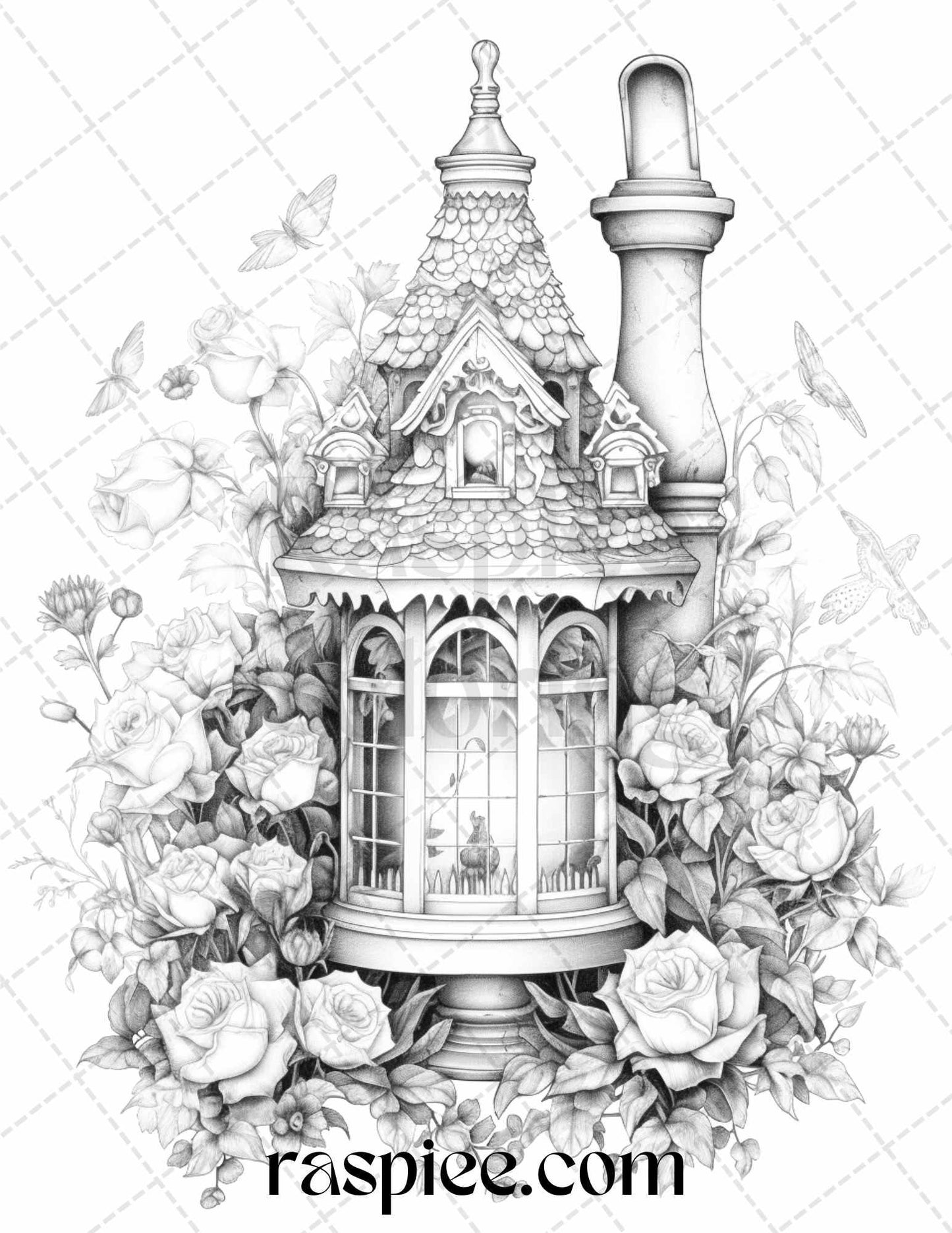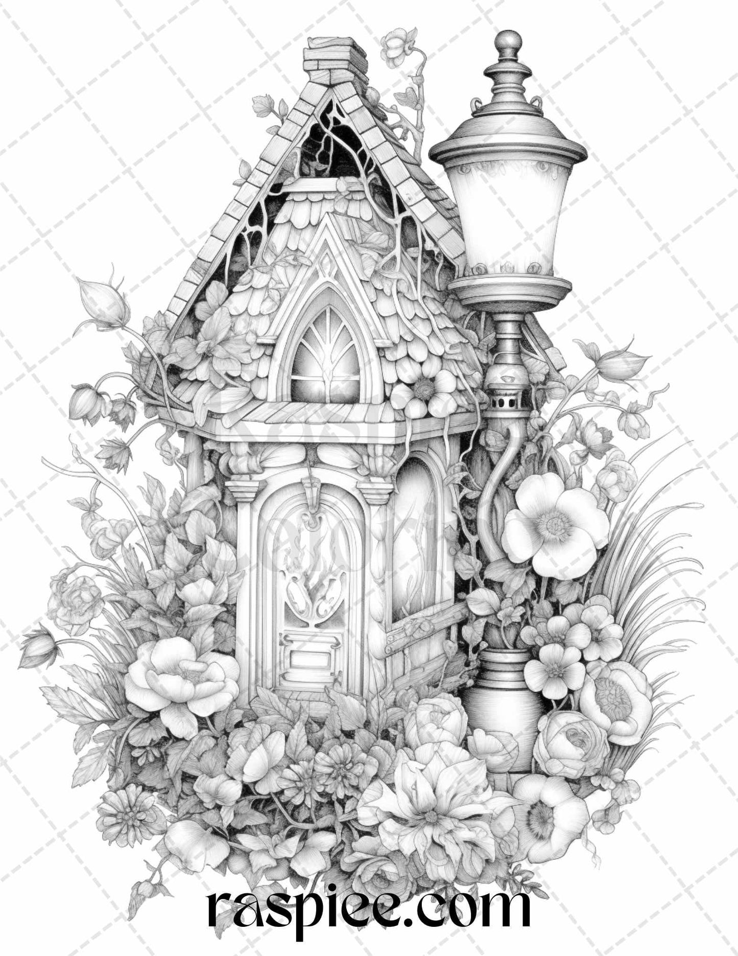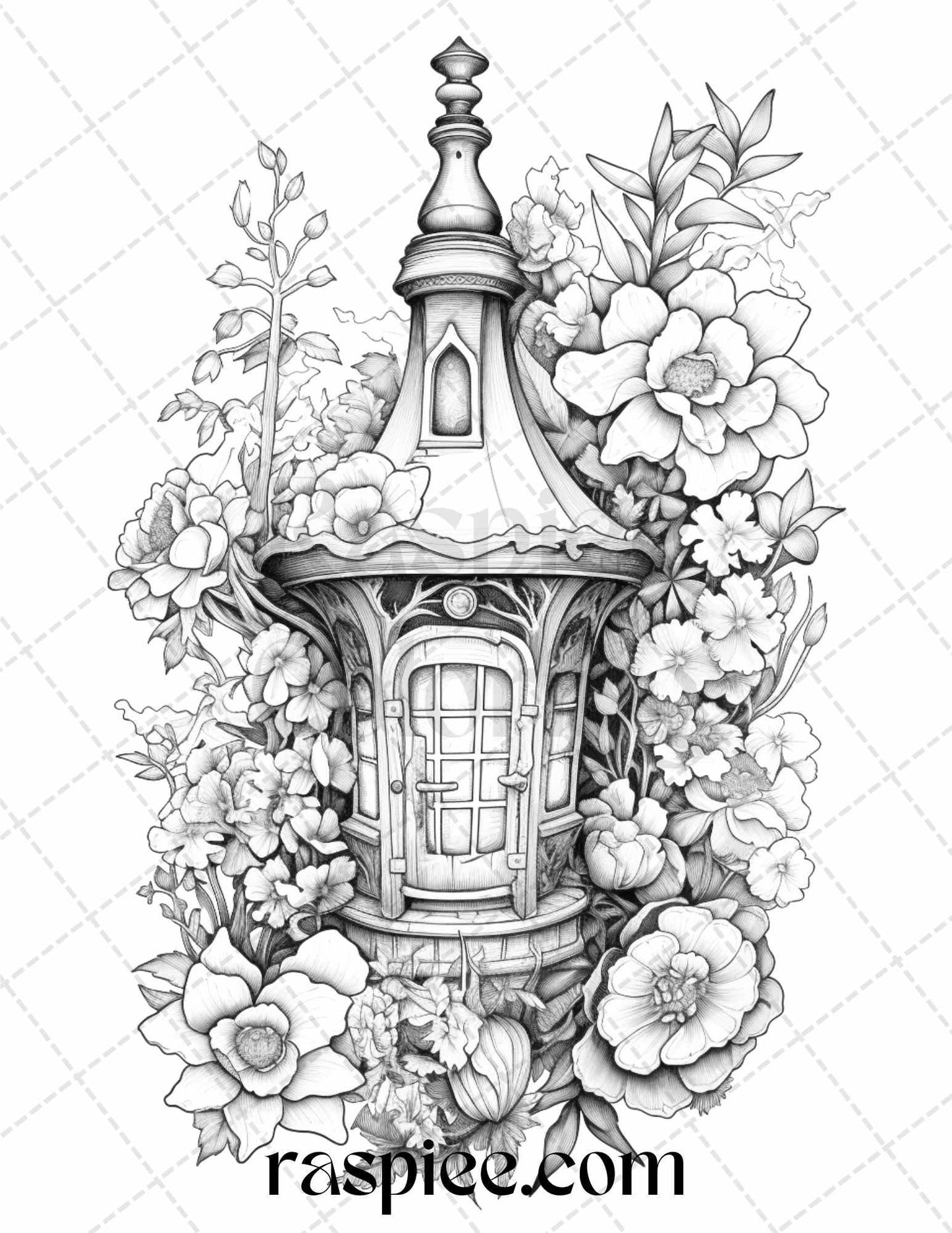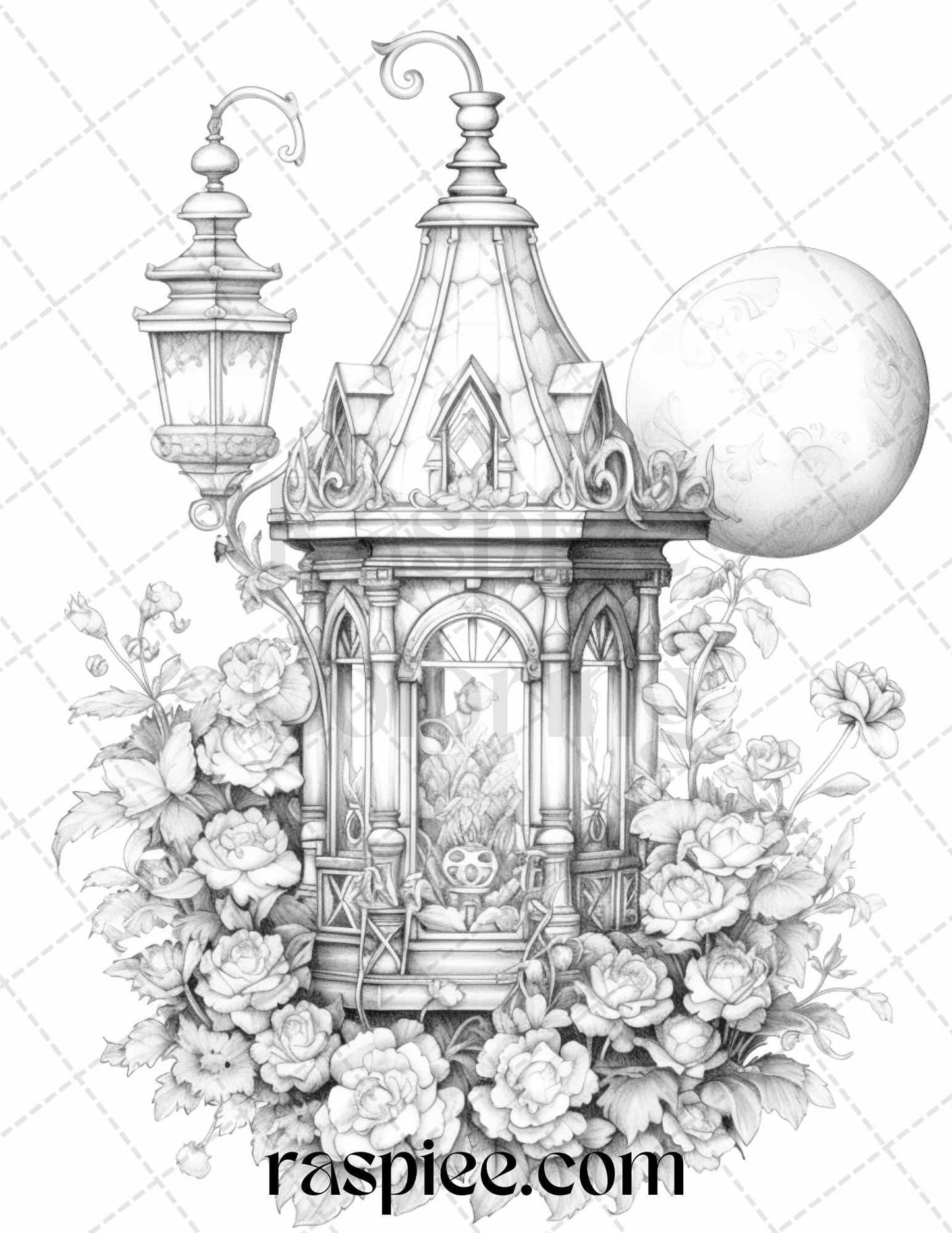 50 Lantern Fairy Houses Grayscale Coloring Pages Printable for Adults, PDF File Instant Download