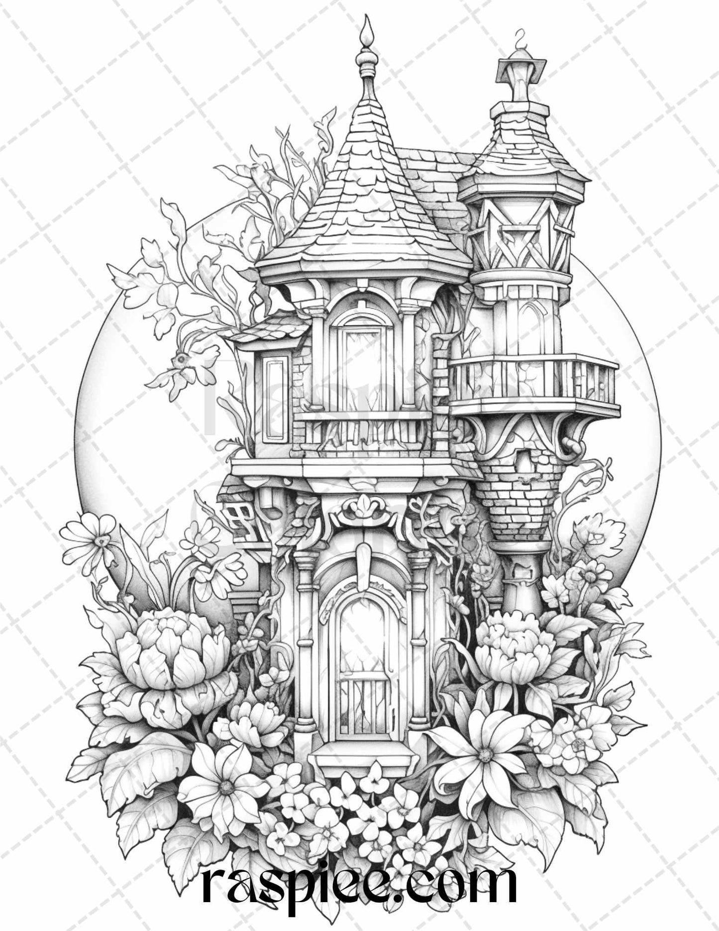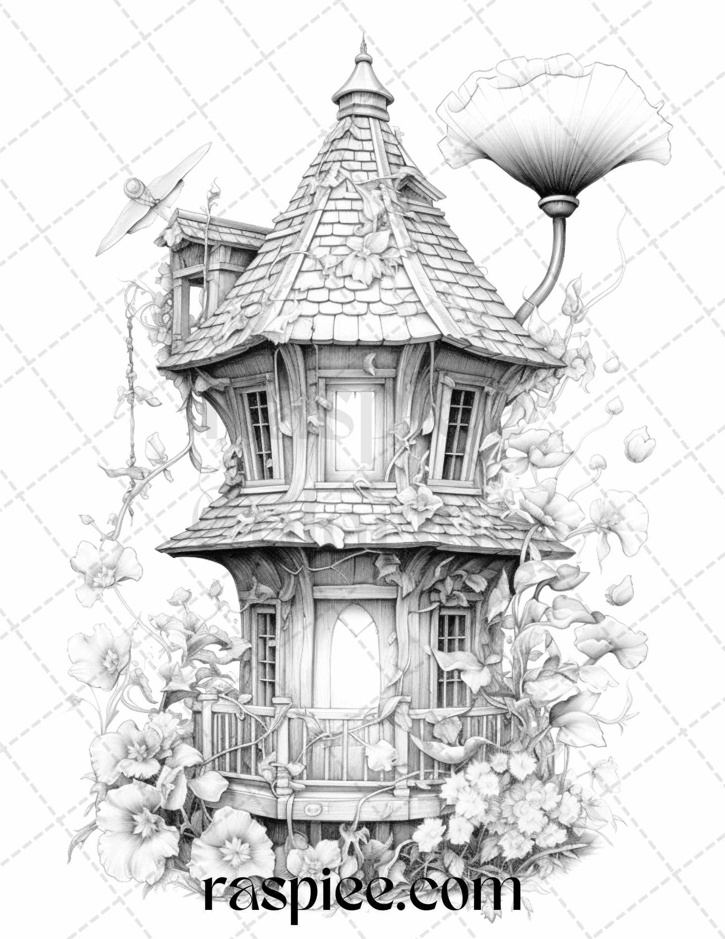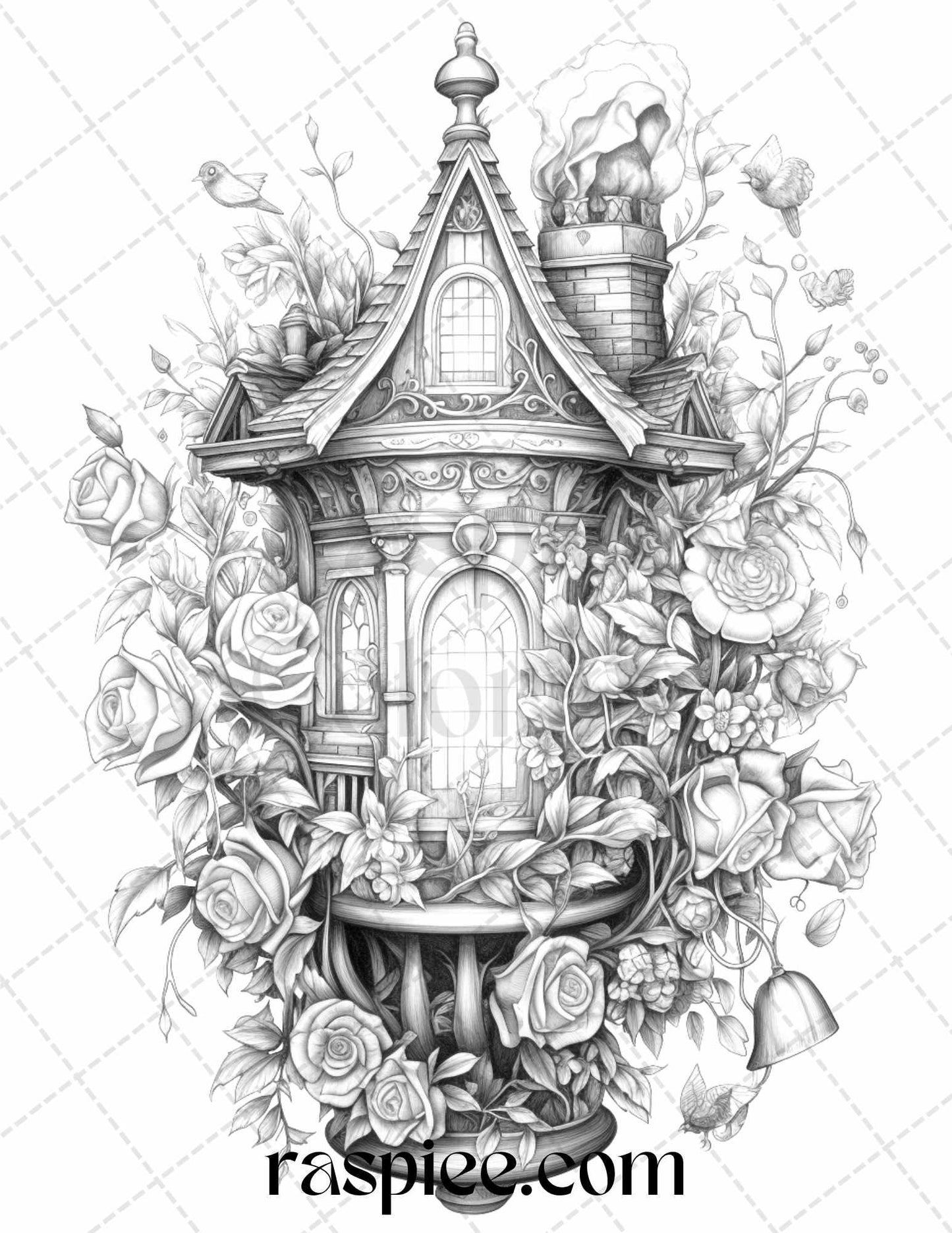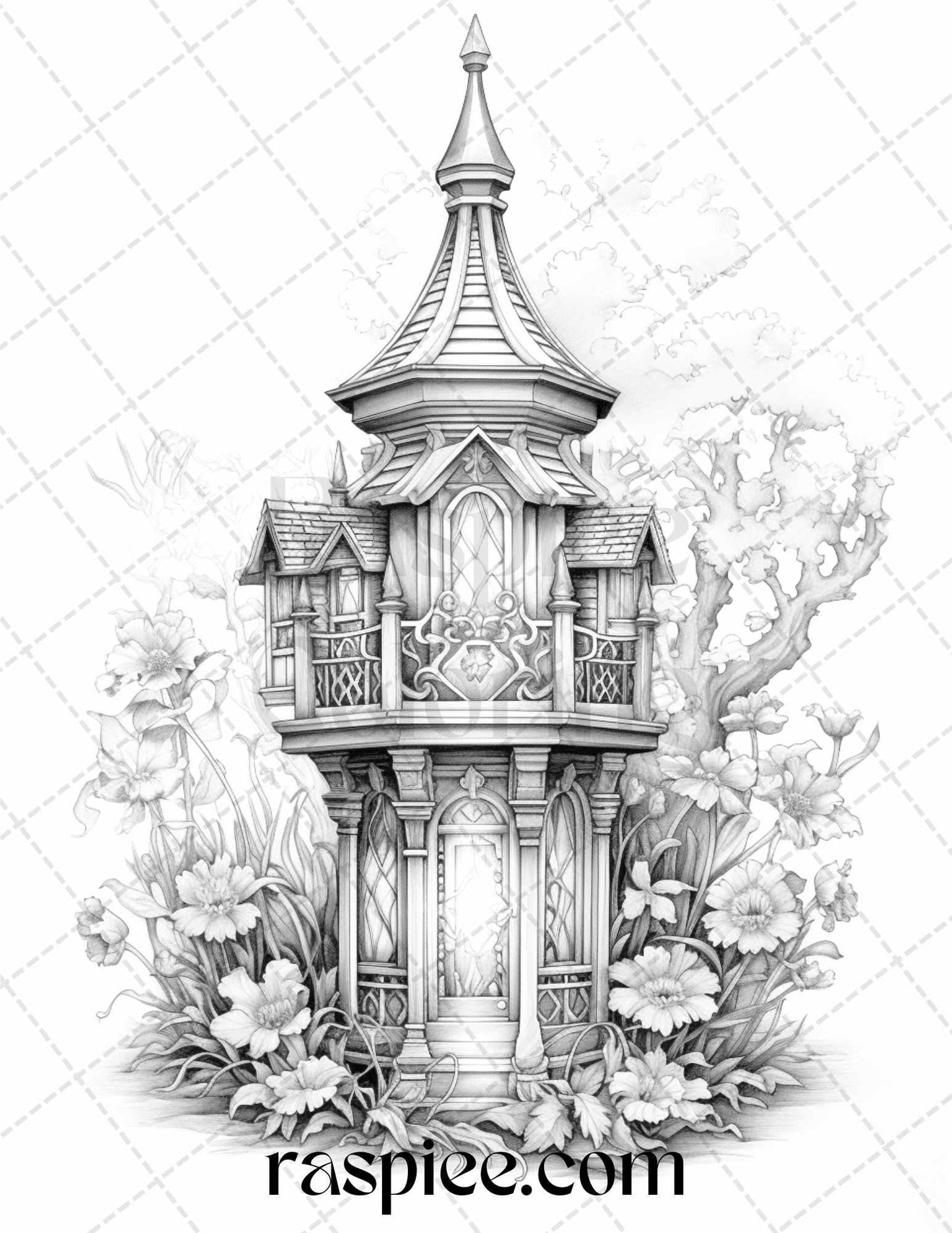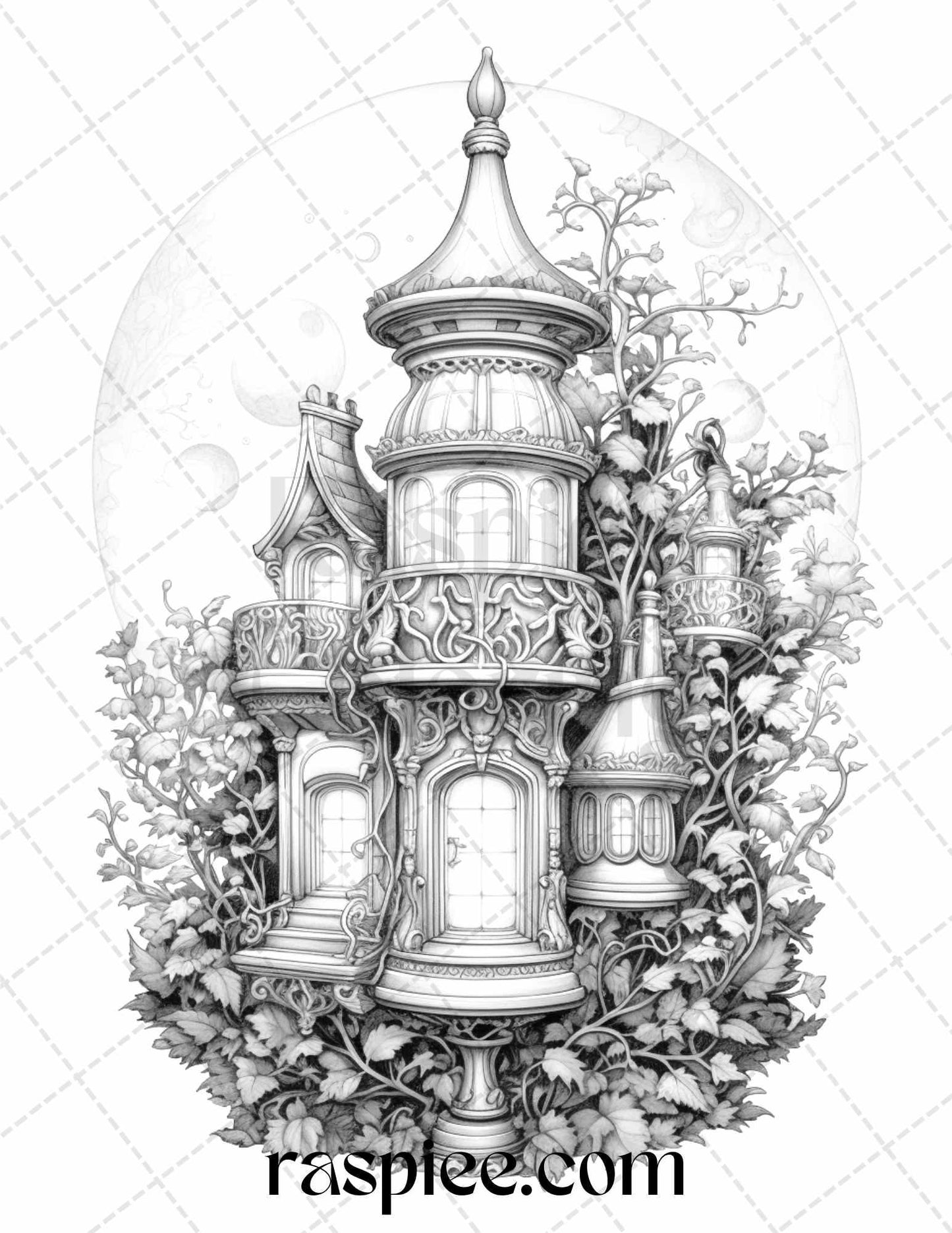 50 Lantern Fairy Houses Grayscale Coloring Pages Printable for Adults, PDF File Instant Download